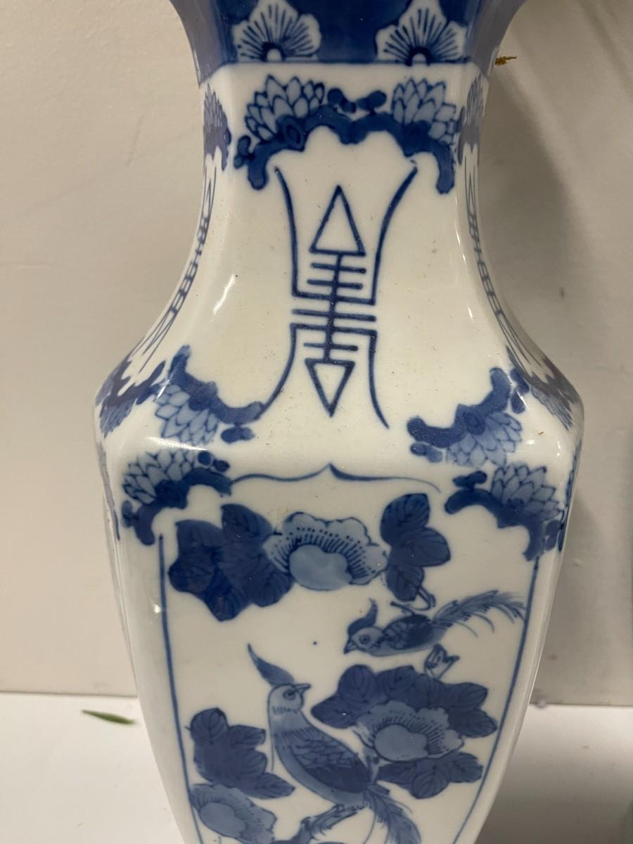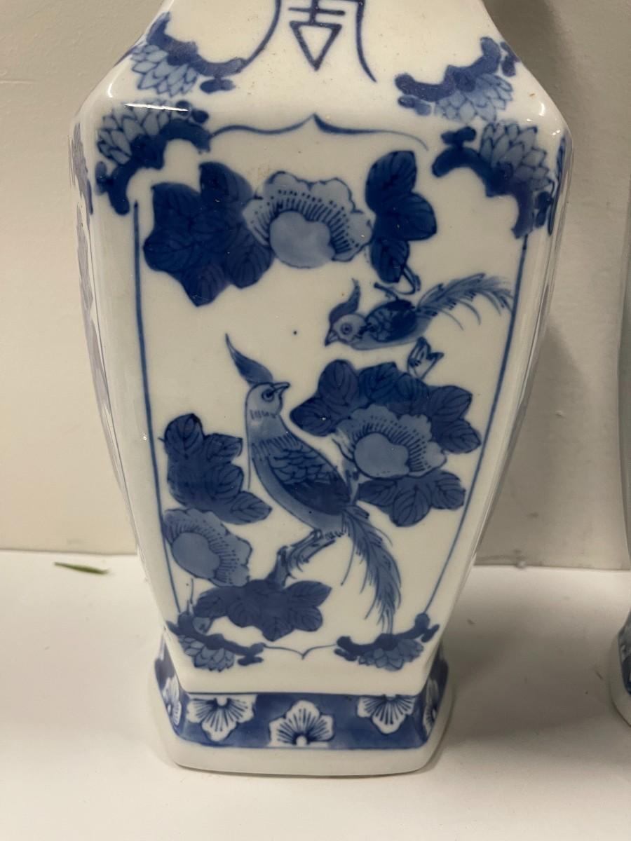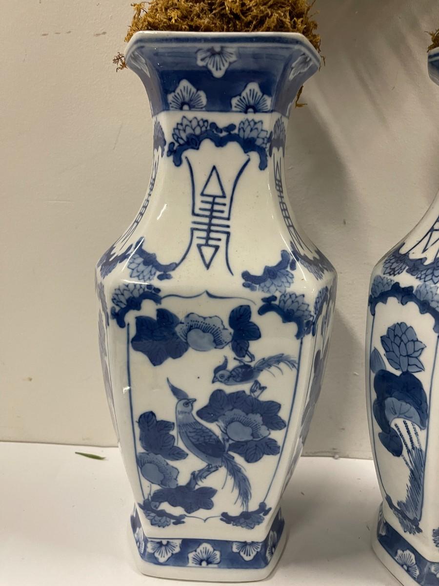 Pair of blue and white Chinese porcelain vases with artificial trees. Excellent condition. 27" high x 7" wide.