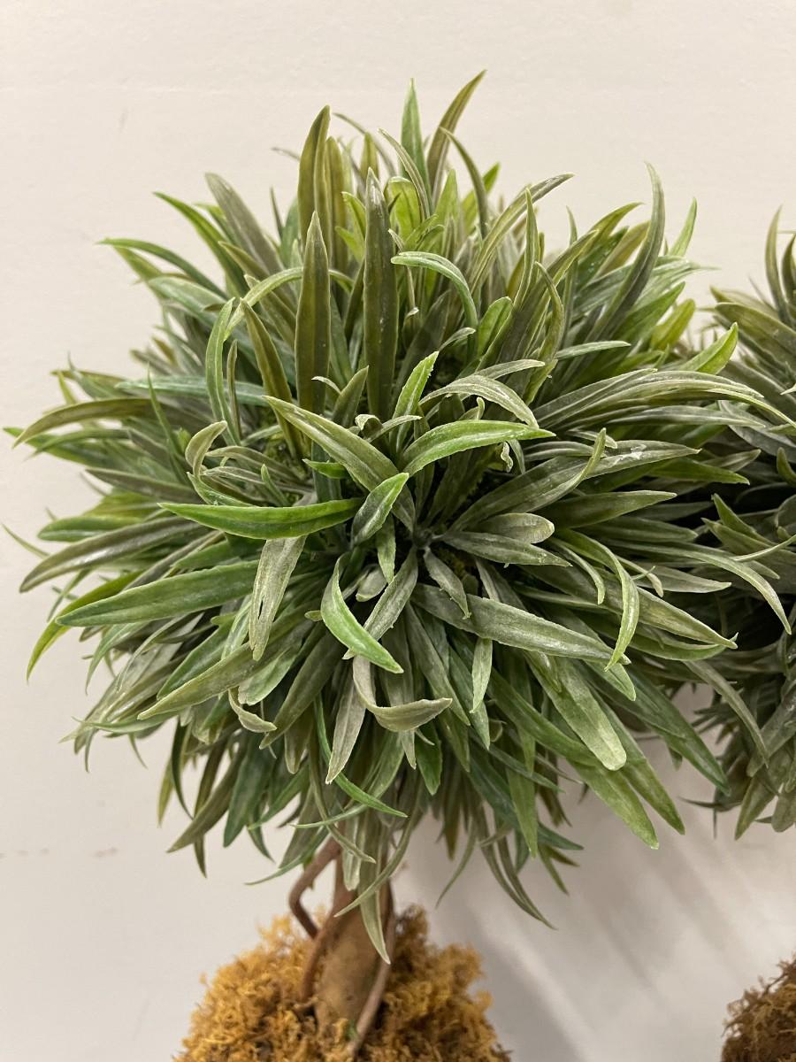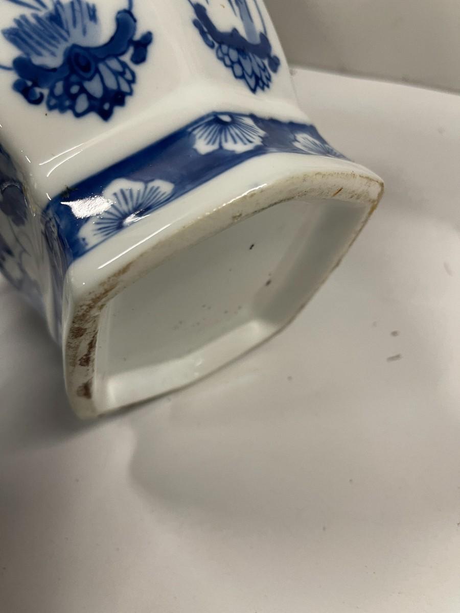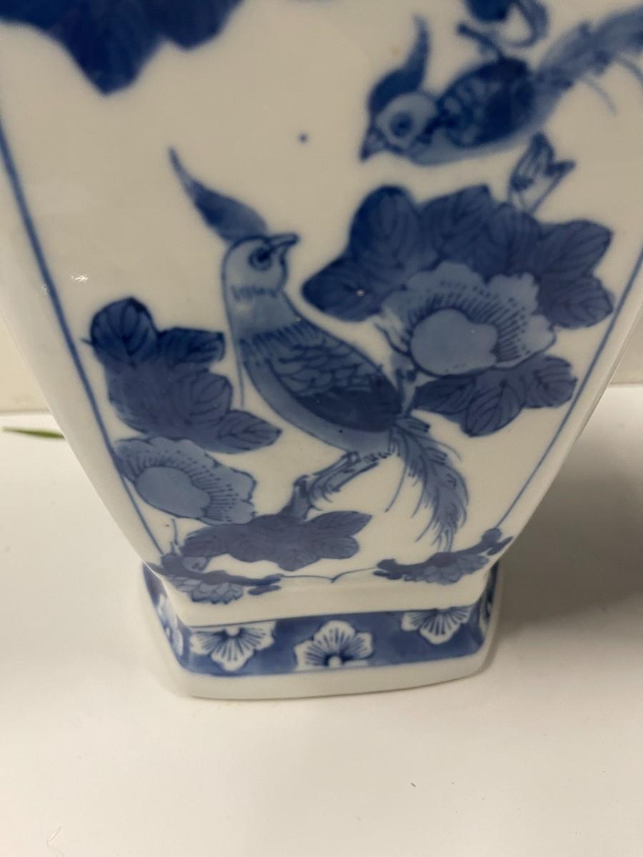 Pair of blue and white Chinese porcelain vases with artificial trees. Excellent condition. 27" high x 7" wide.