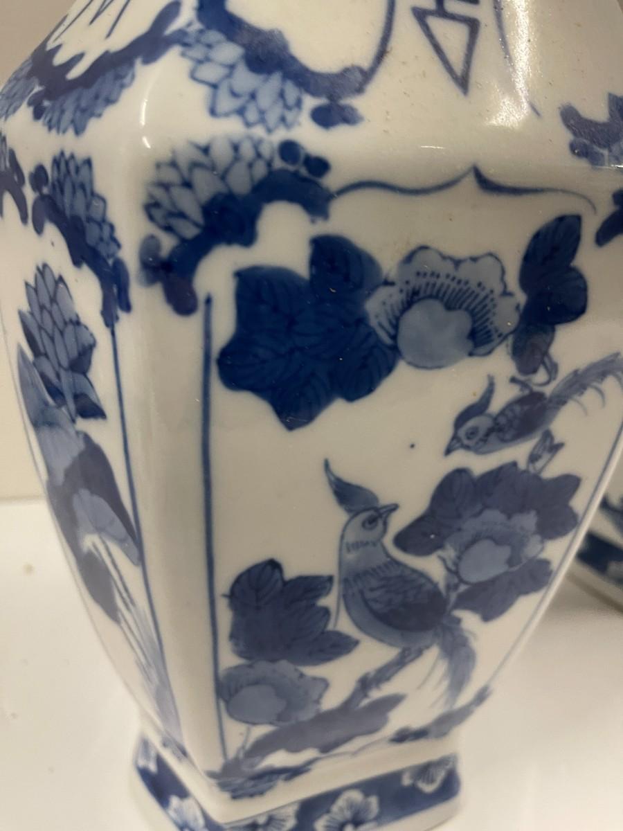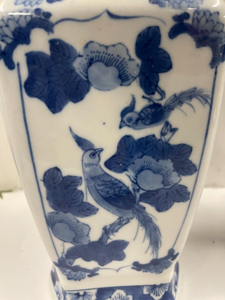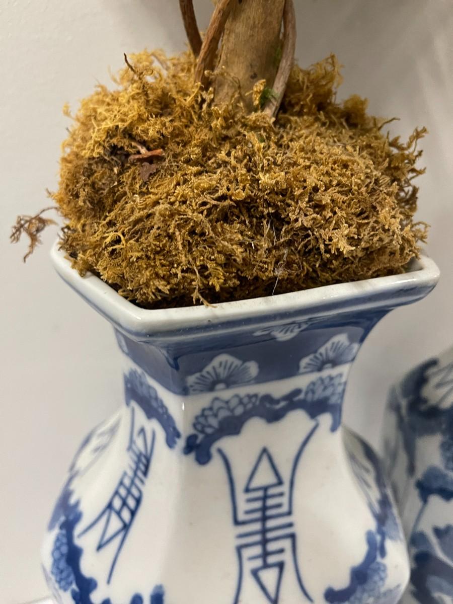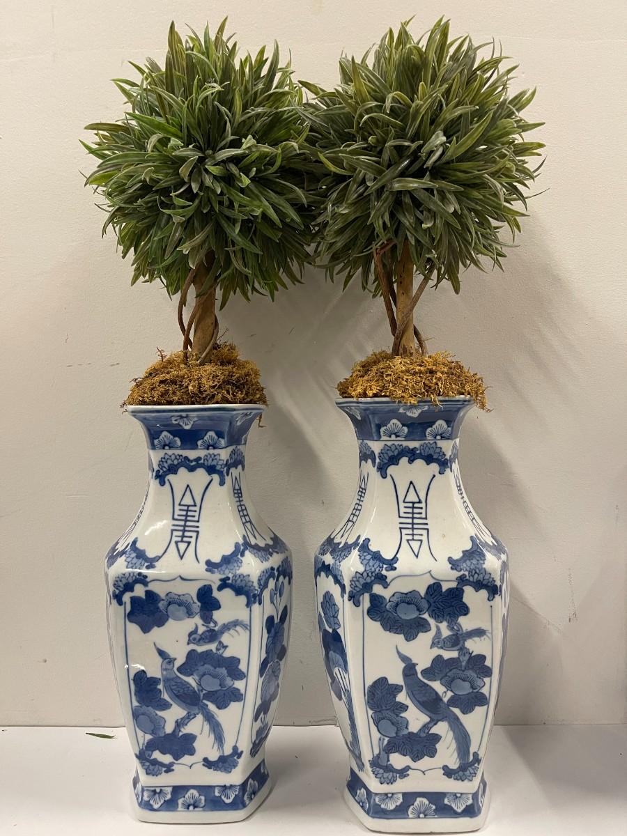 Pair of Blue & White Chinese Porcelain vases with Aritifical Trees