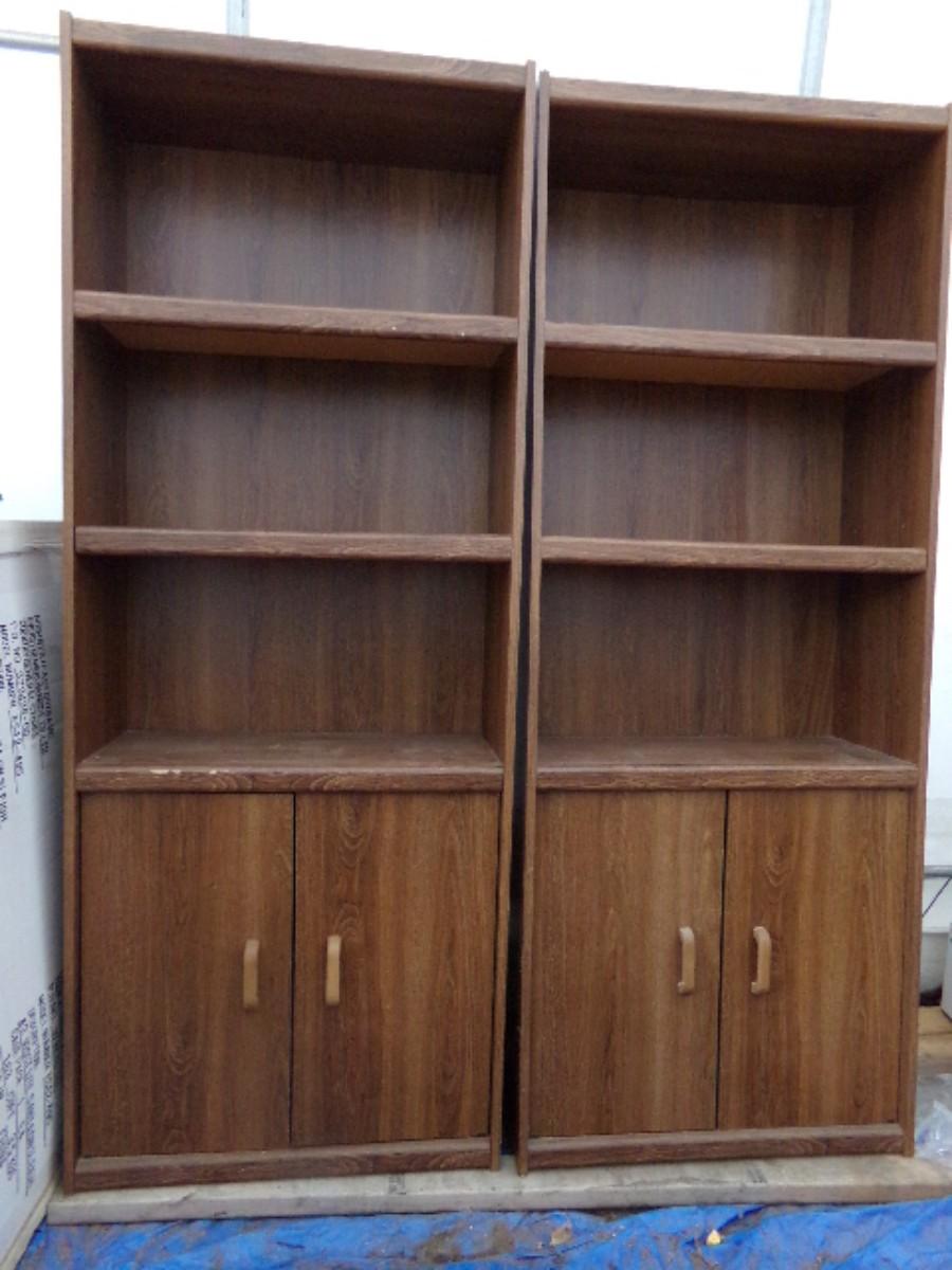 A pair of book cases. ALSO make good garage/basement storage shelves Both the same, storage in bottom with doors and 1 shelf. Each one is about 71" tall x 28"wide x 12"deep