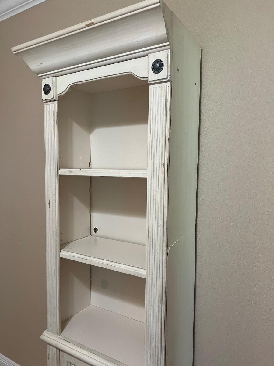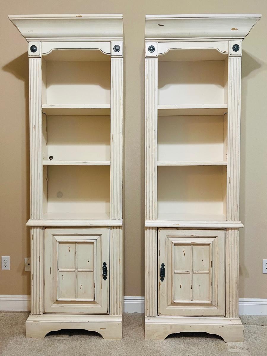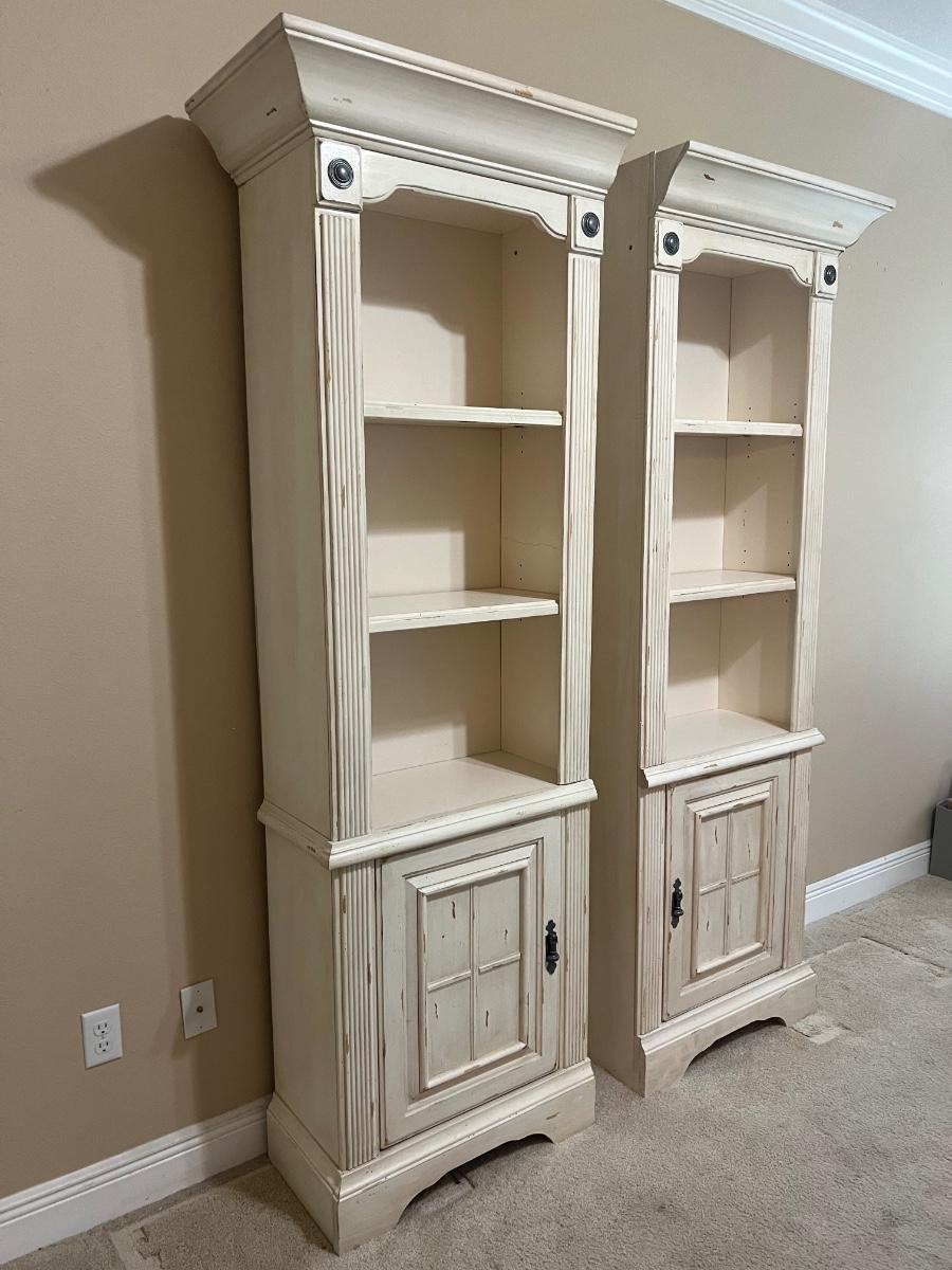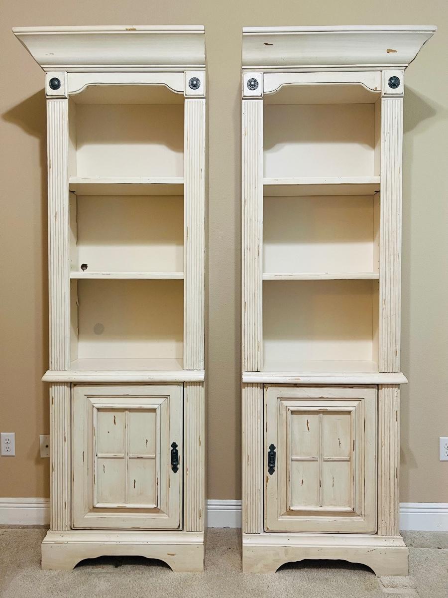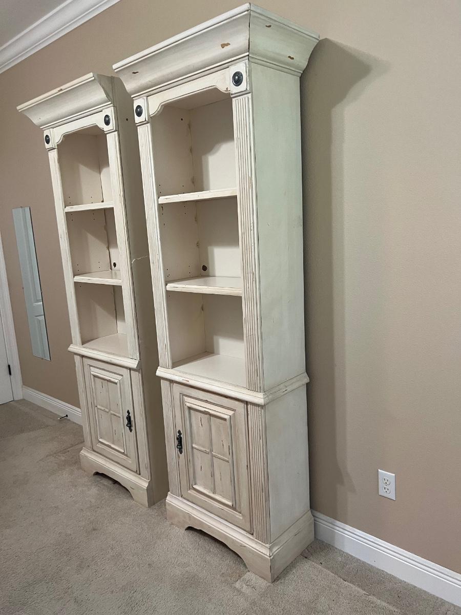 Pair of shelves. Please see all pictures as there is some damage that is pictured. The backing is coming off in 1 spot. 1 unit has a crack on the side that has been repaired. These units are solid. Each measures 26”W x 13”D x 84”T.