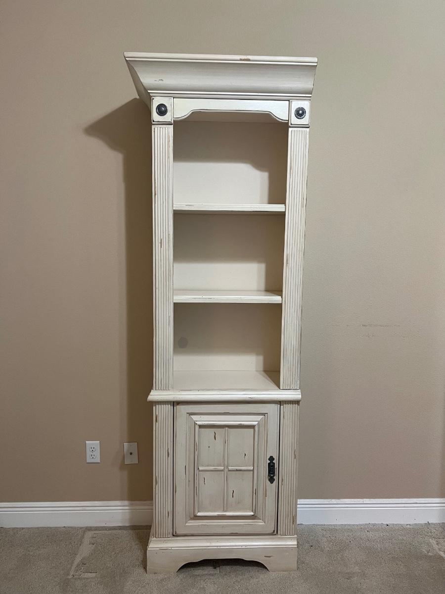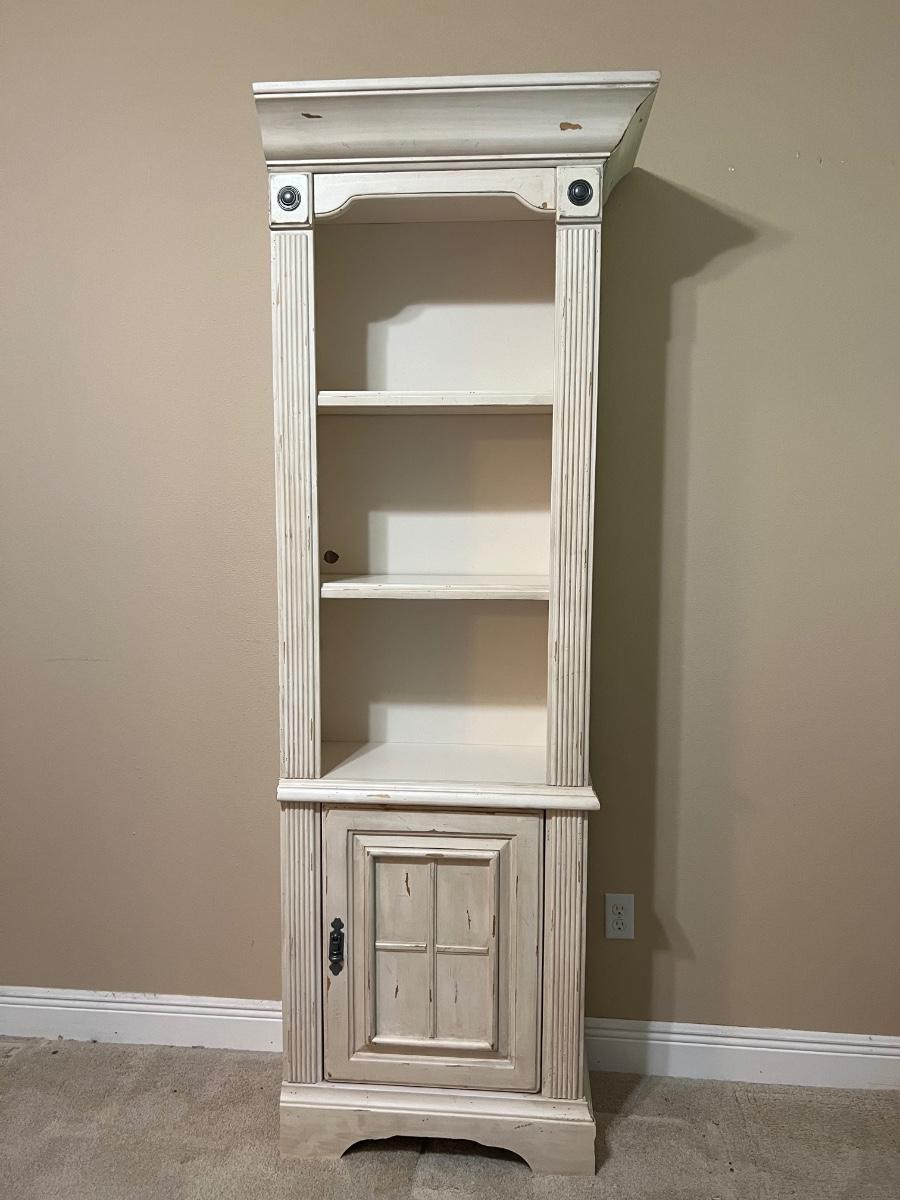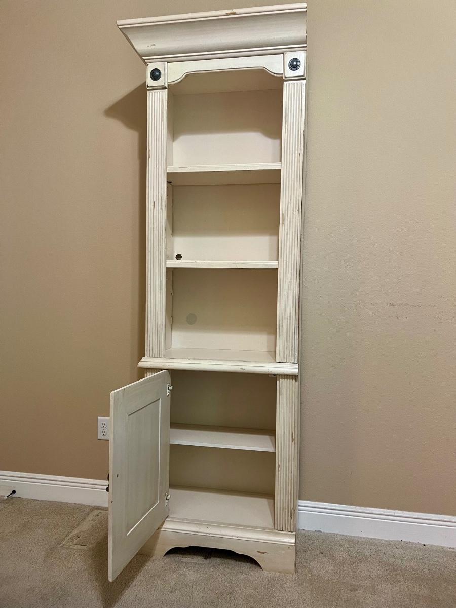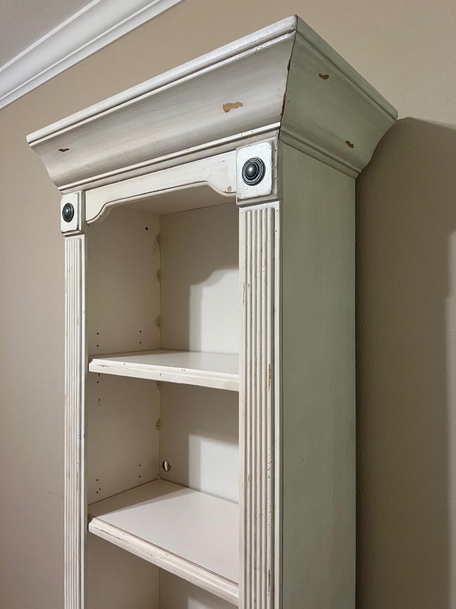 Pair of shelves. Please see all pictures as there is some damage that is pictured. The backing is coming off in 1 spot. 1 unit has a crack on the side that has been repaired. These units are solid. Each measures 26”W x 13”D x 84”T.