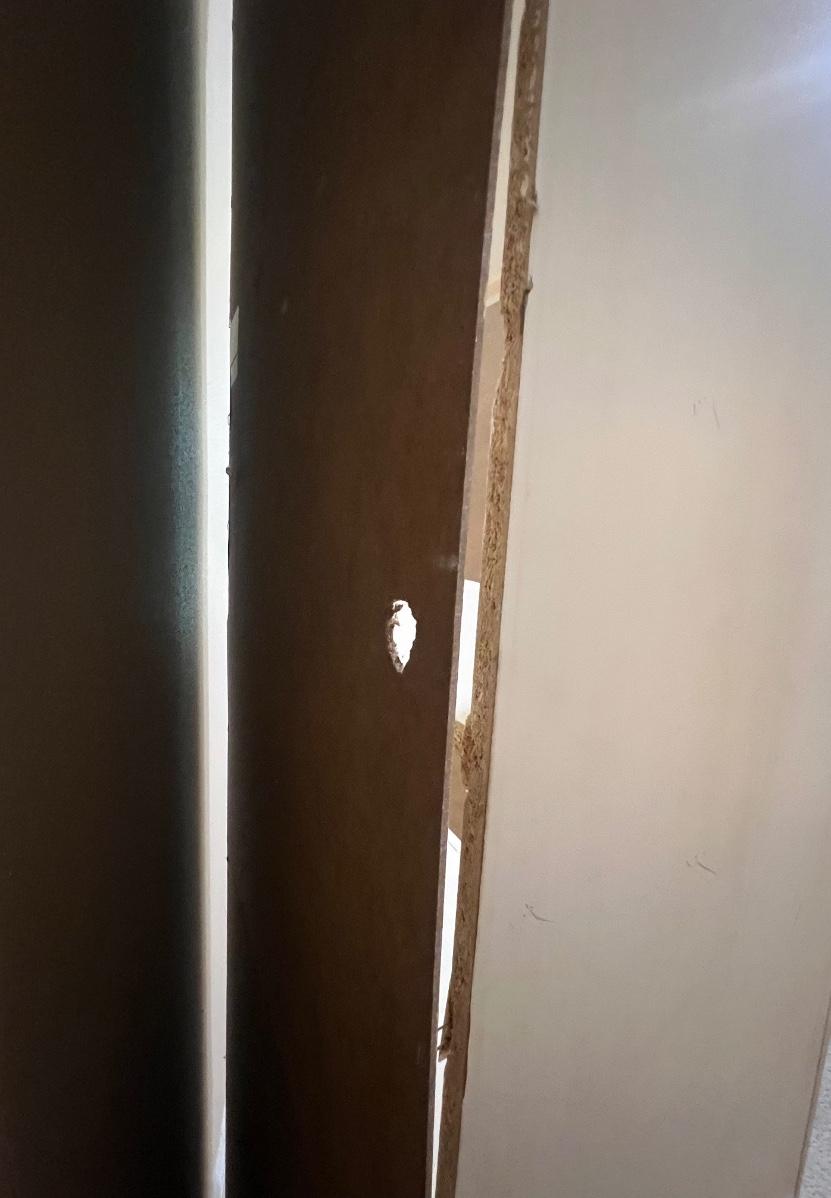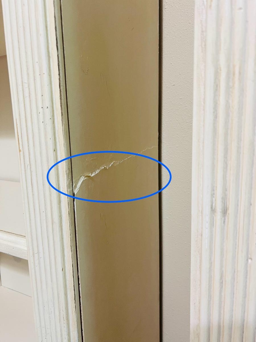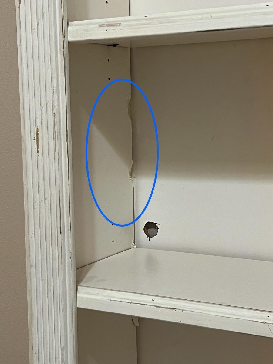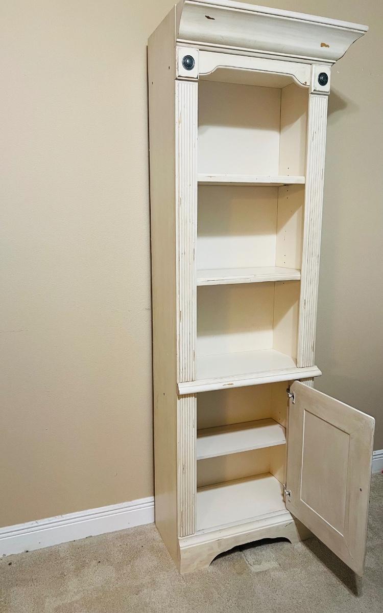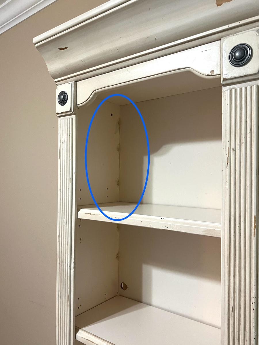 Pair of shelves. Please see all pictures as there is some damage that is pictured. The backing is coming off in 1 spot. 1 unit has a crack on the side that has been repaired. These units are solid. Each measures 26”W x 13”D x 84”T.