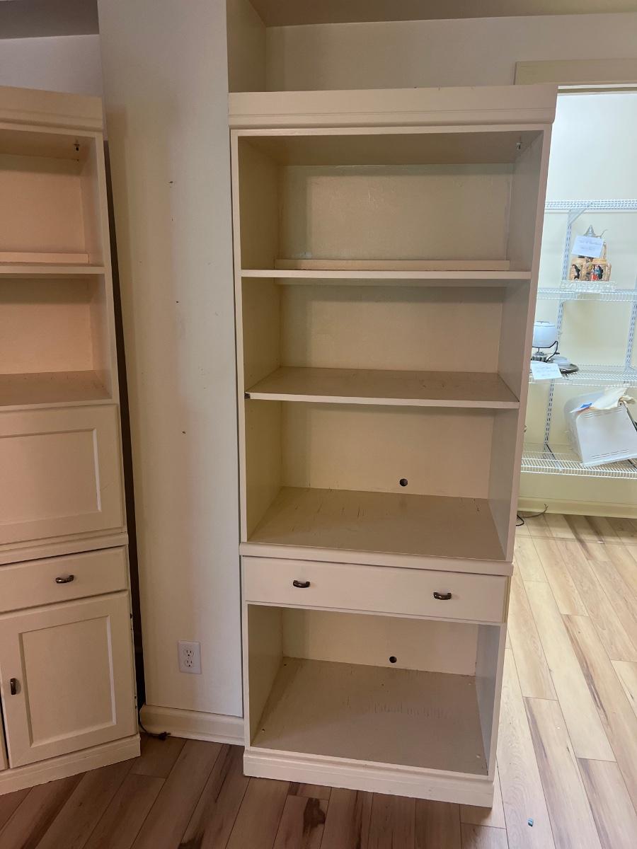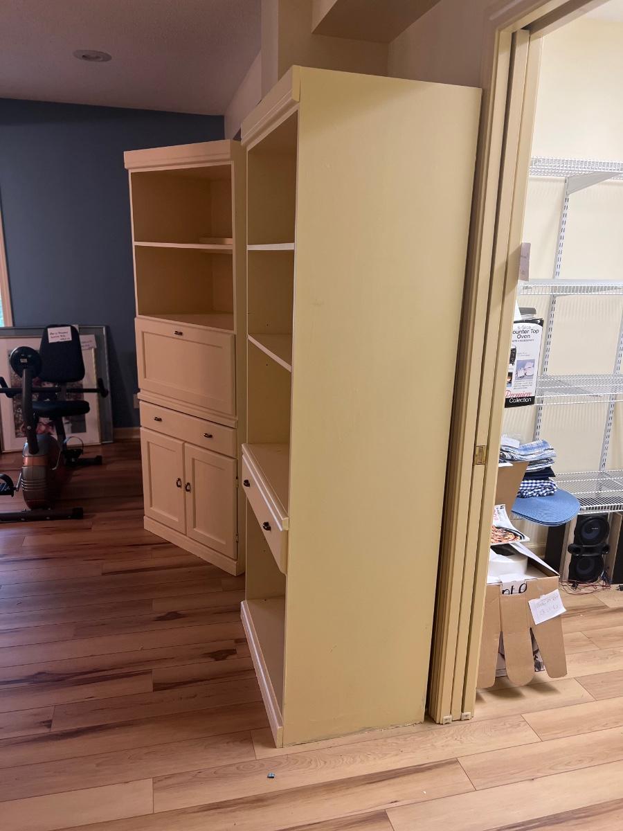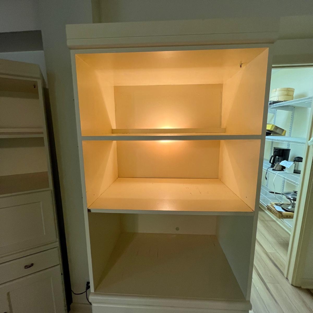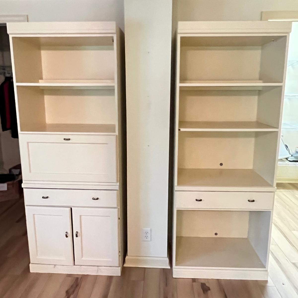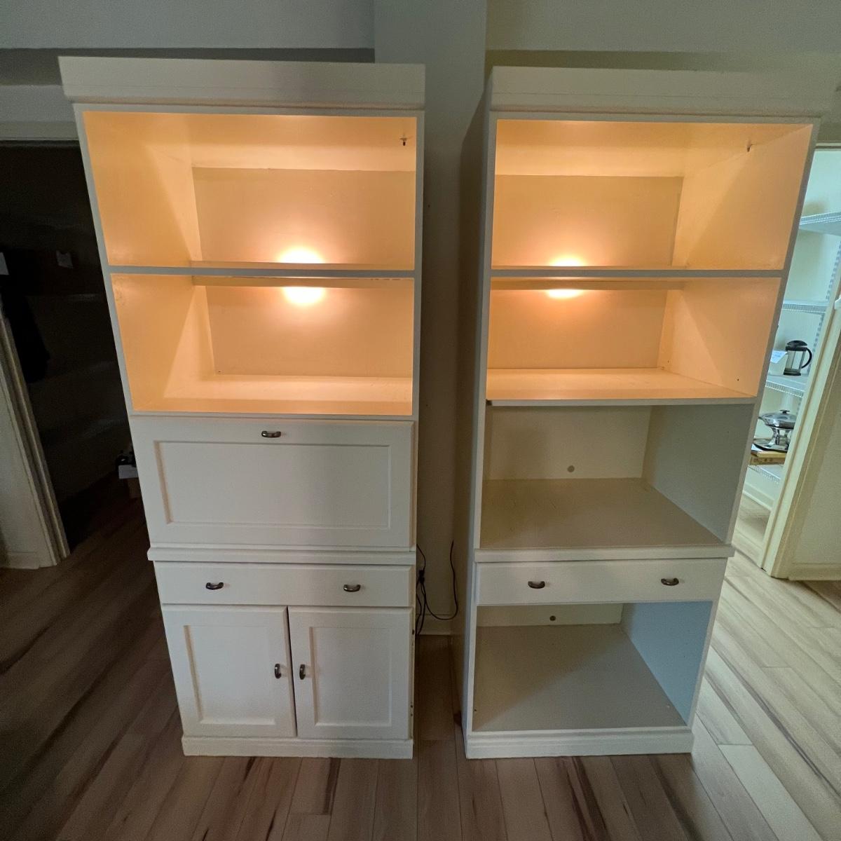 These two bookcases appear to be the same brand, although no labels found. They are painted cream over pressed wood and both have built in lights behind a plate rail. One has a built in desk. Both have holes cut through the back to run cables. Hardware is a brass colored metal.