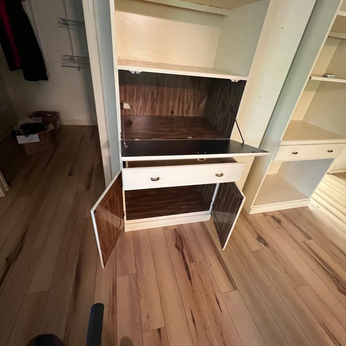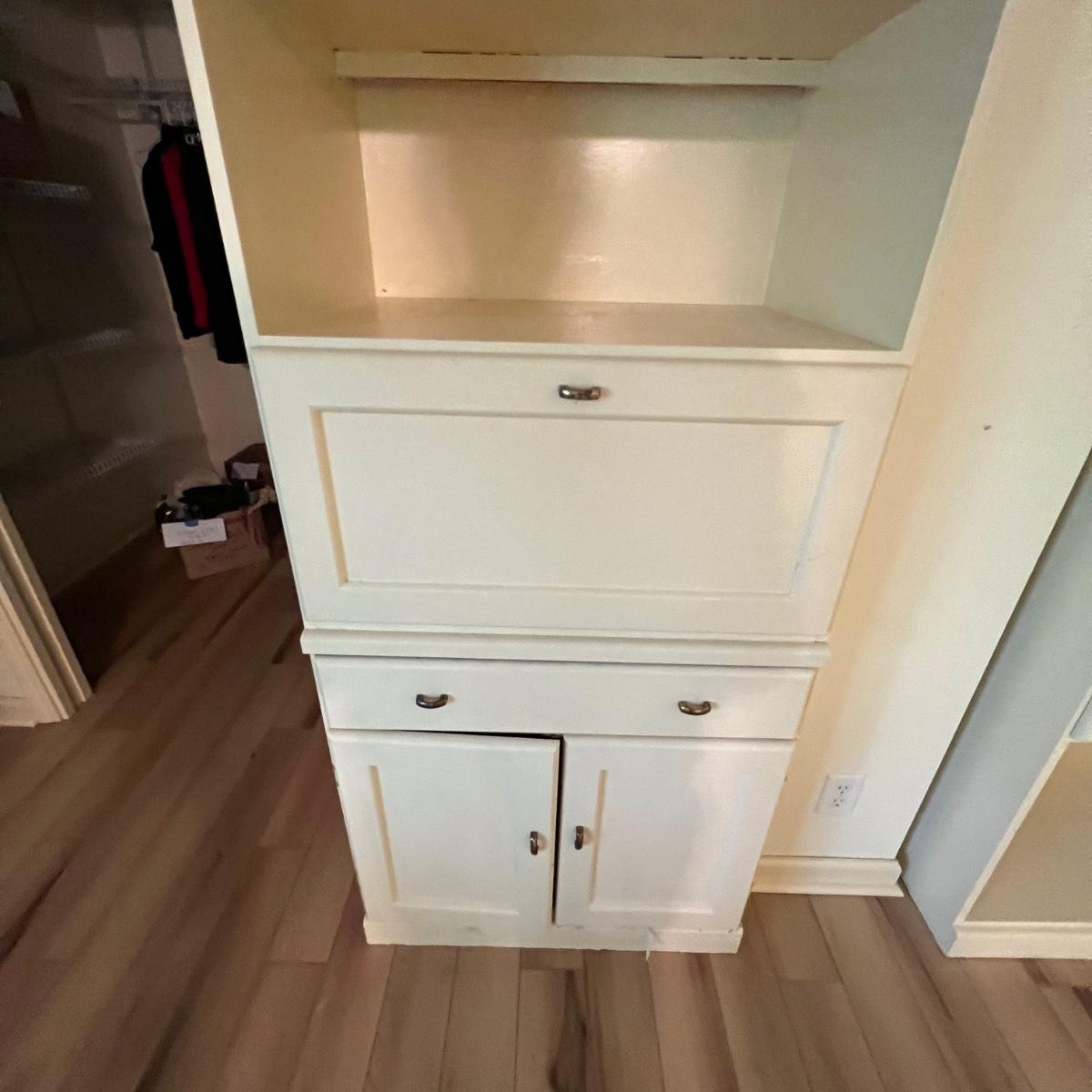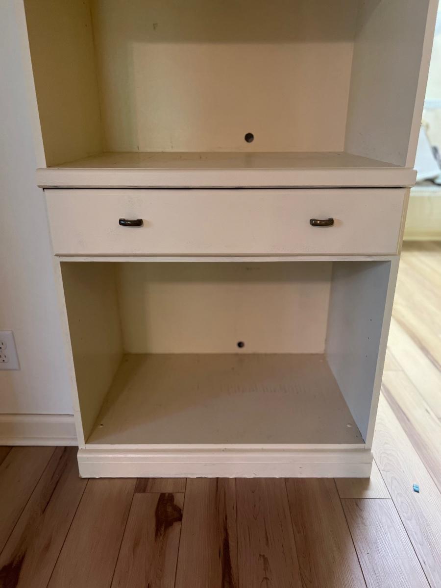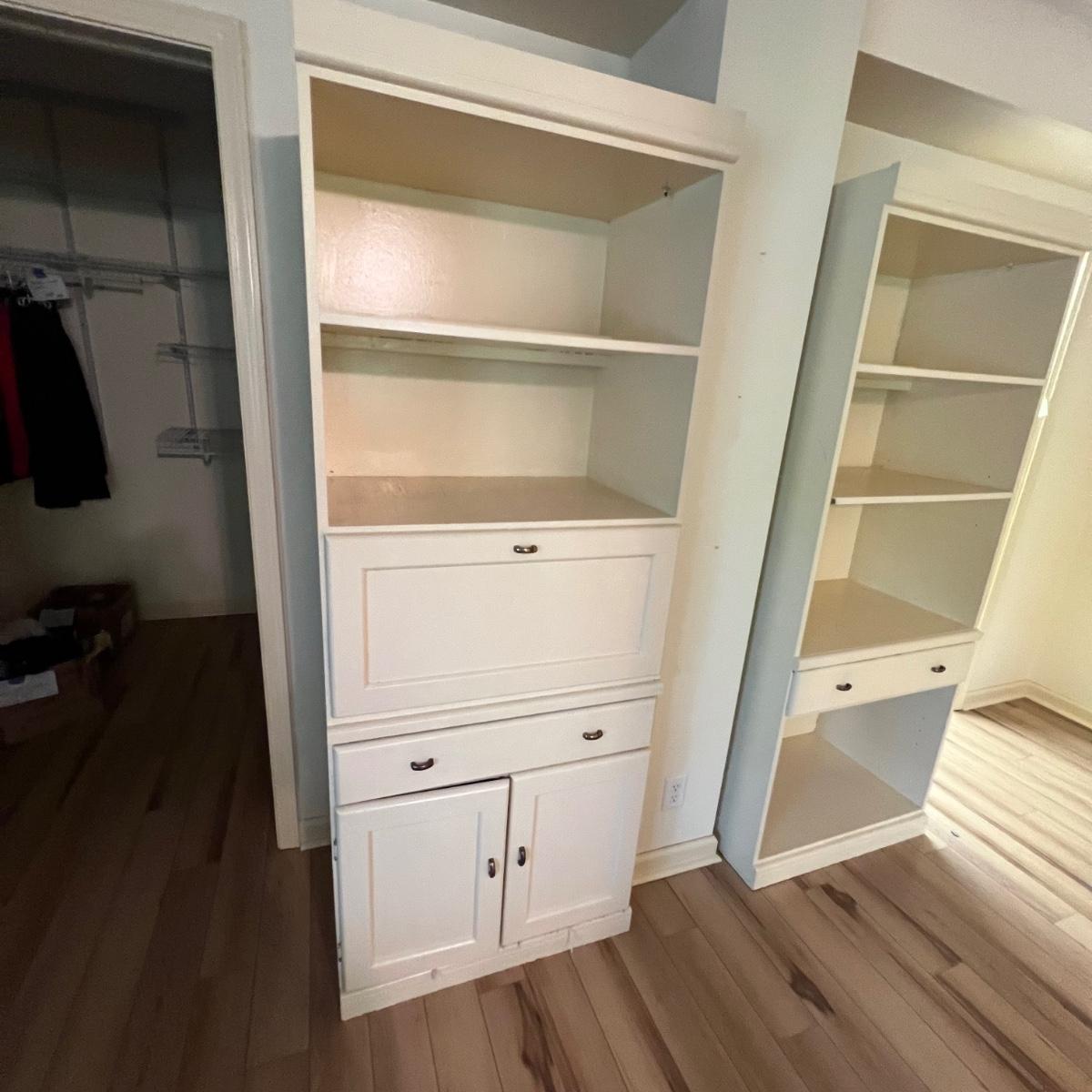 These two bookcases appear to be the same brand, although no labels found. They are painted cream over pressed wood and both have built in lights behind a plate rail. One has a built in desk. Both have holes cut through the back to run cables. Hardware is a brass colored metal.