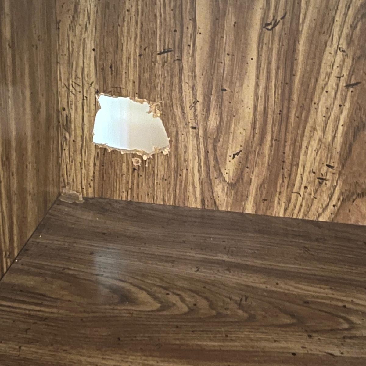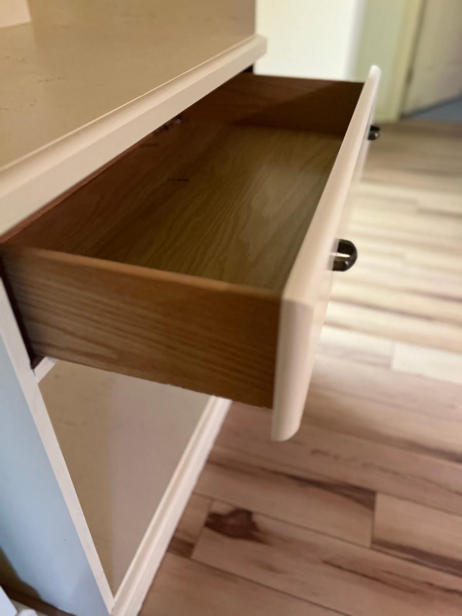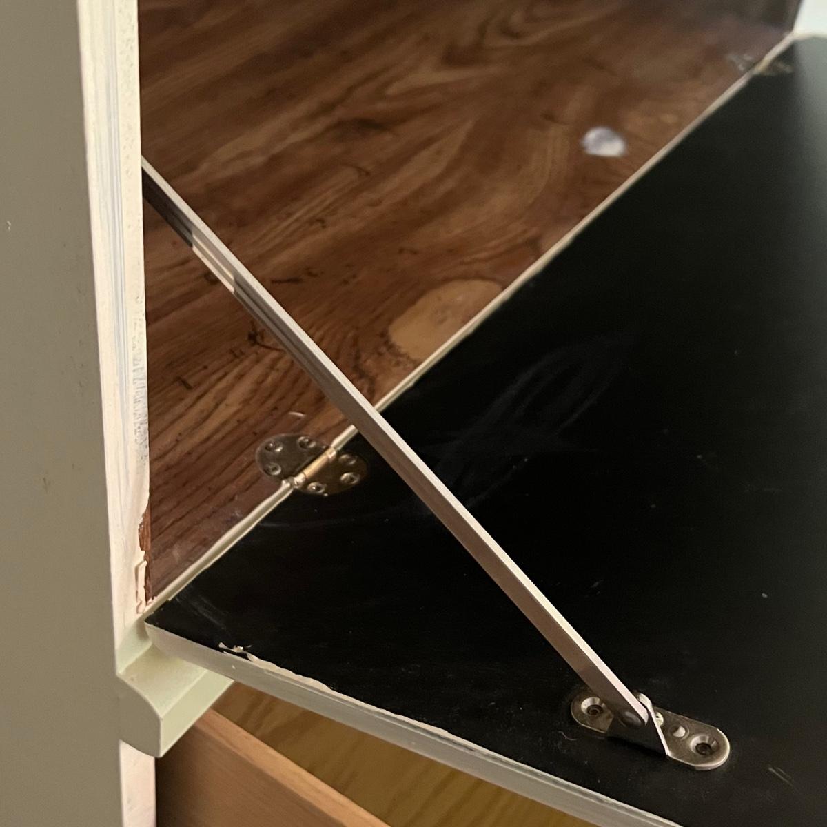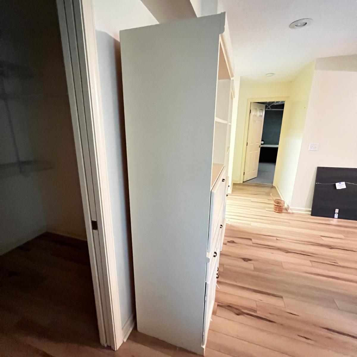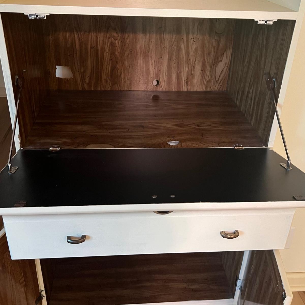 These two bookcases appear to be the same brand, although no labels found. They are painted cream over pressed wood and both have built in lights behind a plate rail. One has a built in desk. Both have holes cut through the back to run cables. Hardware is a brass colored metal.