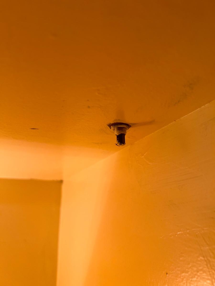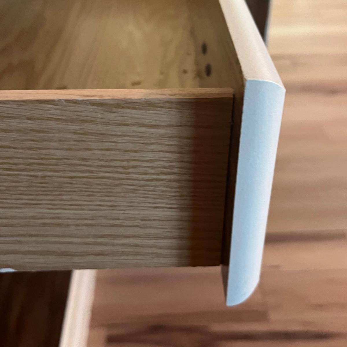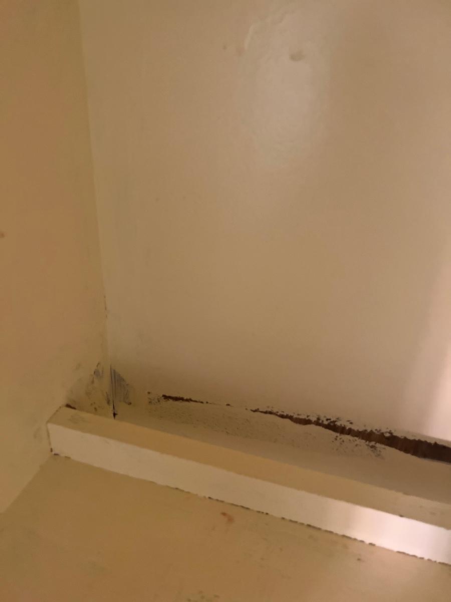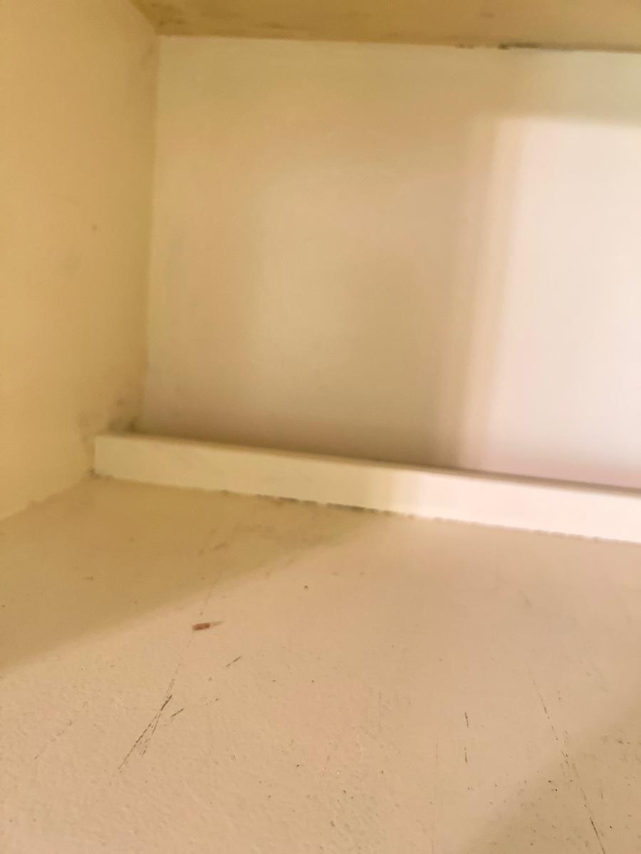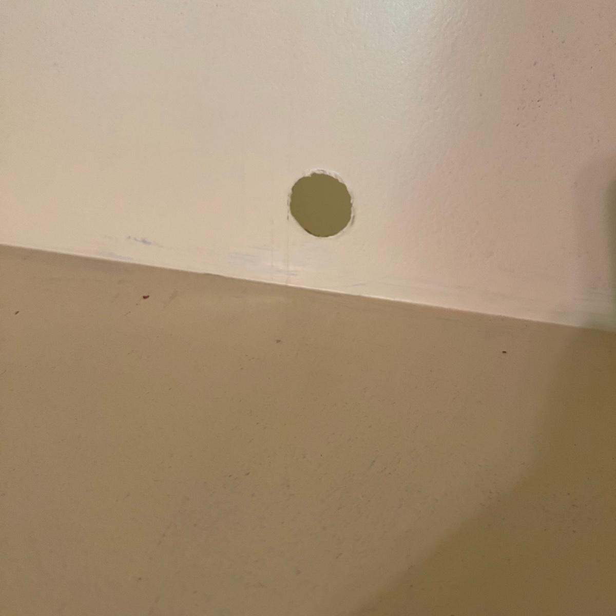 These two bookcases appear to be the same brand, although no labels found. They are painted cream over pressed wood and both have built in lights behind a plate rail. One has a built in desk. Both have holes cut through the back to run cables. Hardware is a brass colored metal.