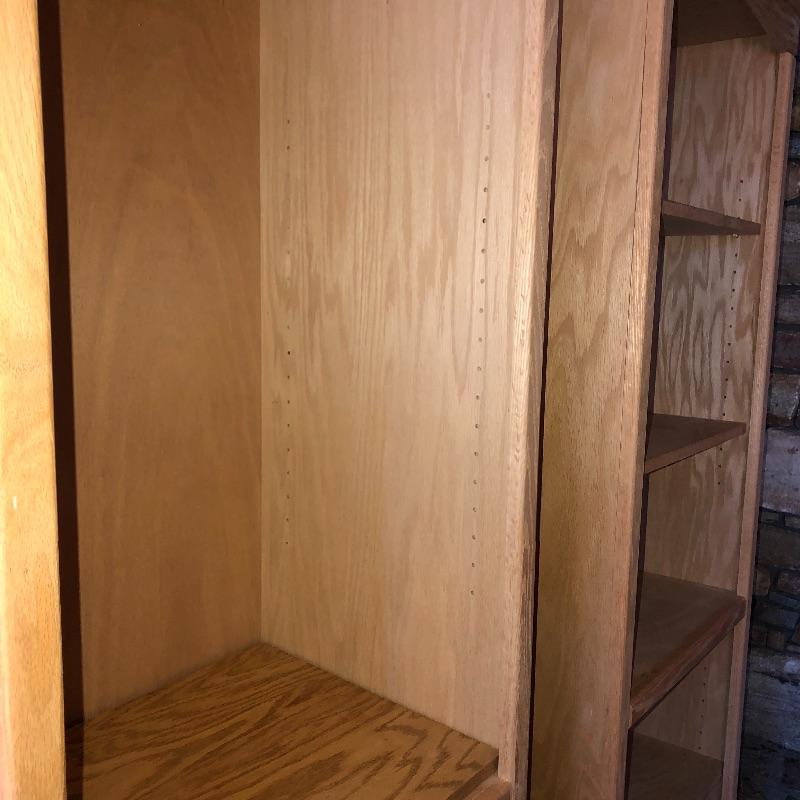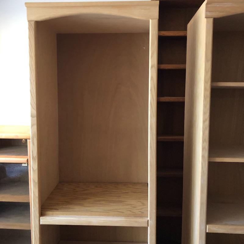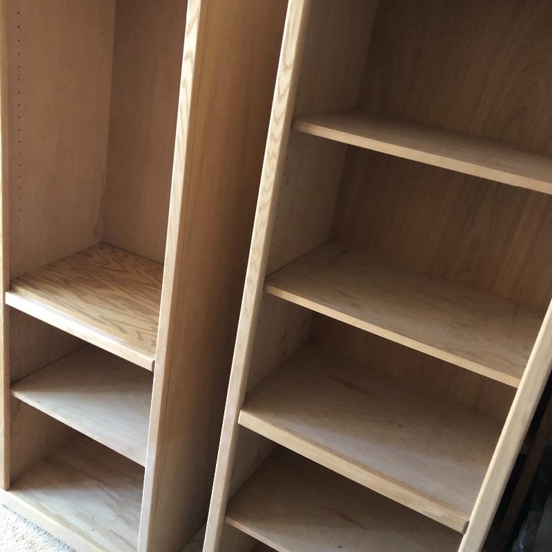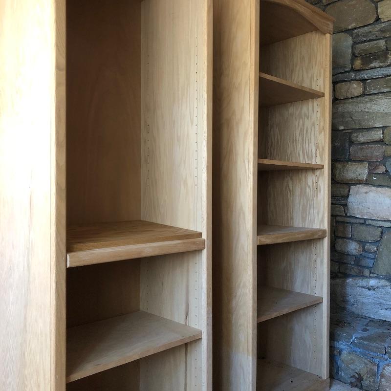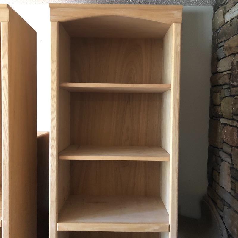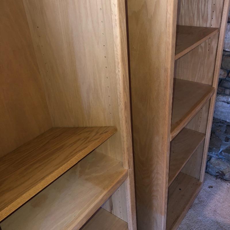 Pair of unfinished wooden bookshelves with adjustable shelving. Other shelving units in background are not included. Both bookshelves have a solid shelf near the middle that is secured. There are five adjustable shelves between both units.