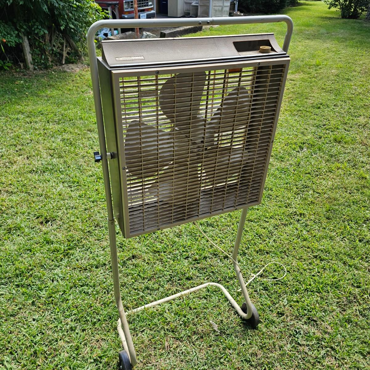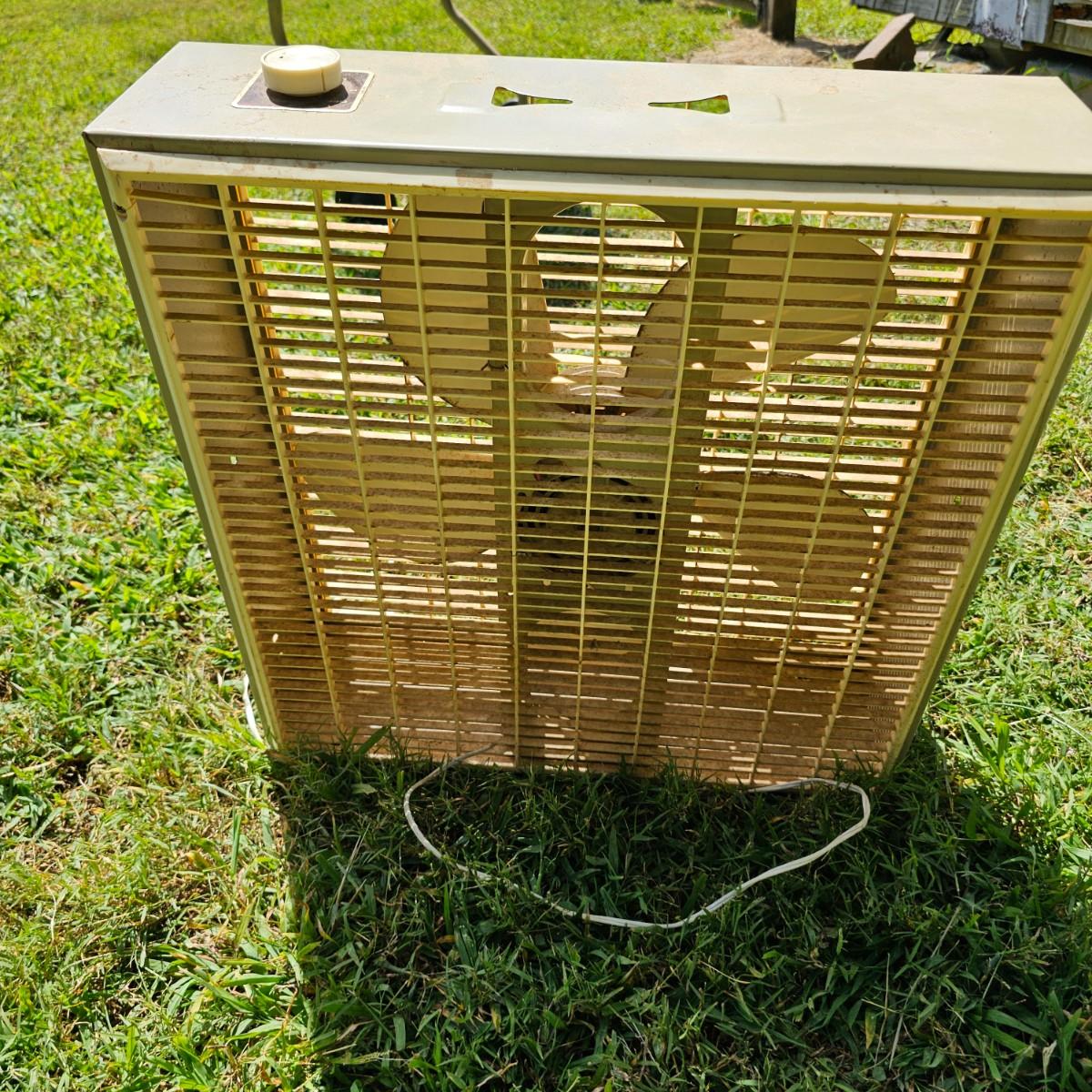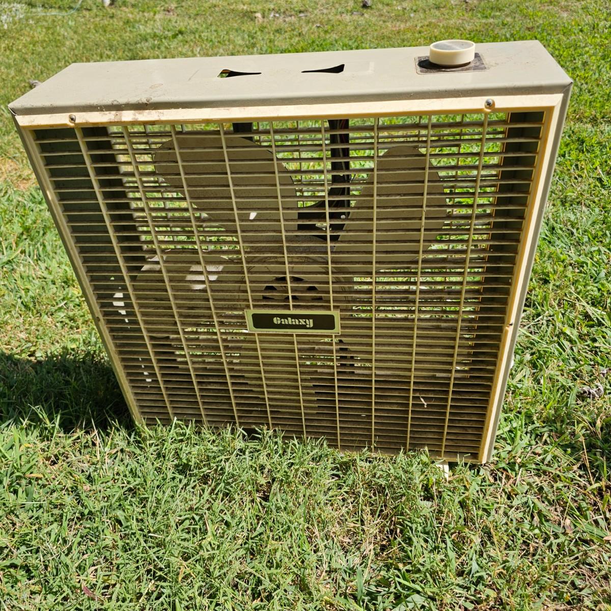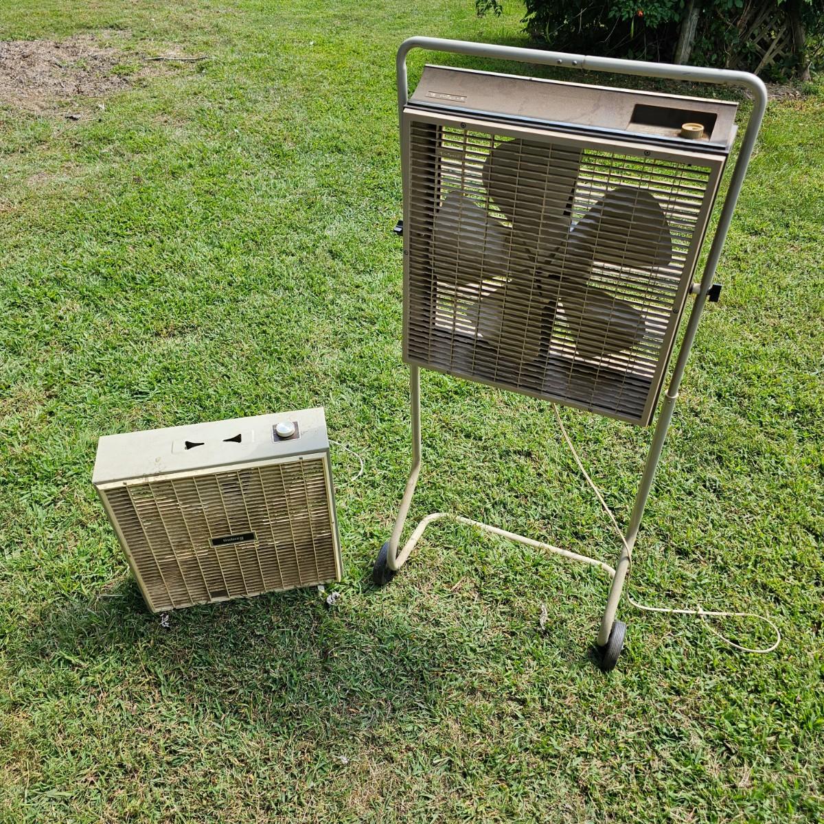 Two 21" box fans, one on a stand and one floor standing. Both fans powered on when plugged in. Tall Wizard fan has three speeds, is 26" x 15" x 58" x H. Small Galaxy fan is 22" x 7" x 22"H, is two speed and is missing carry handle and two feet. Both fans need cleaning. See photos for details. Local pickup only.
