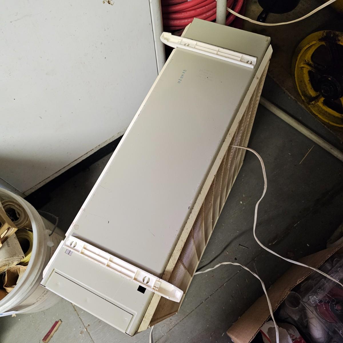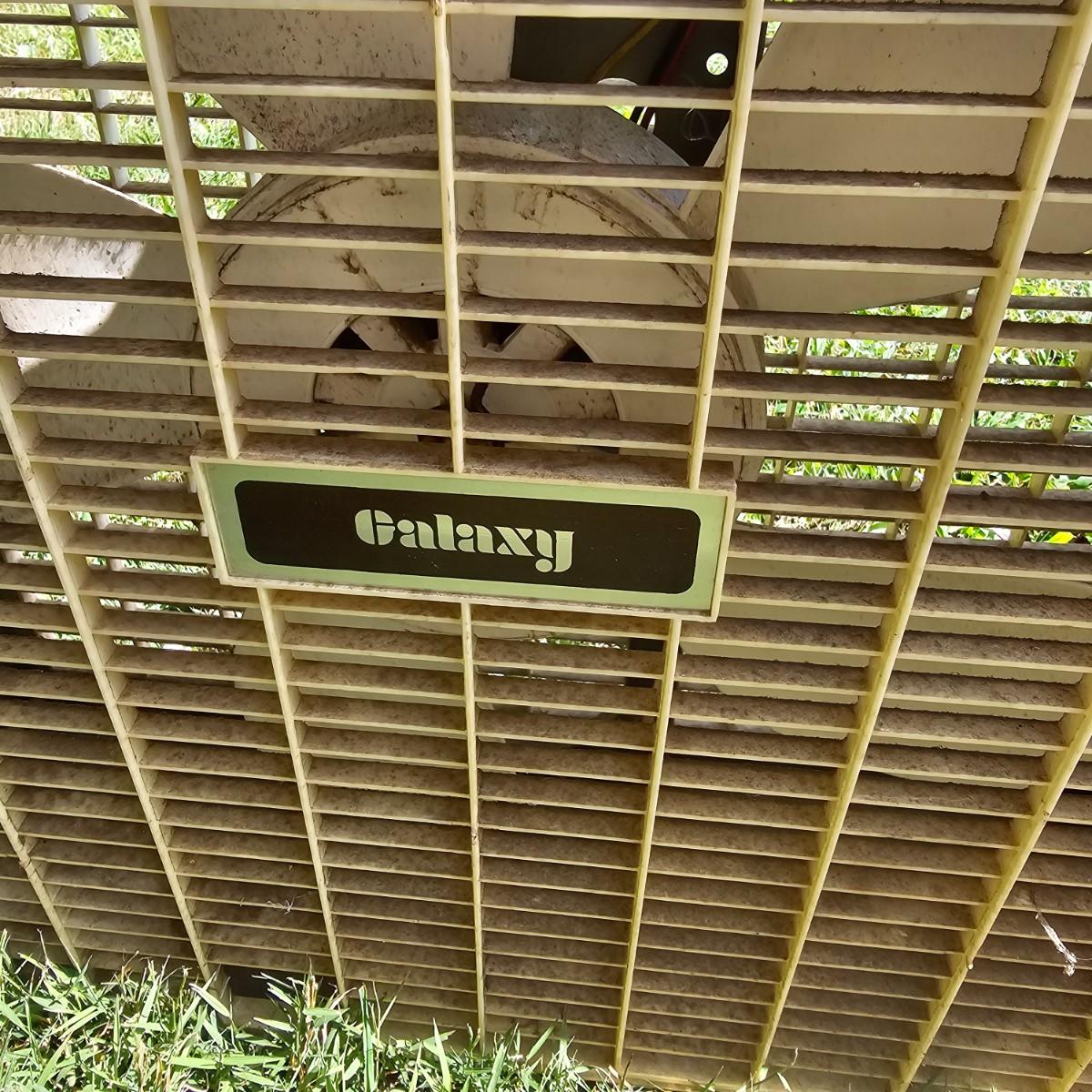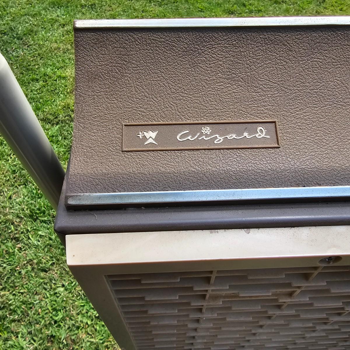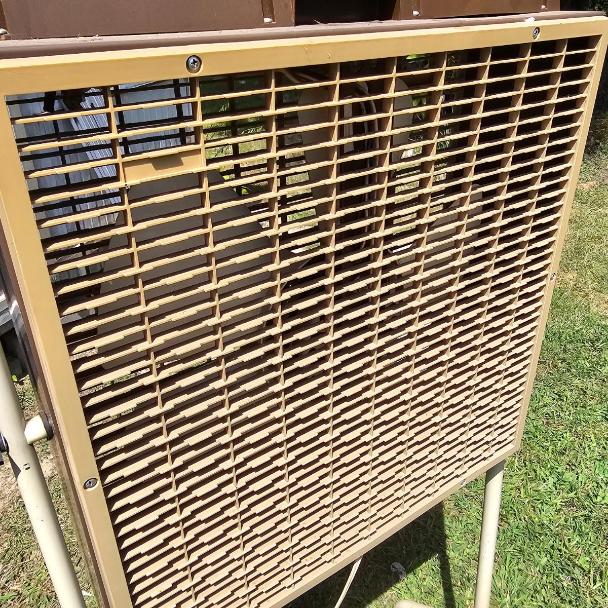 Two 21" box fans, one on a stand and one floor standing. Both fans powered on when plugged in. Tall Wizard fan has three speeds, is 26" x 15" x 58" x H. Small Galaxy fan is 22" x 7" x 22"H, is two speed and is missing carry handle and two feet. Both fans need cleaning. See photos for details. Local pickup only.