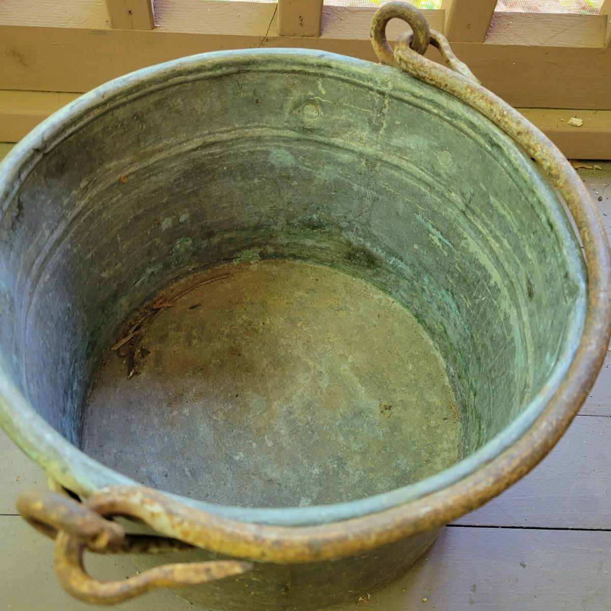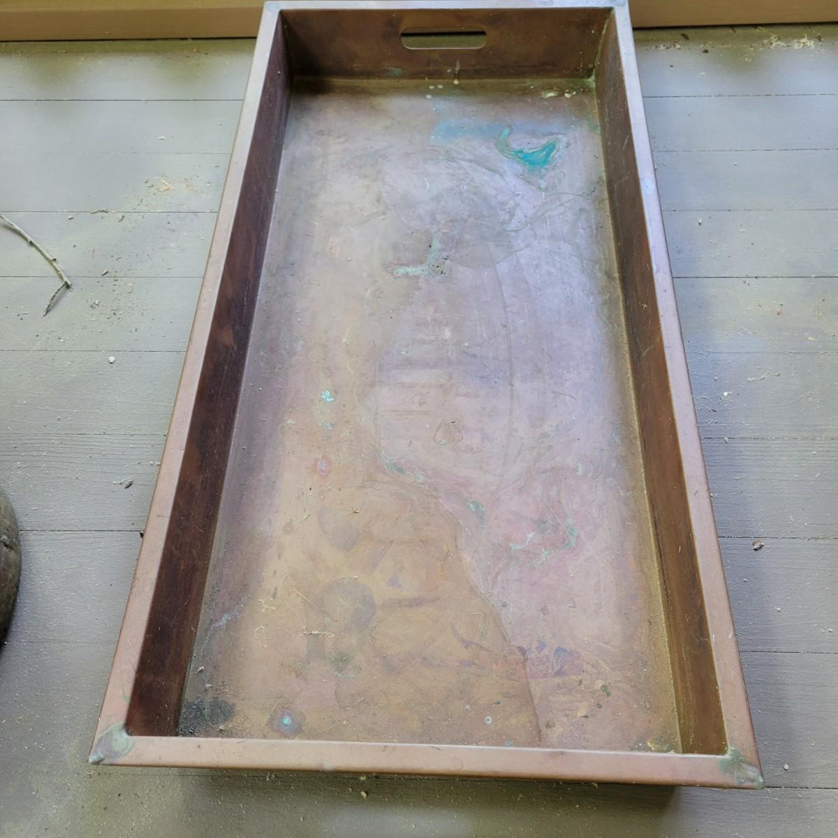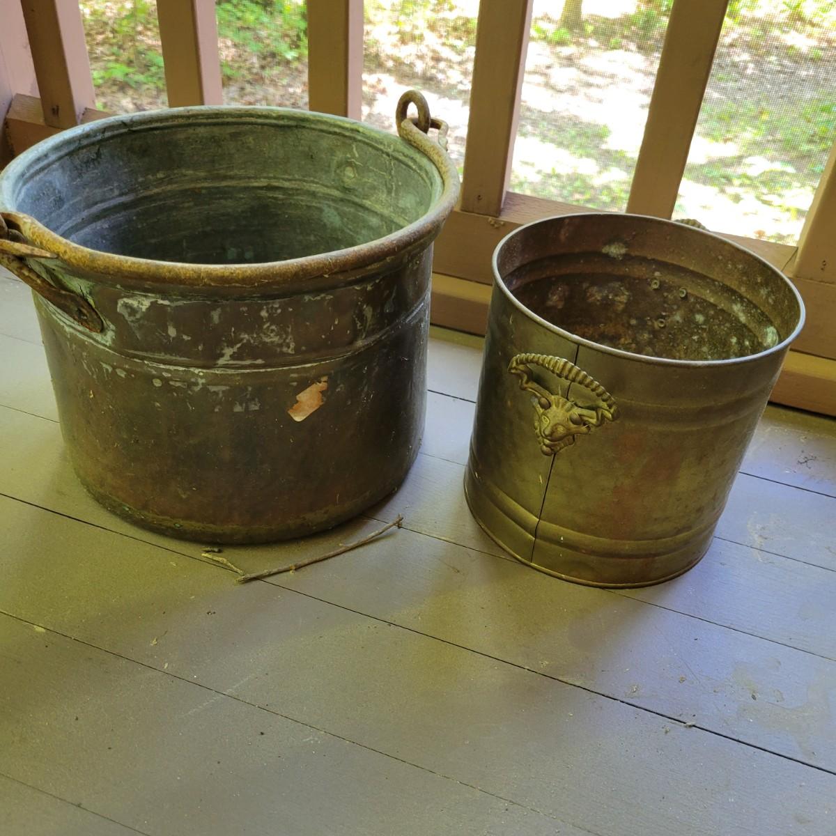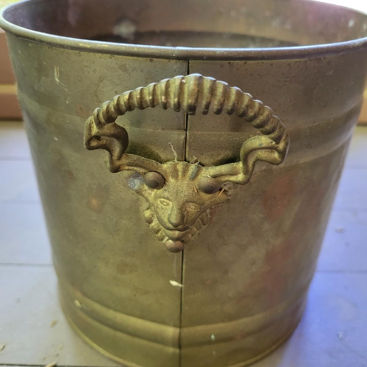 A pair of buckets. One appears to be copper and the other appears to be brass. The smaller bucket has handles with a lion theme and the larger bucket has a rustic wrought iron handle. The larger bucket measures approximately 12"D x 9"H. This lot also includes a large copper tray that measures approximately 27.5" x 14" x 3"H.