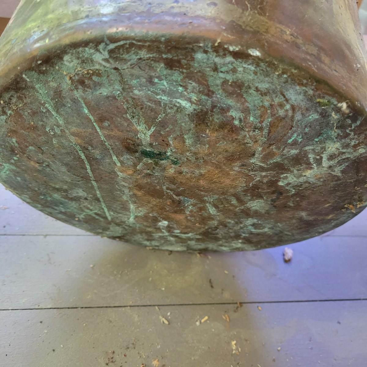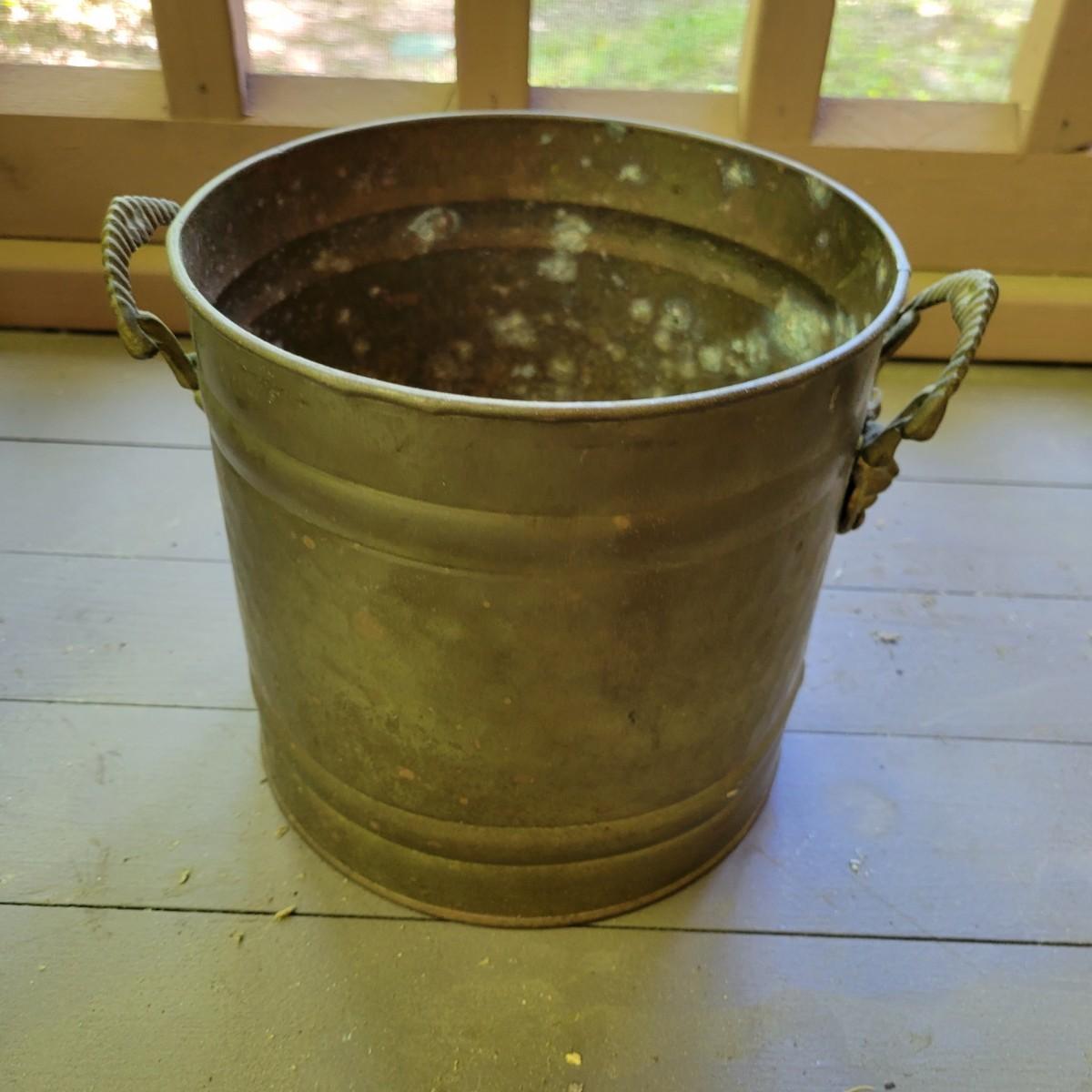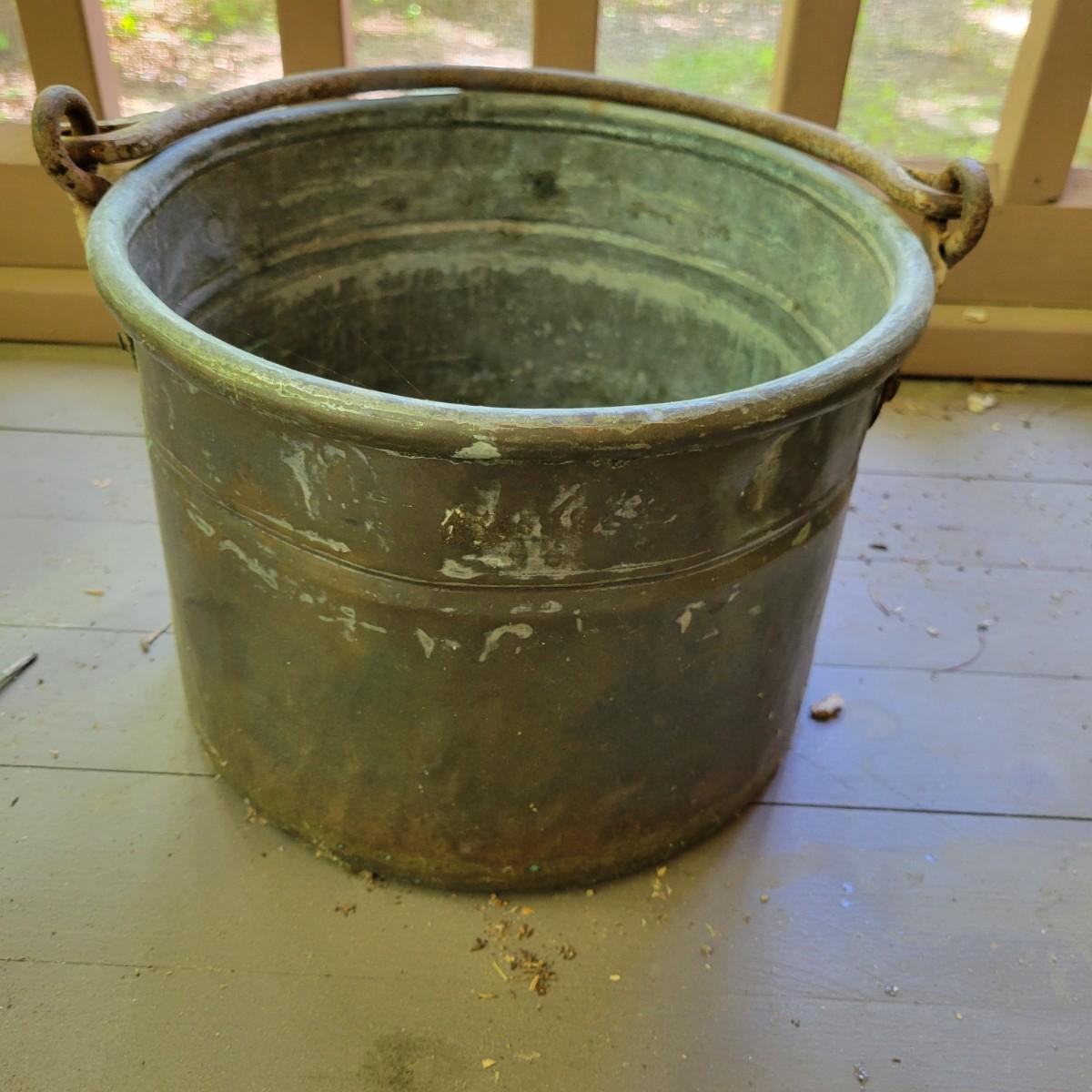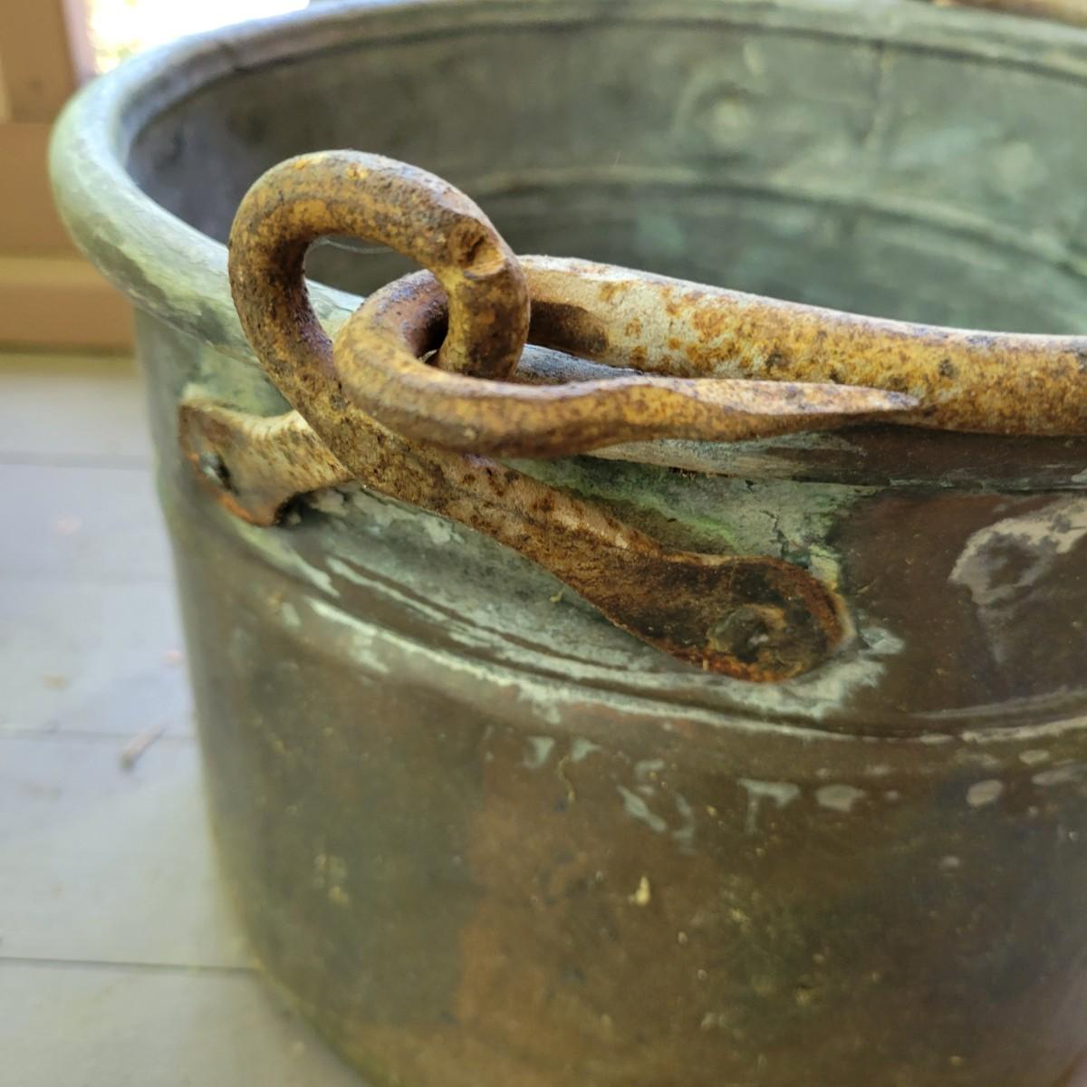 A pair of buckets. One appears to be copper and the other appears to be brass. The smaller bucket has handles with a lion theme and the larger bucket has a rustic wrought iron handle. The larger bucket measures approximately 12"D x 9"H. This lot also includes a large copper tray that measures approximately 27.5" x 14" x 3"H.