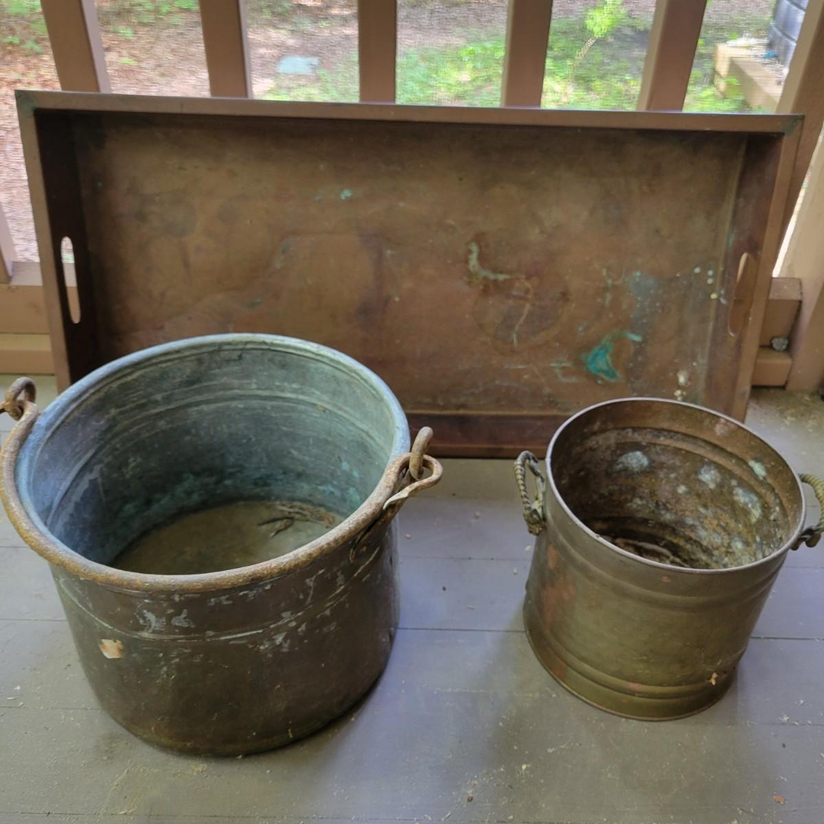 Pair of Metal Buckets and a Copper Tray (P-DW)