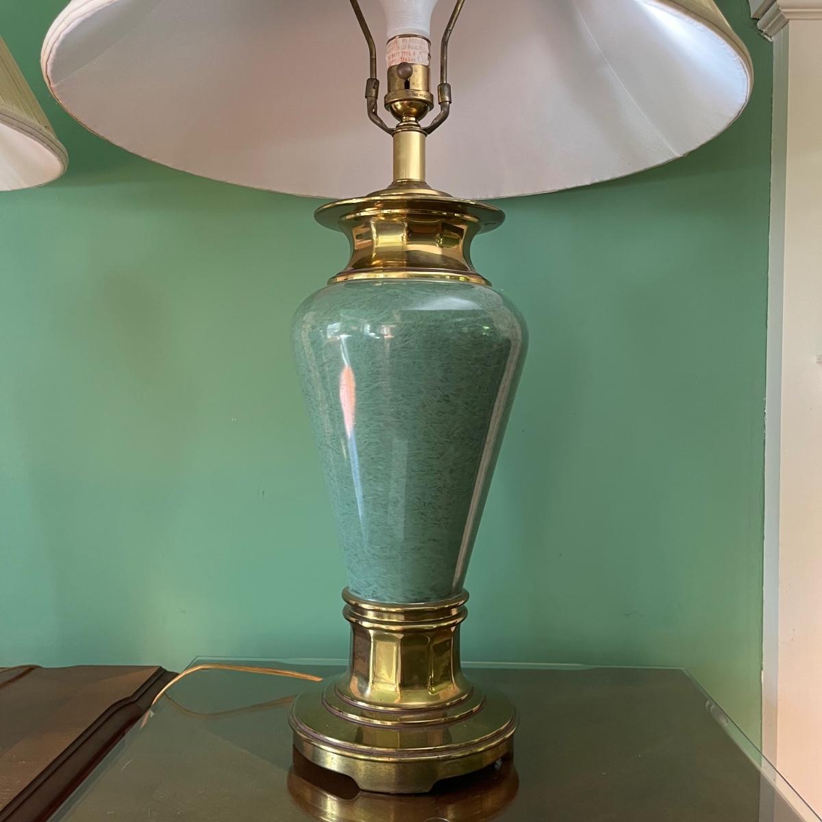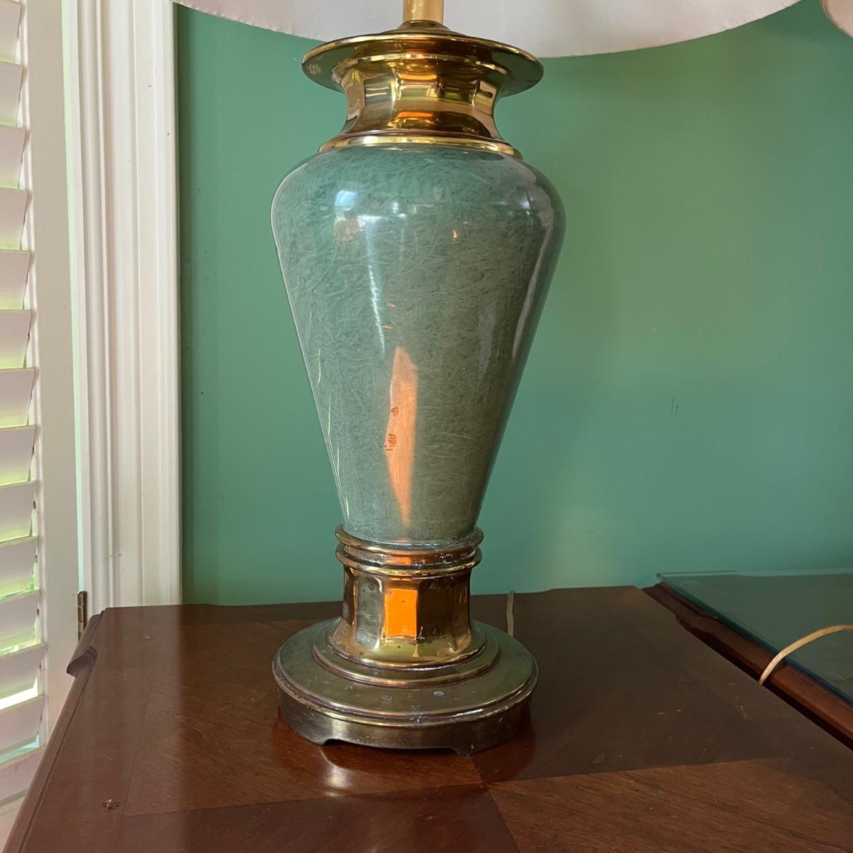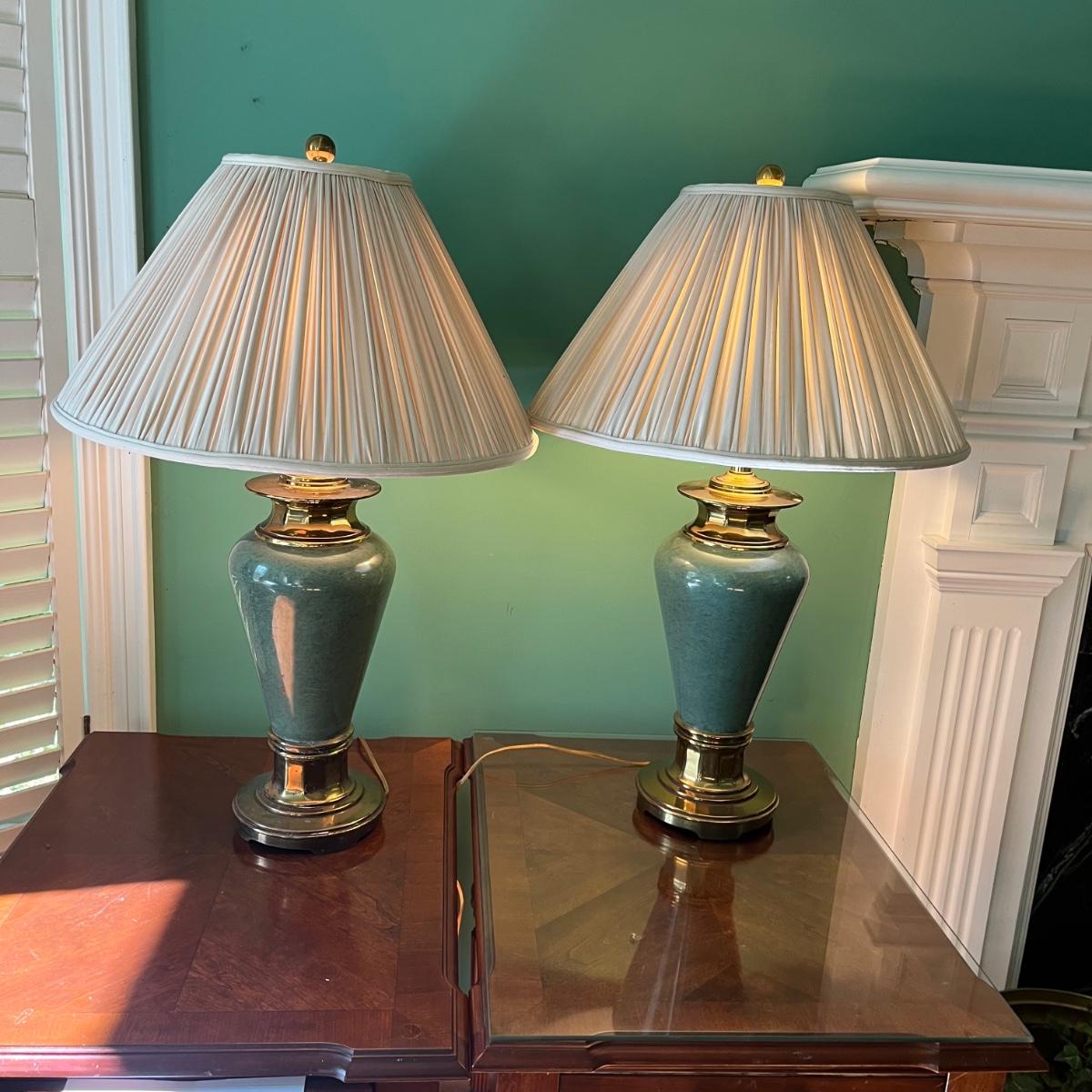 Lot includes two brass and ceramic table lamps that both worked when tested. One lamp has two black marks, see pictures. Lamps measure 20”D with shade x 30” tall.