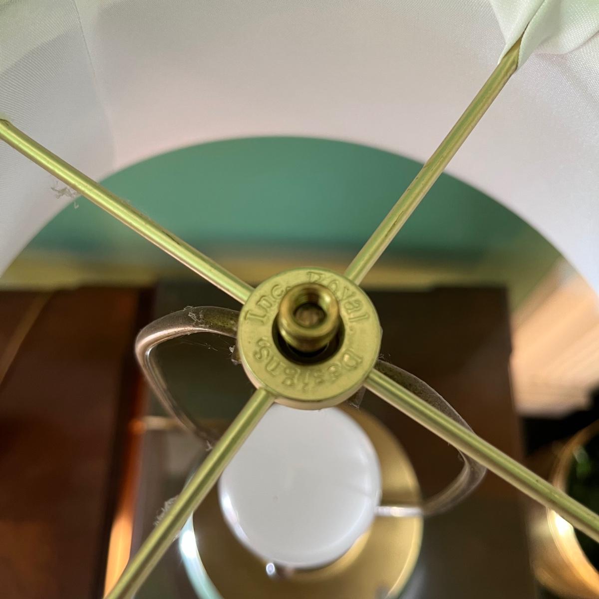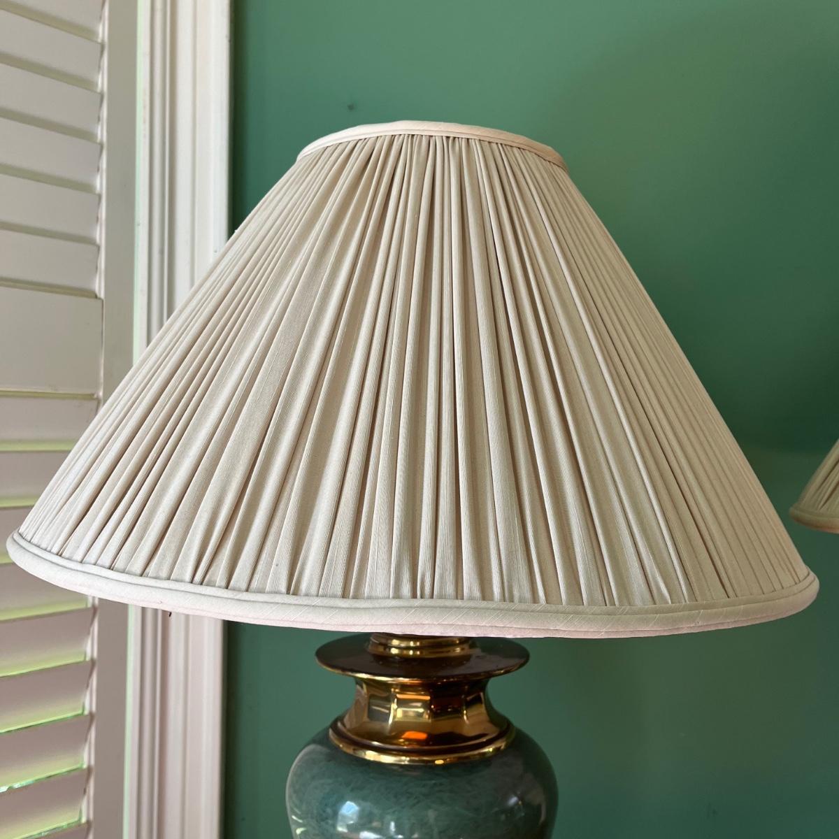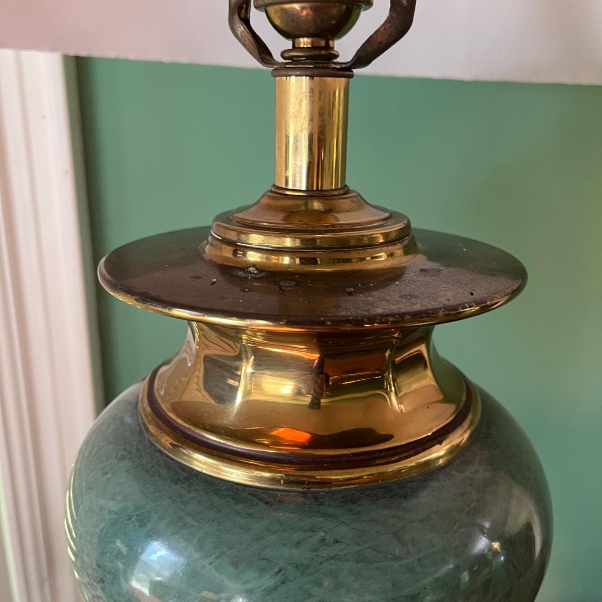 Lot includes two brass and ceramic table lamps that both worked when tested. One lamp has two black marks, see pictures. Lamps measure 20”D with shade x 30” tall.