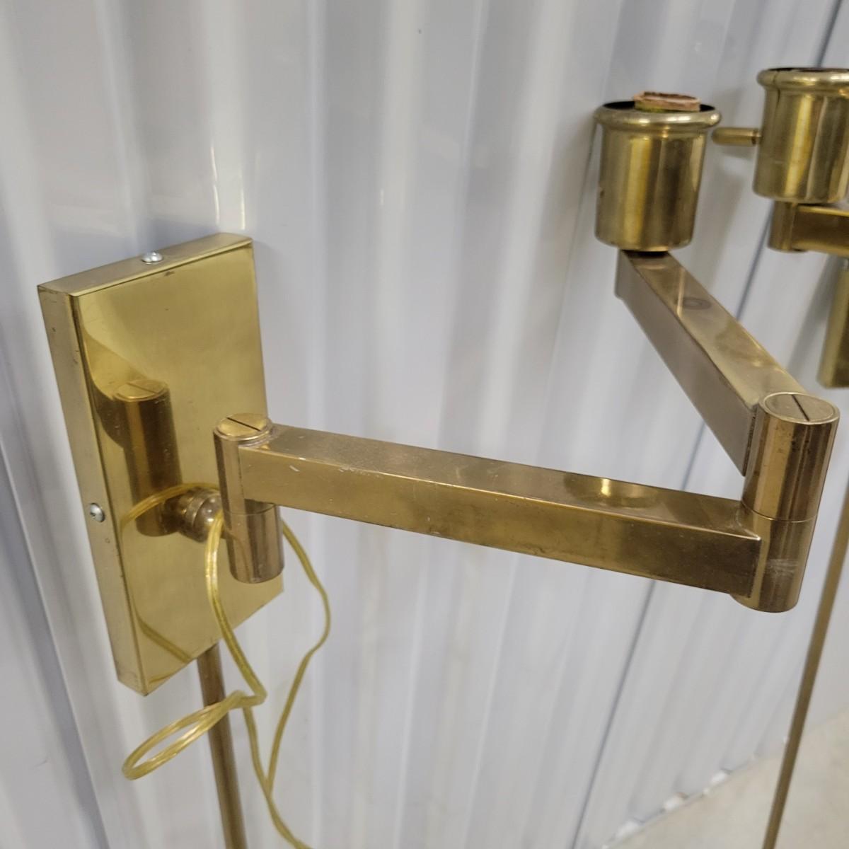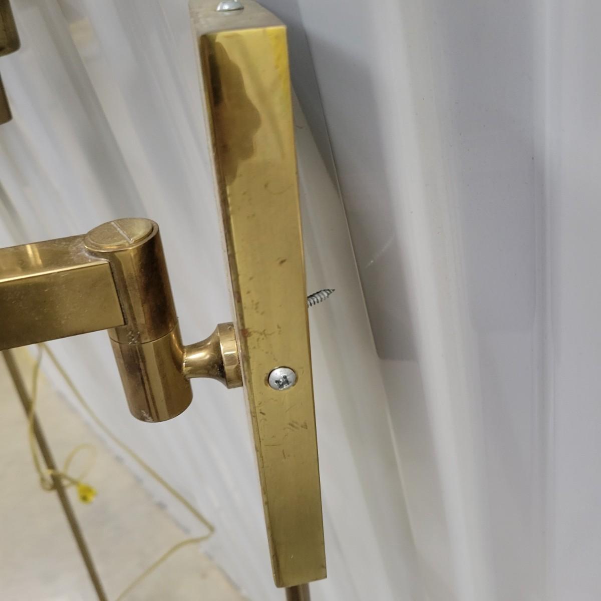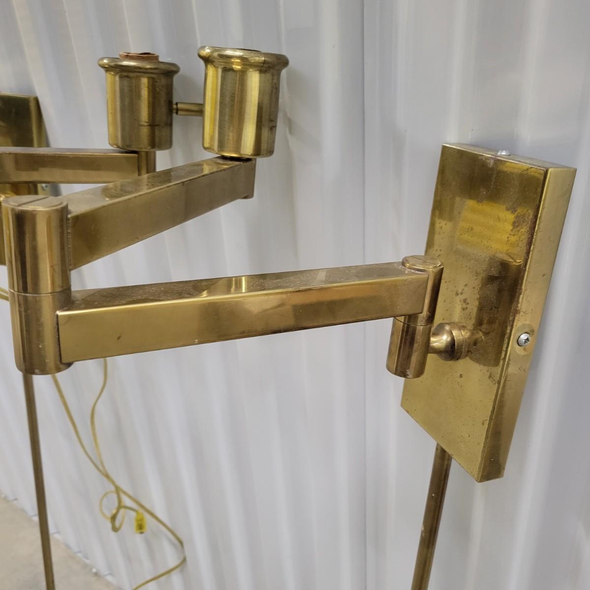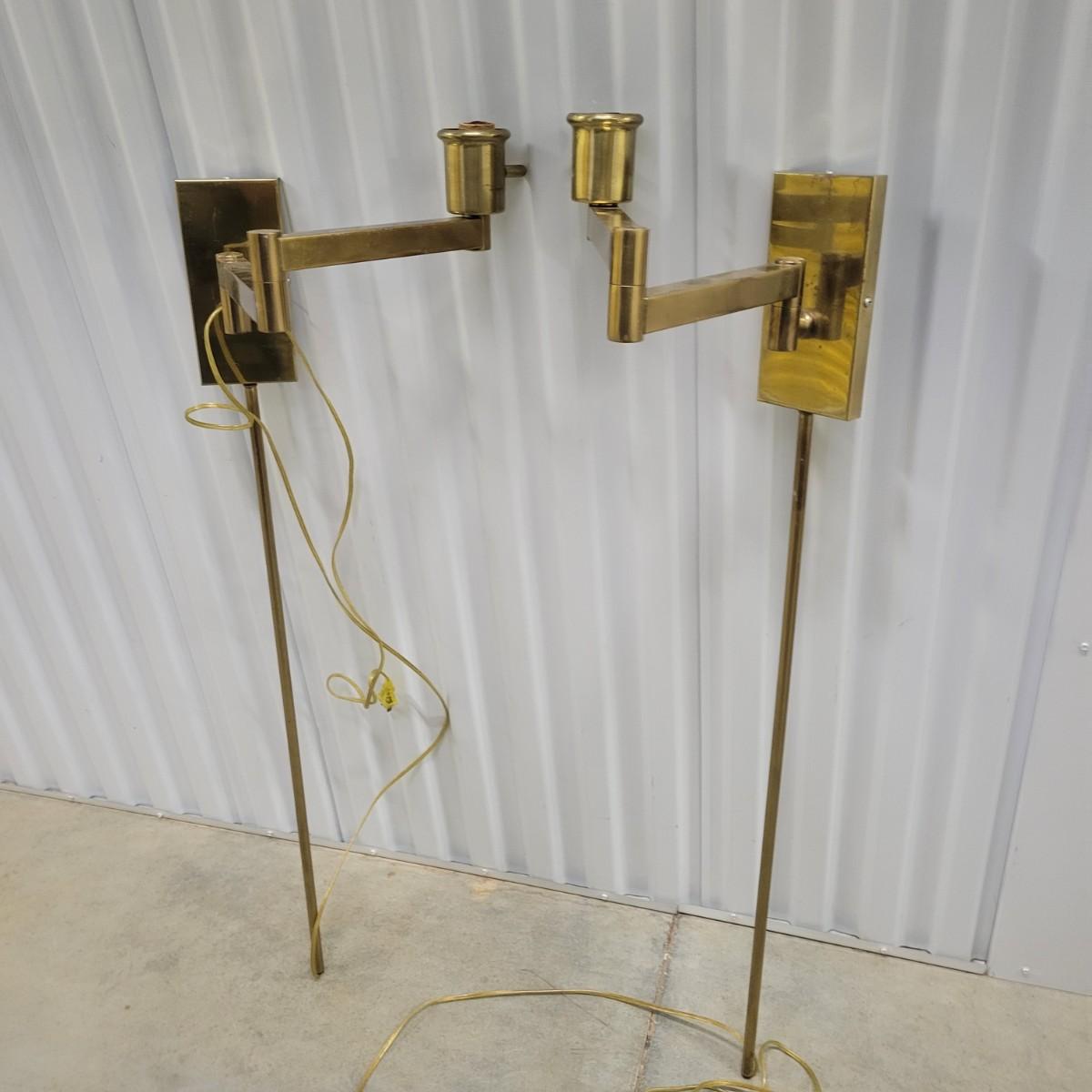 A pair of brass folding lamps that wall mount in good condition, but there is some patina on the mounting face. Lamps were tested and work. Lamps feature a dimming dial and two pivoting arms. Below the mounting plate is a 30" brass tube to protect the power cord. Power cord measures 74" beyond the base of the tube. Light measures approximately 4" x 12" x 38" Local pickup only