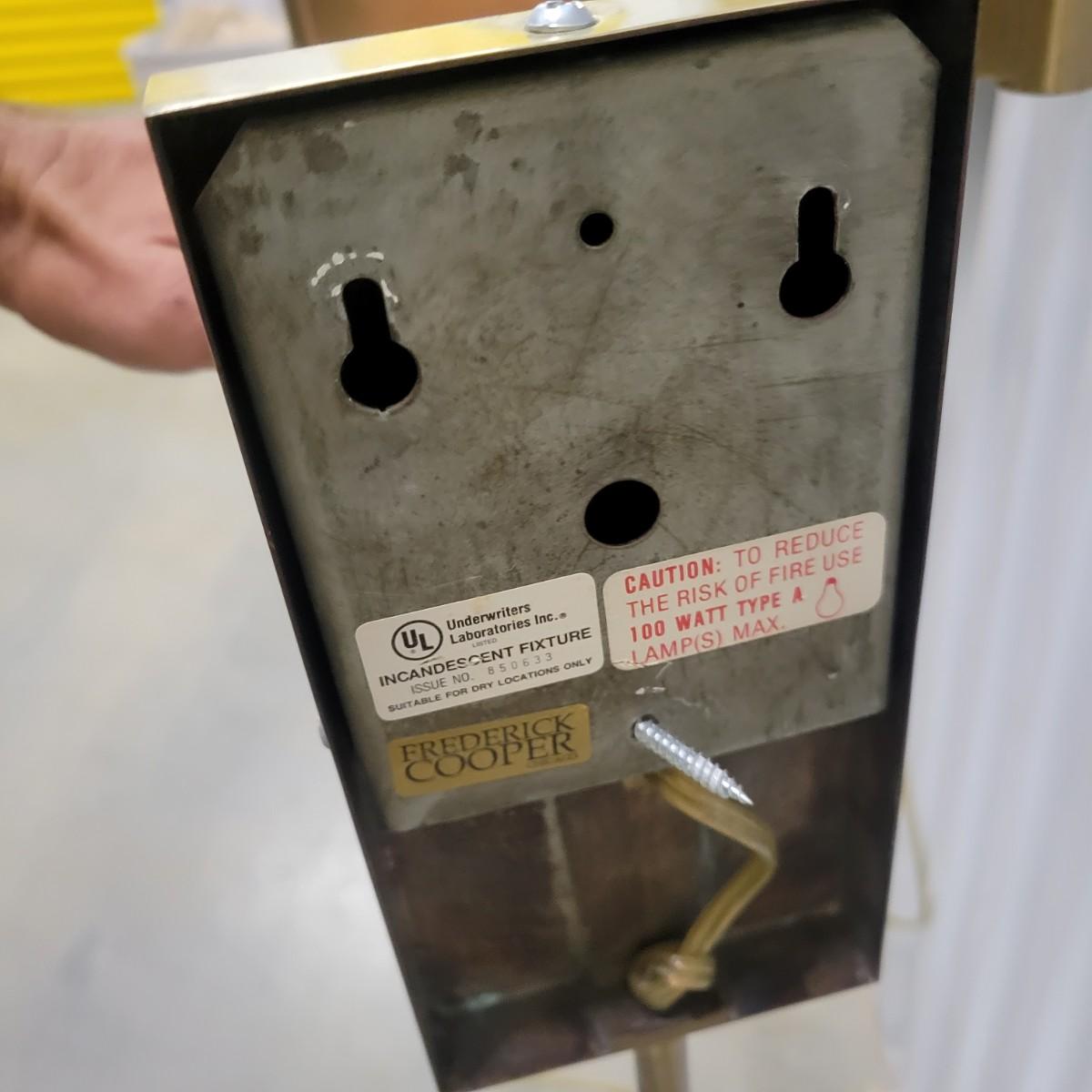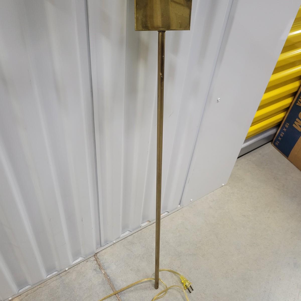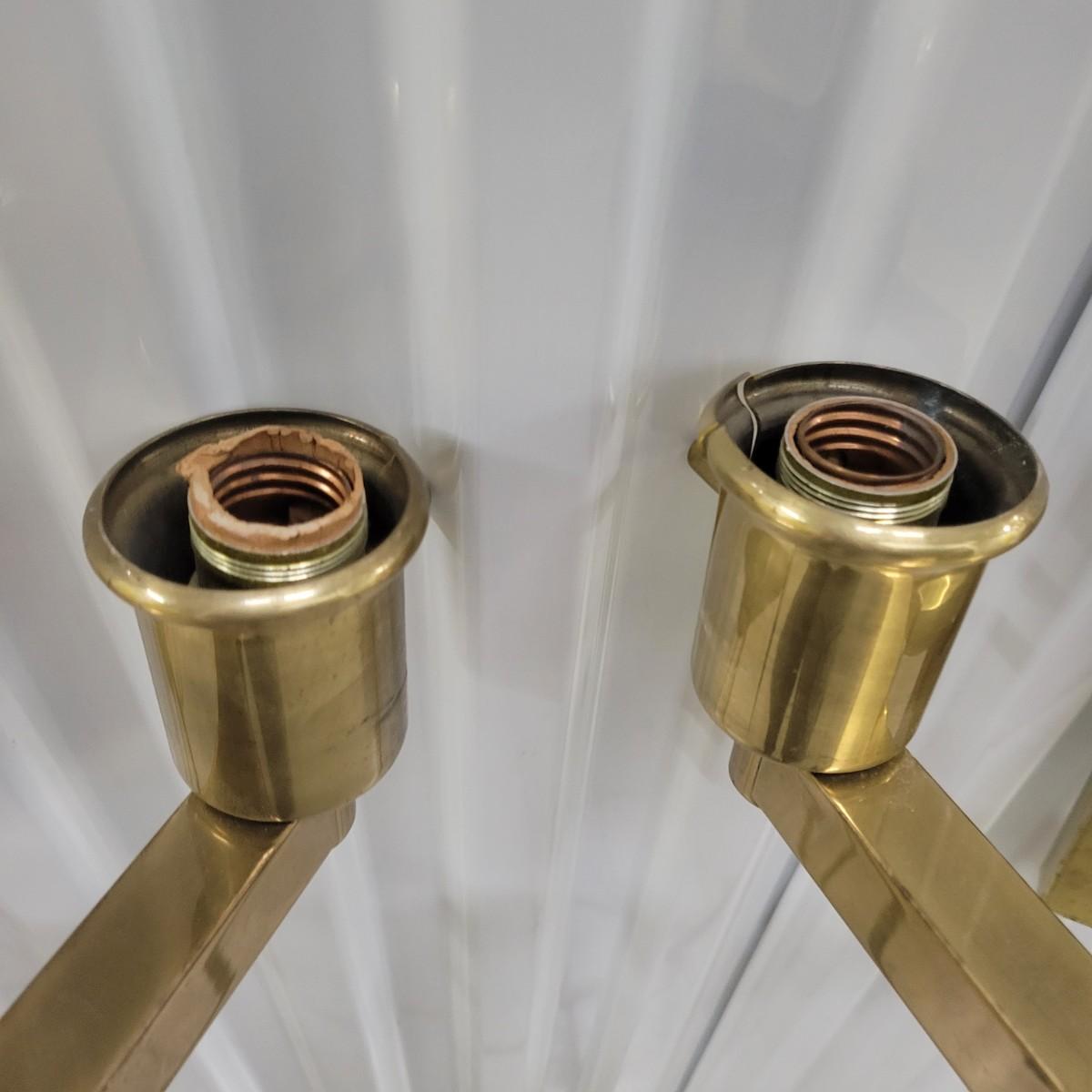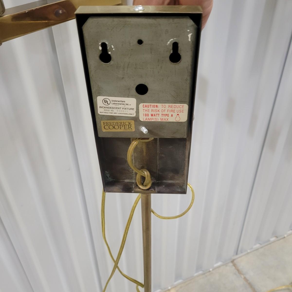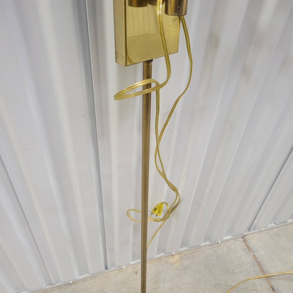 A pair of brass folding lamps that wall mount in good condition, but there is some patina on the mounting face. Lamps were tested and work. Lamps feature a dimming dial and two pivoting arms. Below the mounting plate is a 30" brass tube to protect the power cord. Power cord measures 74" beyond the base of the tube. Light measures approximately 4" x 12" x 38" Local pickup only