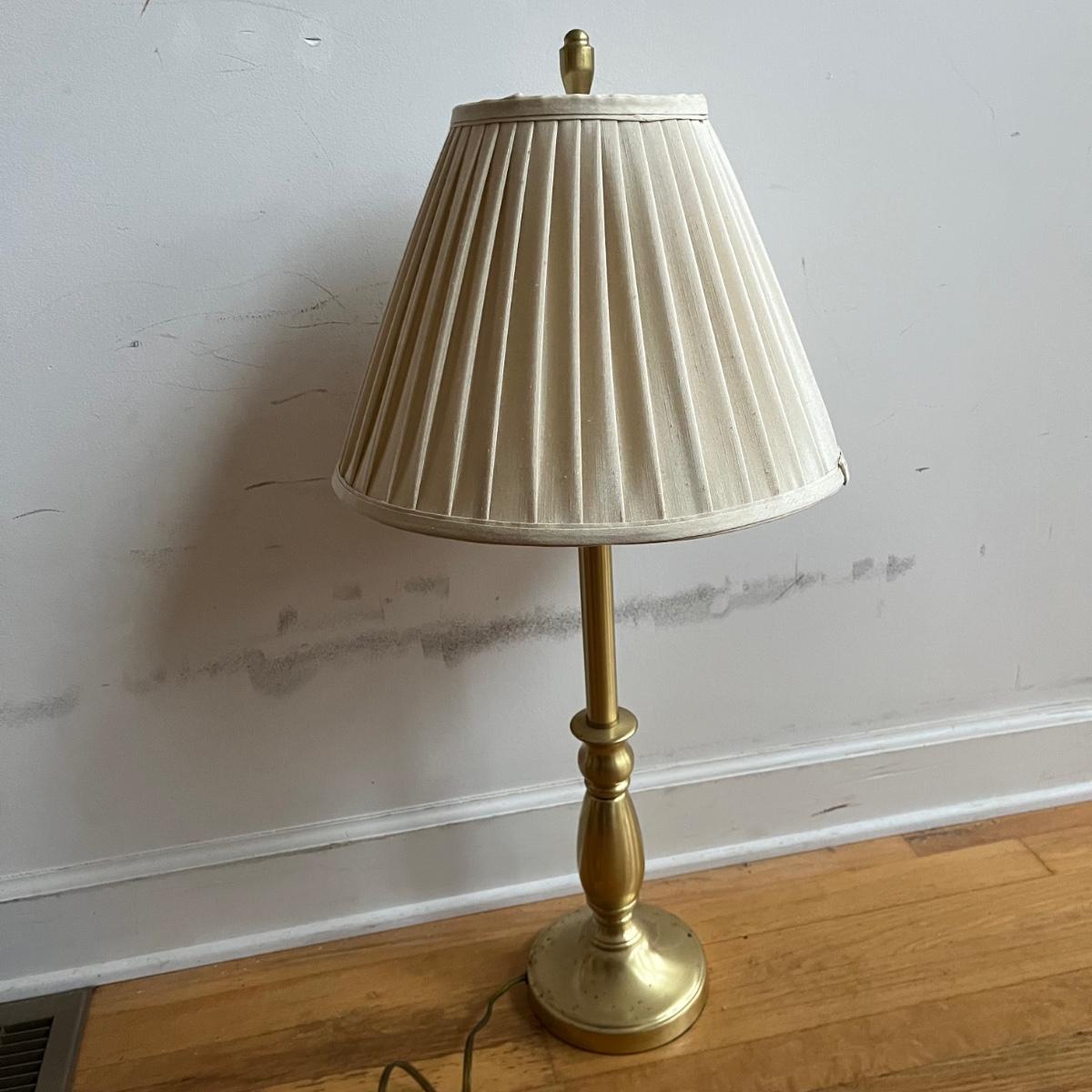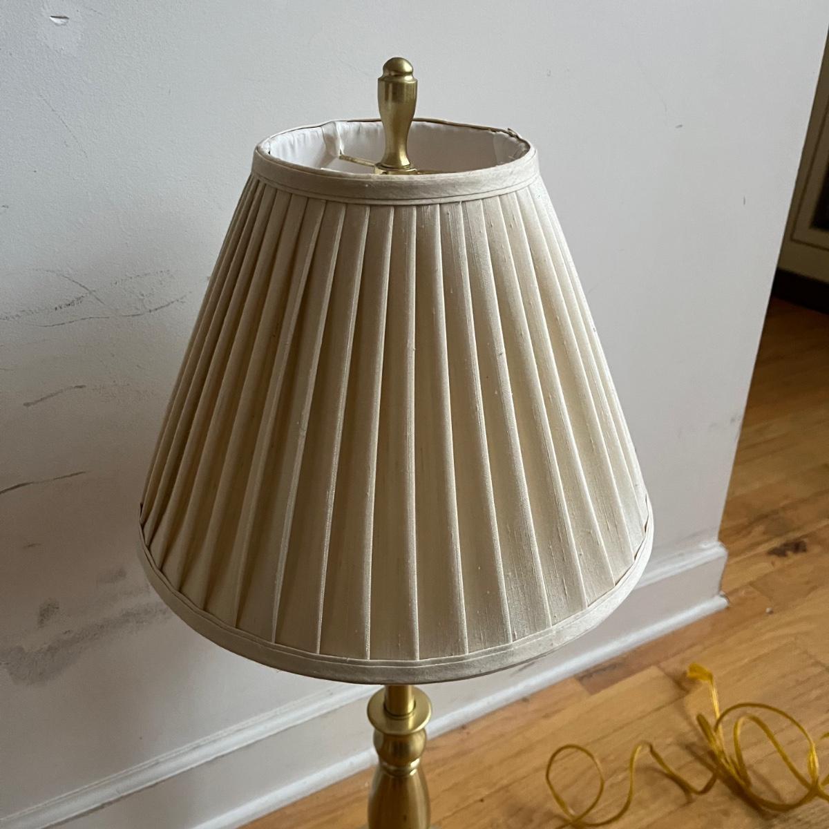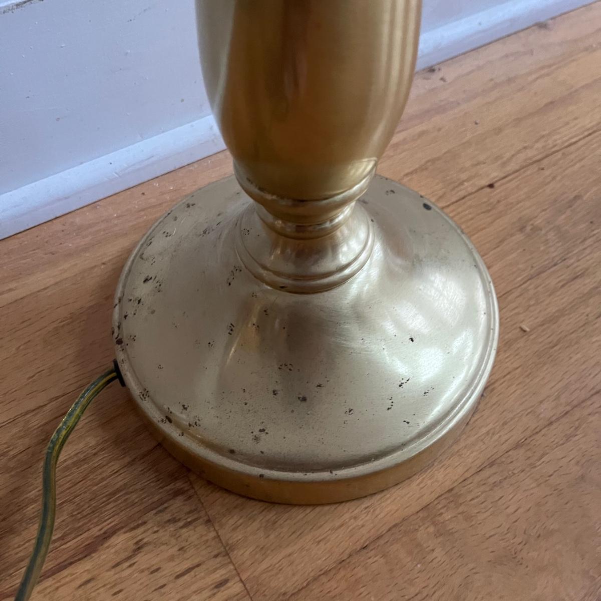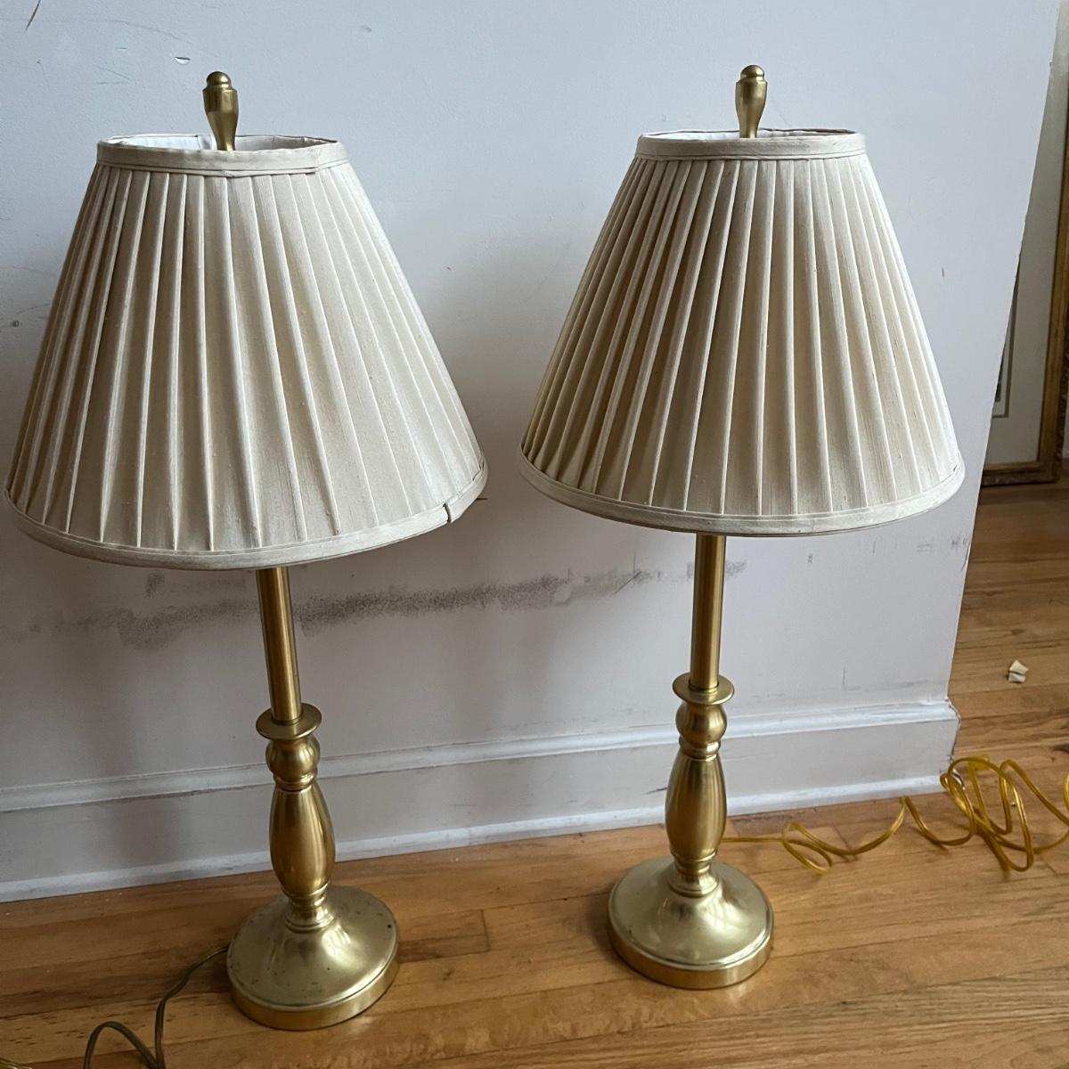 Lot includes a pair of brass table lamps with Stiffel shades. Both lights worked when tested. Both lamps have marks on bases, see pictures. Lamps measure 14”D x 31” tall.