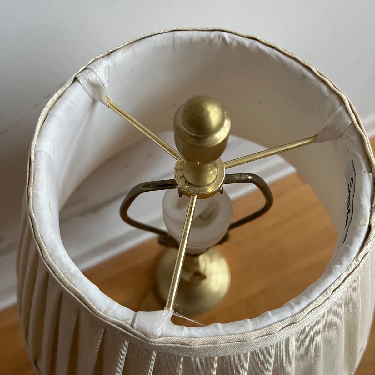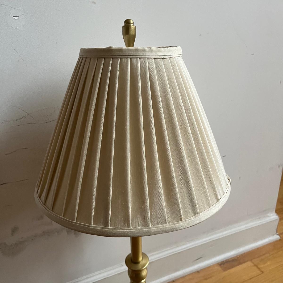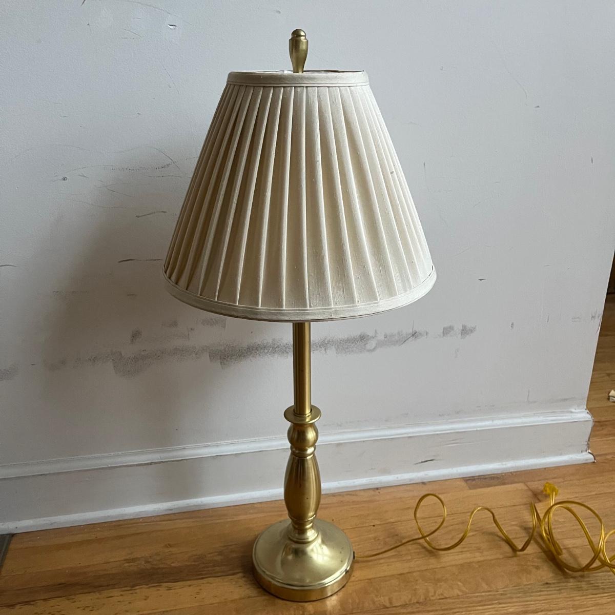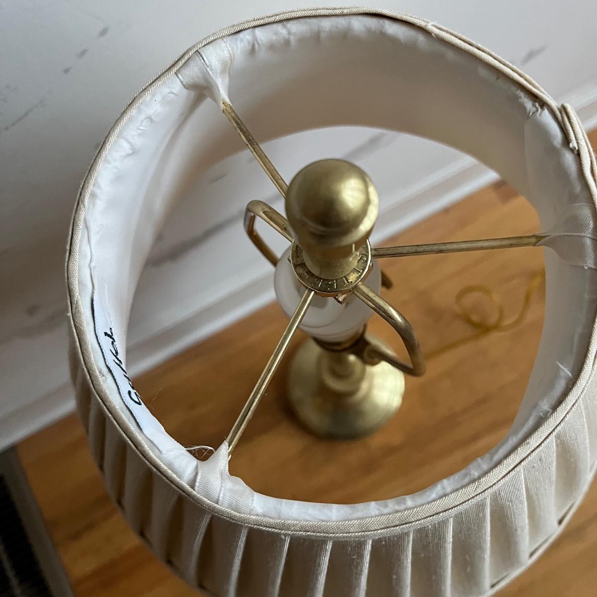 Lot includes a pair of brass table lamps with Stiffel shades. Both lights worked when tested. Both lamps have marks on bases, see pictures. Lamps measure 14”D x 31” tall.