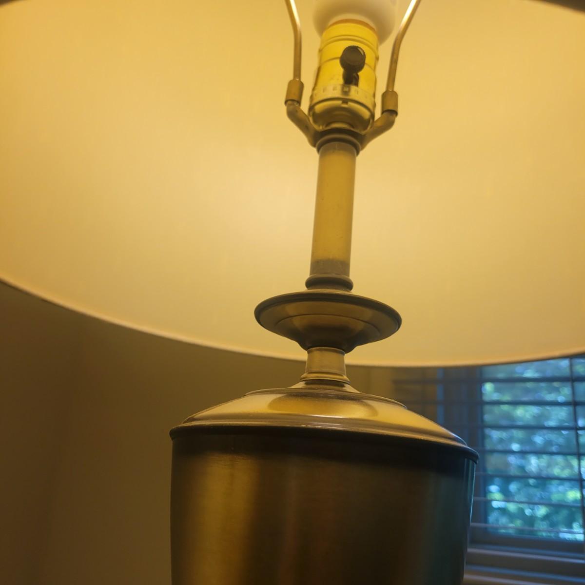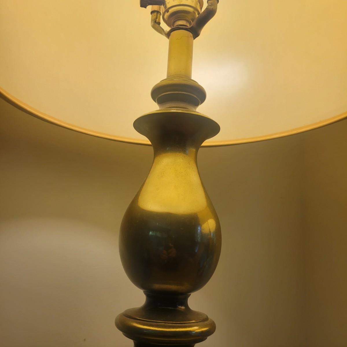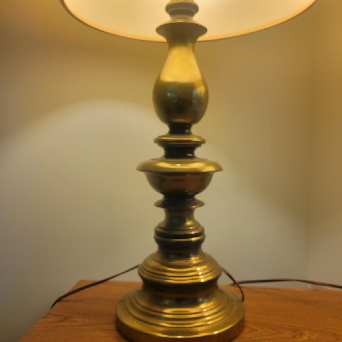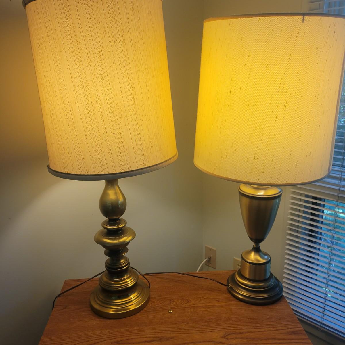 A pair of brass lamps in good condition with no notable damage. Larger lamp has a shined finish, smaller one has a brushed finish. Largest lamp measures approximately 7" x 33" Local pickup only