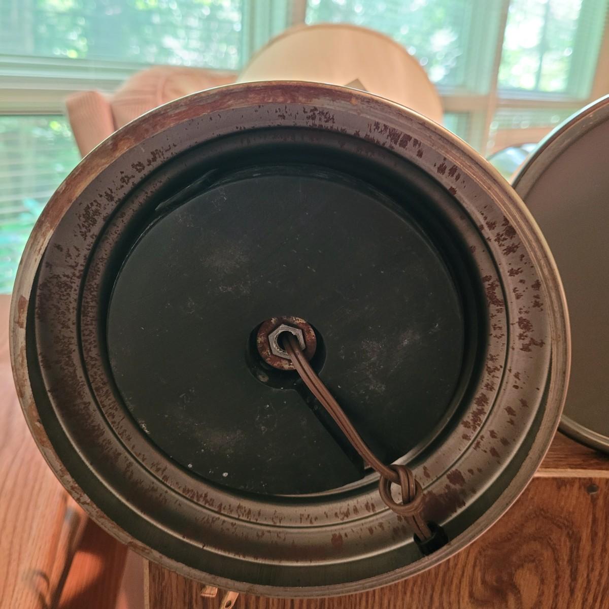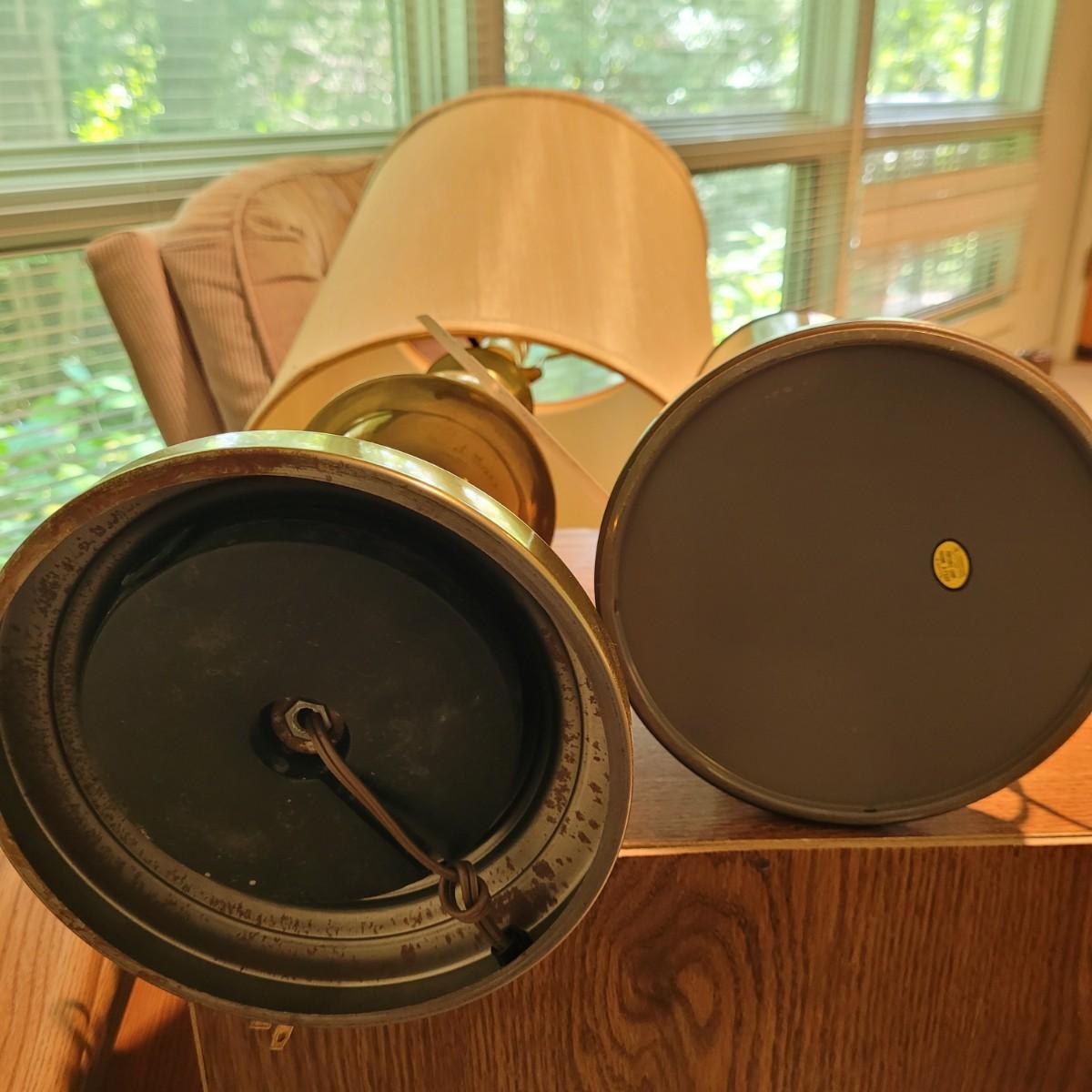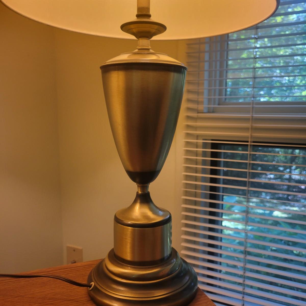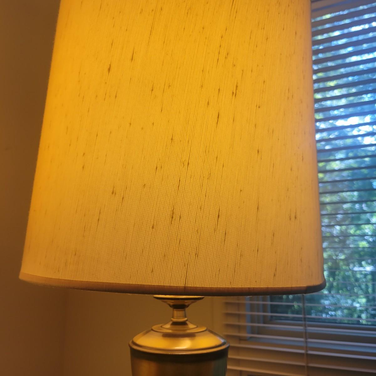 A pair of brass lamps in good condition with no notable damage. Larger lamp has a shined finish, smaller one has a brushed finish. Largest lamp measures approximately 7" x 33" Local pickup only
