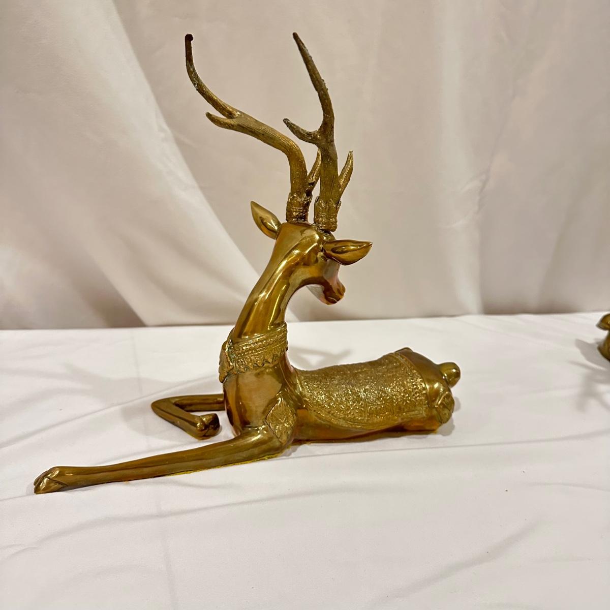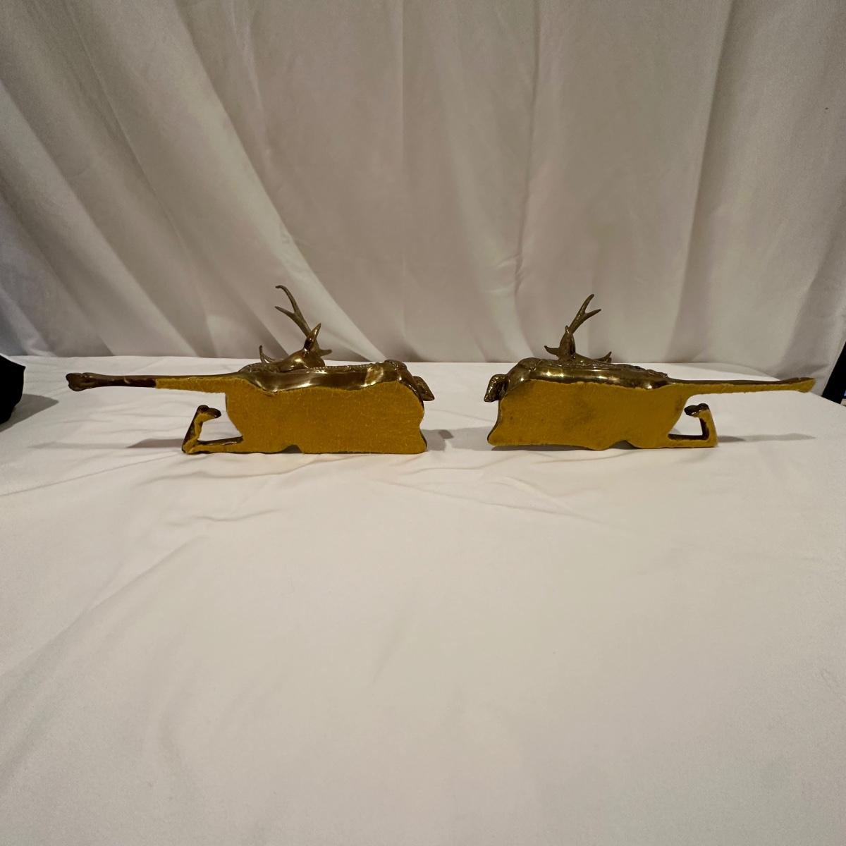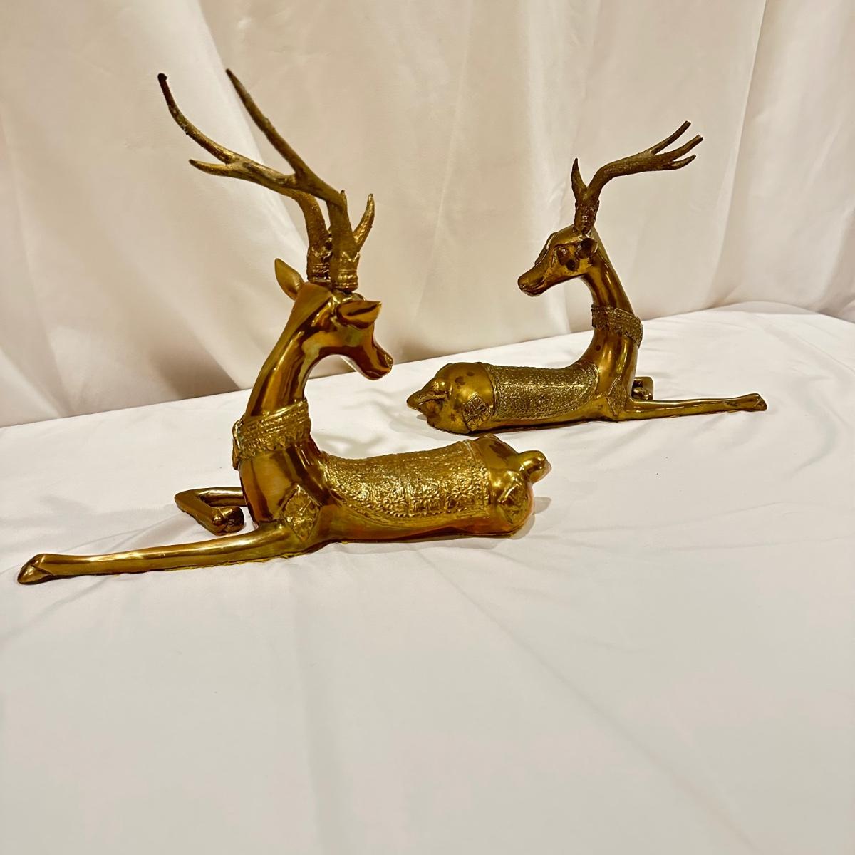 Decorative pair of Sarreid Style brass reindeer measures 13” from hoof to tail, and 12.5" x 4” x 9.5”H. They are fairly heavy and make a rattling sound when picked up, but aren’t chipped anywhere on the piece. Shipping available