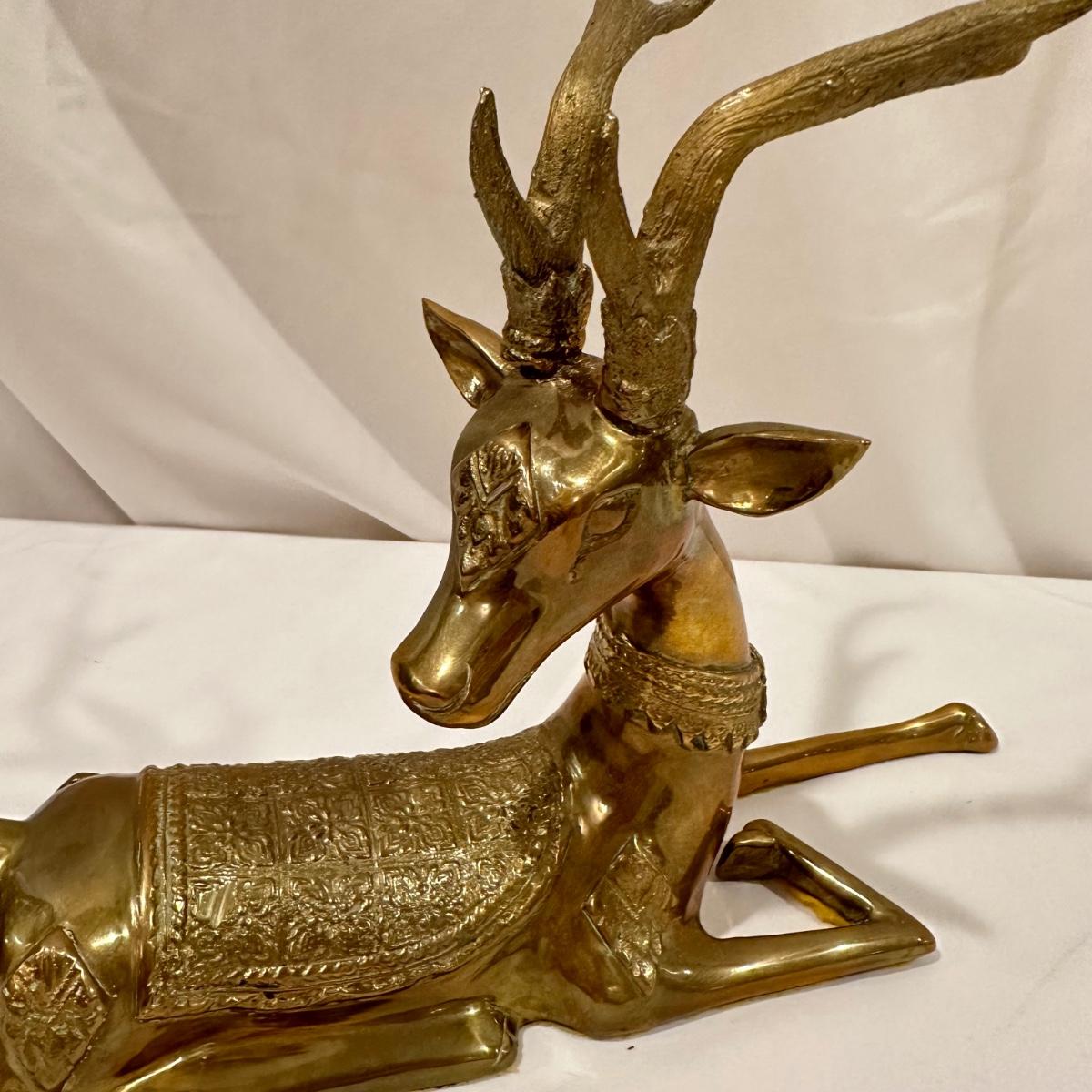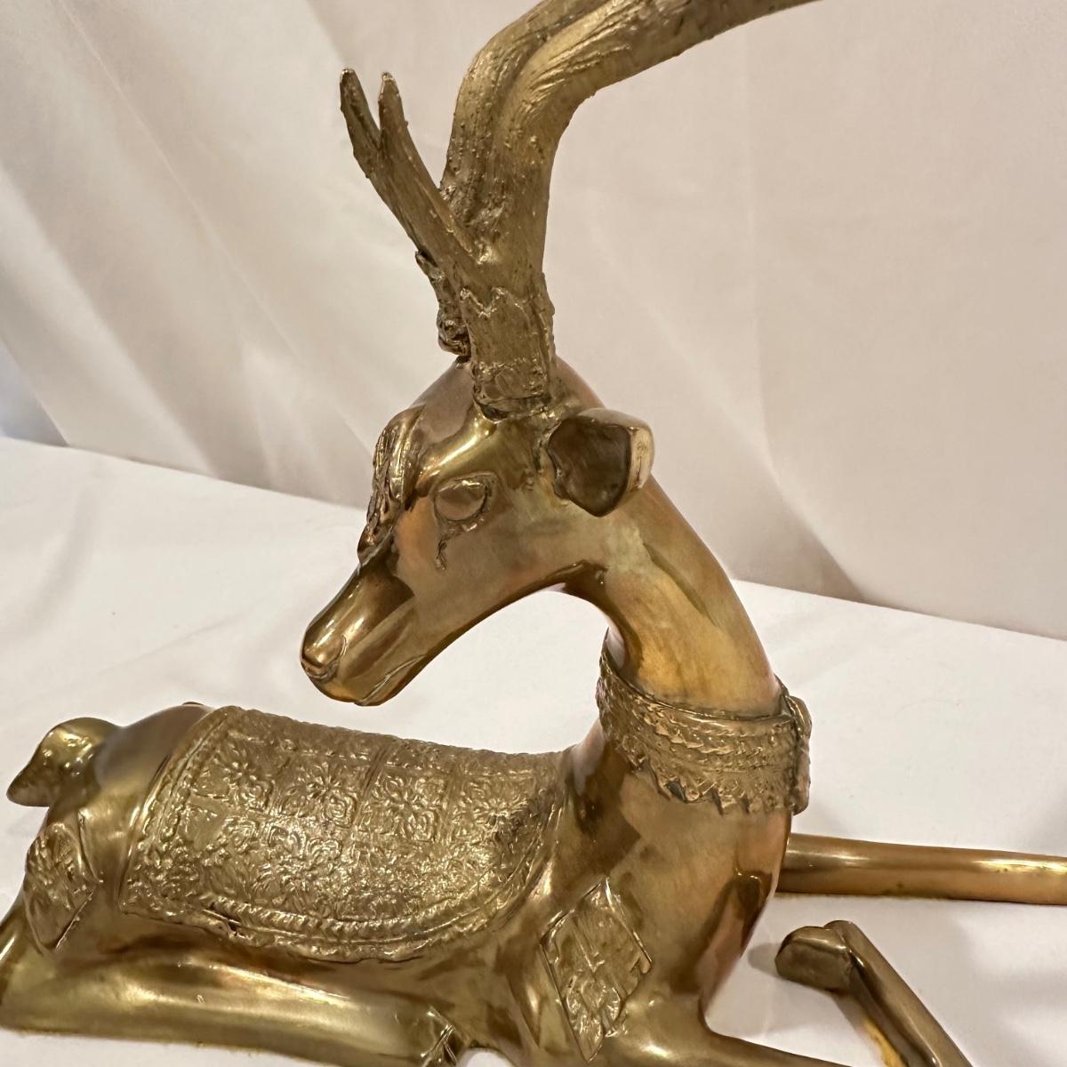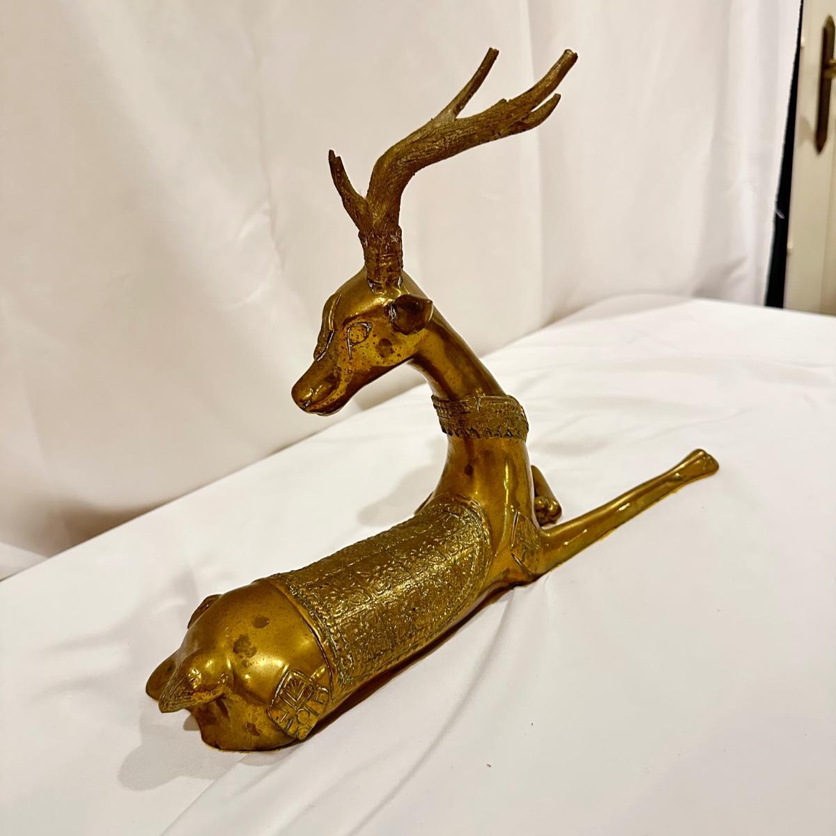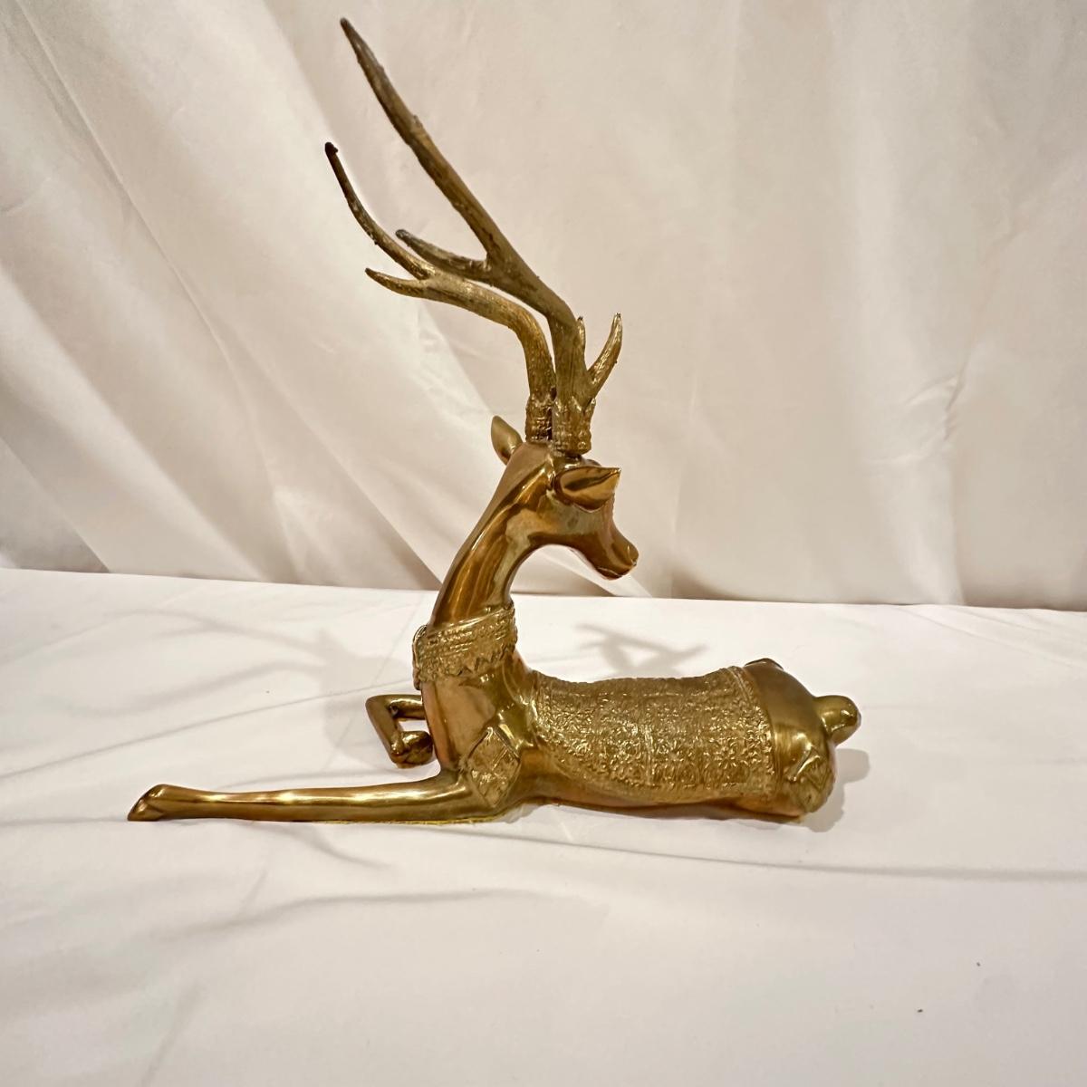 Decorative pair of Sarreid Style brass reindeer measures 13” from hoof to tail, and 12.5" x 4” x 9.5”H. They are fairly heavy and make a rattling sound when picked up, but aren’t chipped anywhere on the piece. Shipping available
