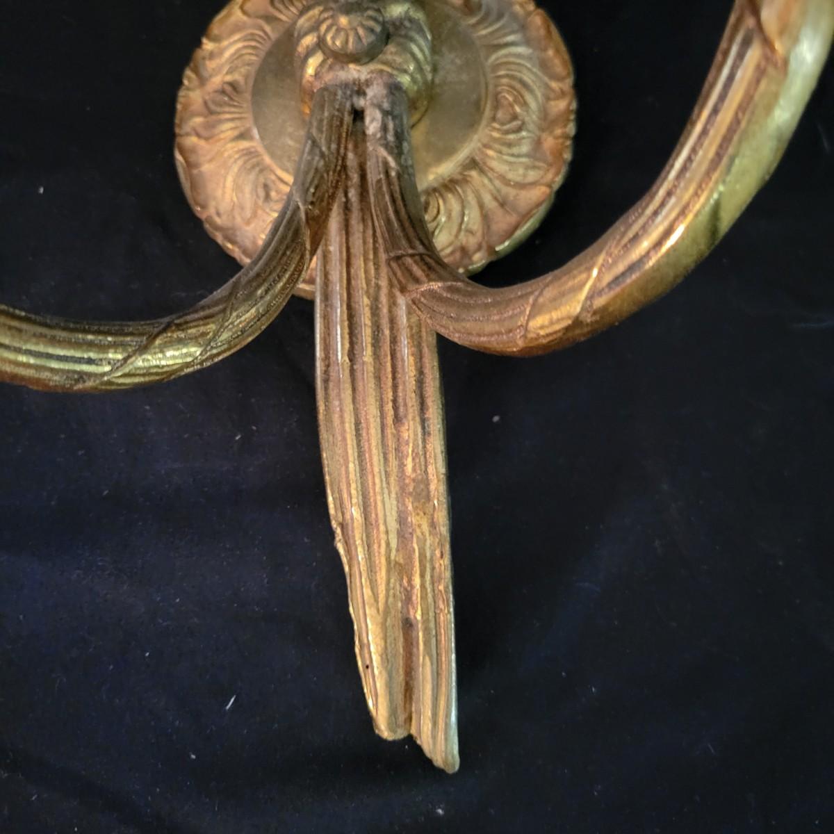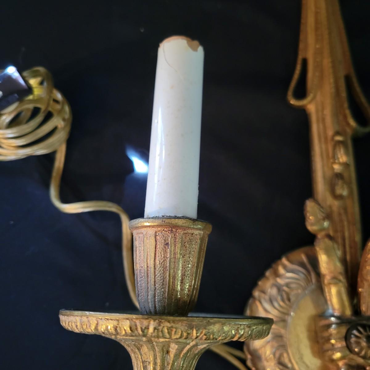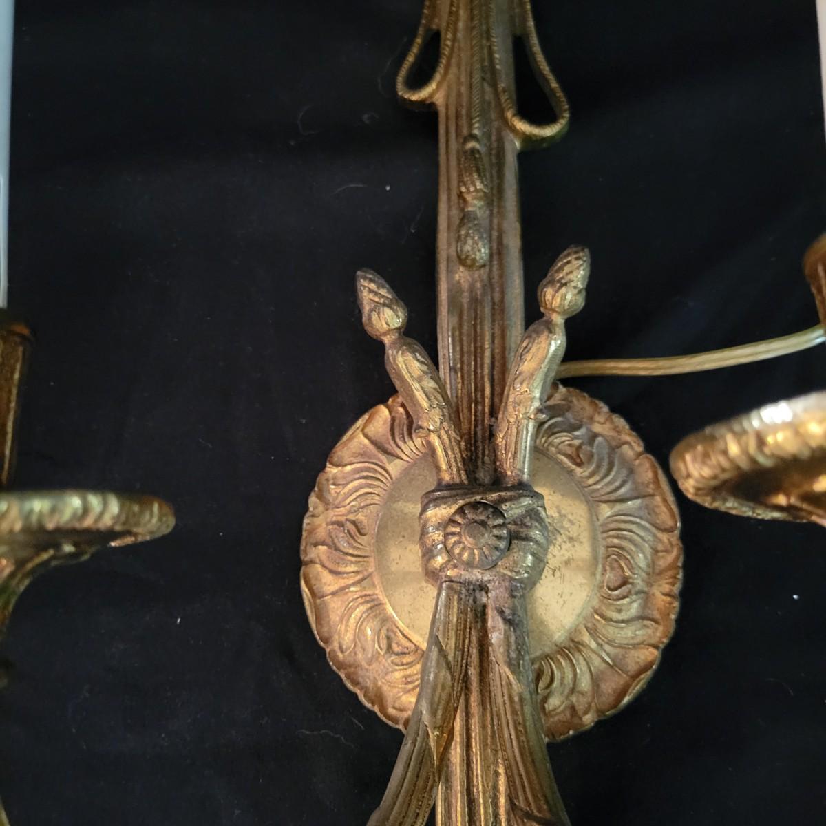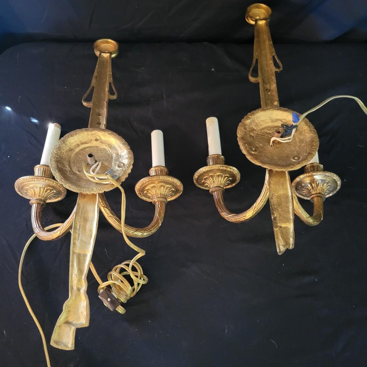A pair of brass wall Sconces that could not be tested. They both have inline switches and have slightly different designs. The larger sconce on the left measures approximately 21.5" x 5.5" x 10.5"H. Shipping available