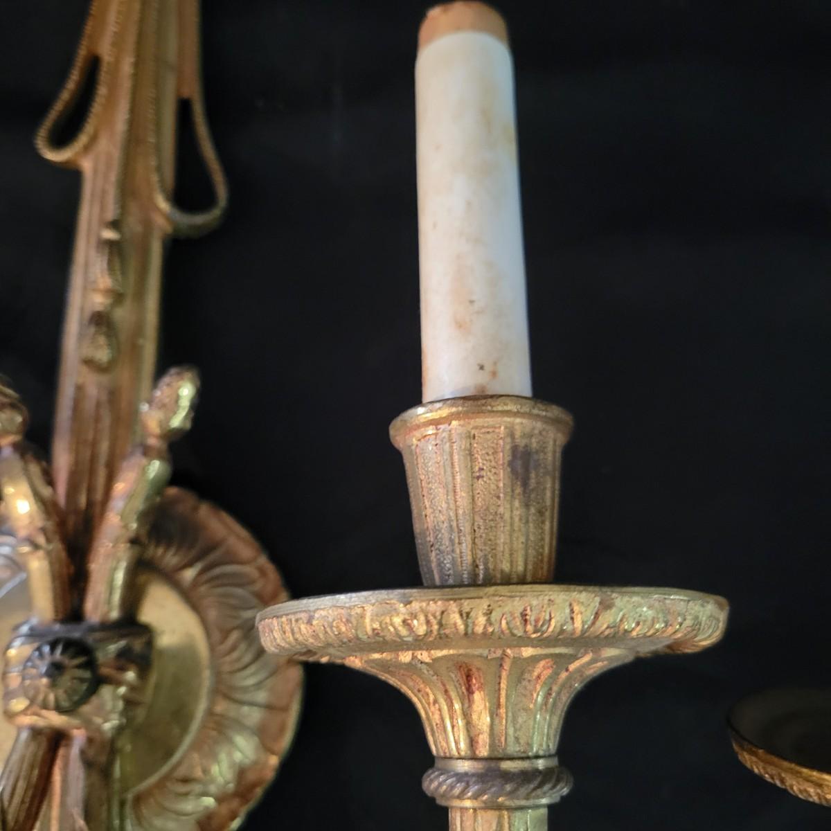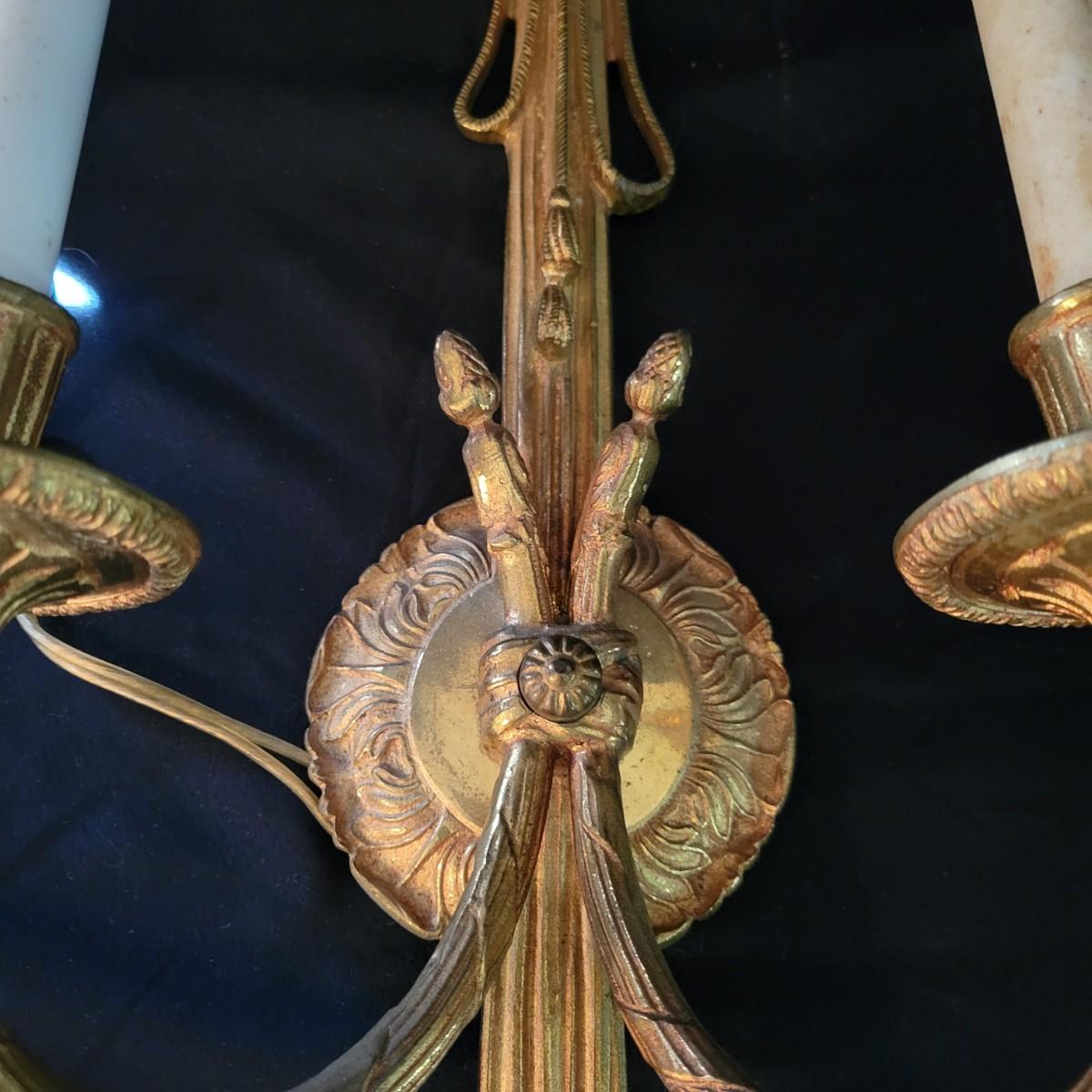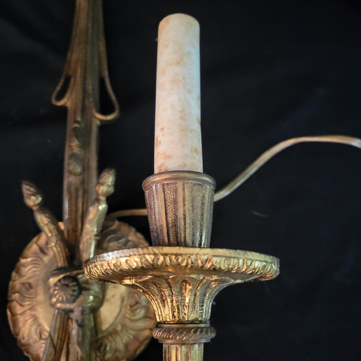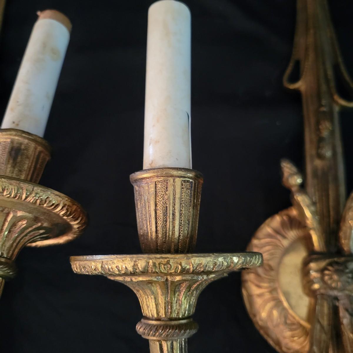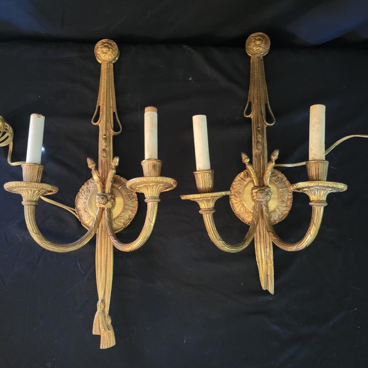 A pair of brass wall Sconces that could not be tested. They both have inline switches and have slightly different designs. The larger sconce on the left measures approximately 21.5" x 5.5" x 10.5"H. Shipping available