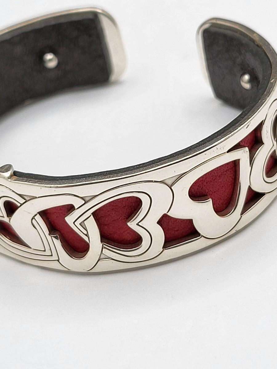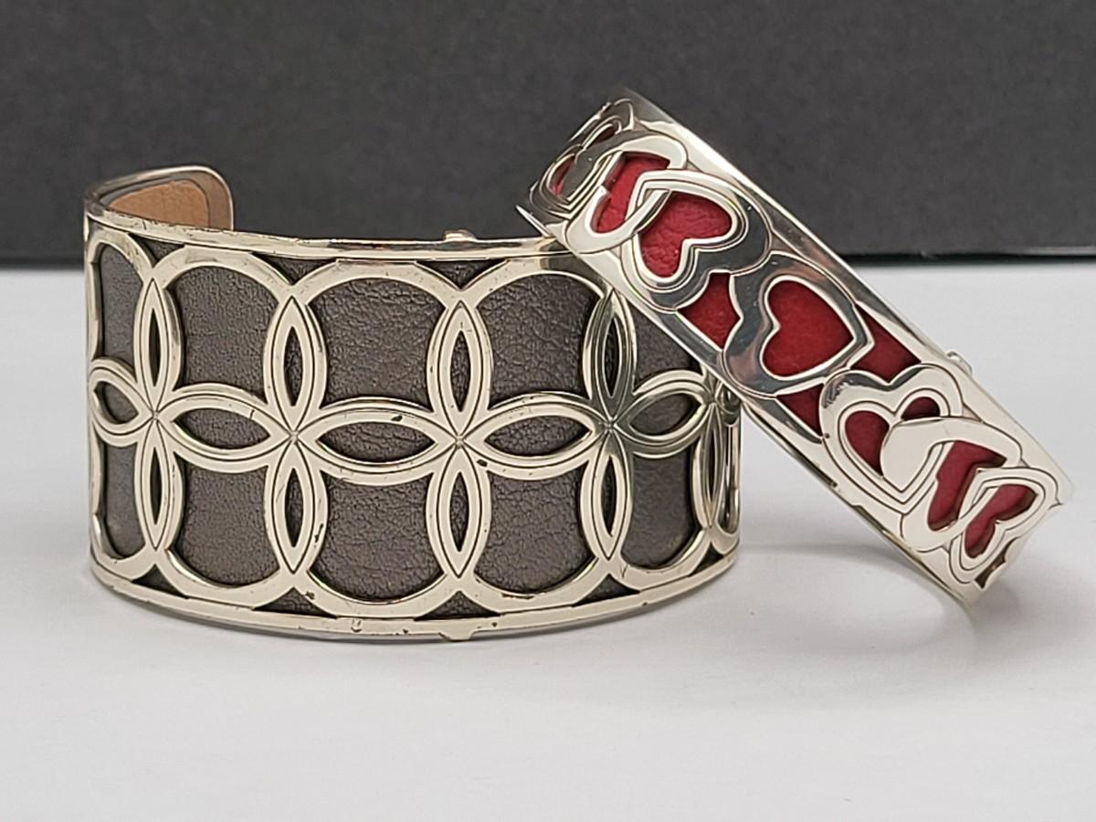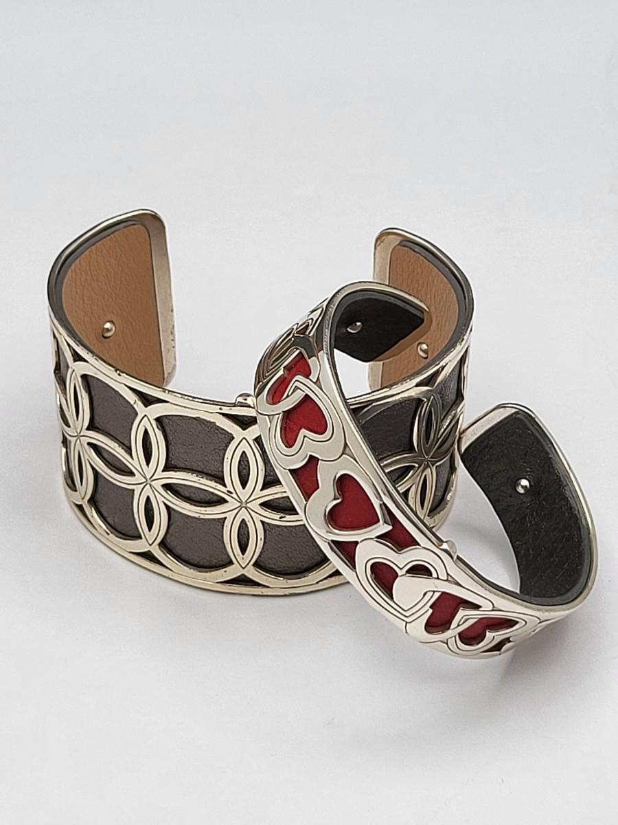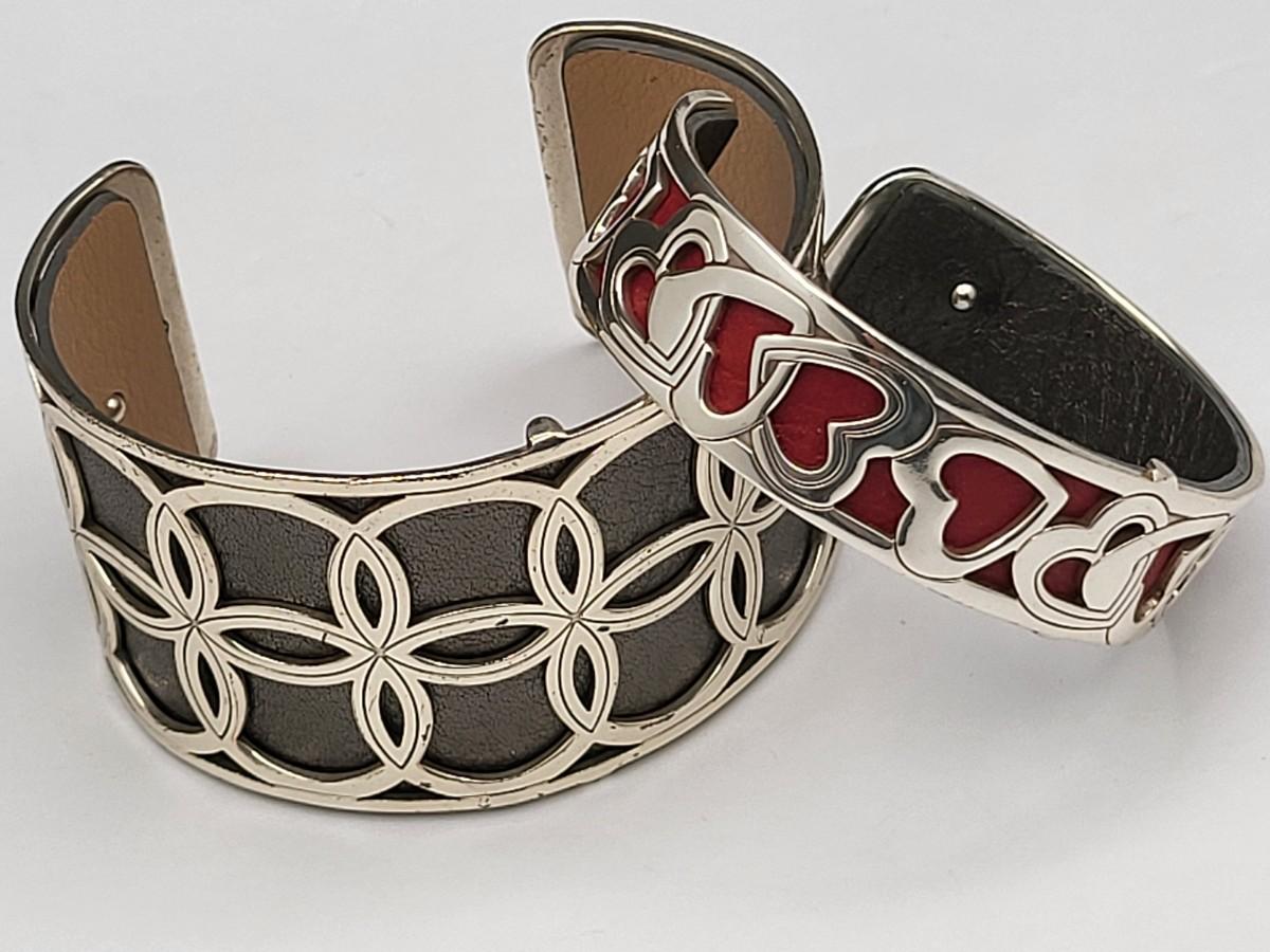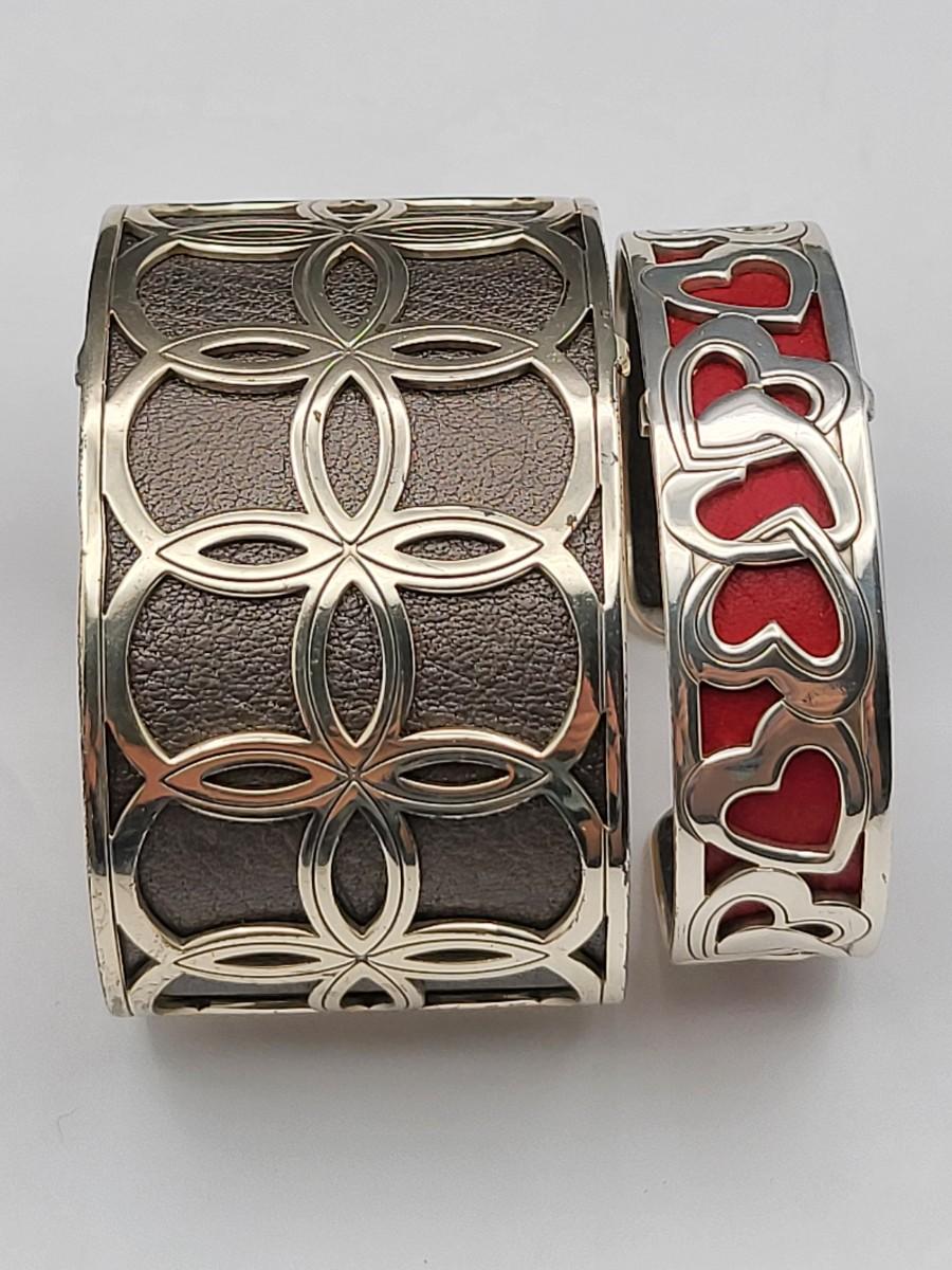 Brighton cuff, 1.5" wide with intertwined circles & brown leather. Hearts with red leather, is a little over .5" wide.