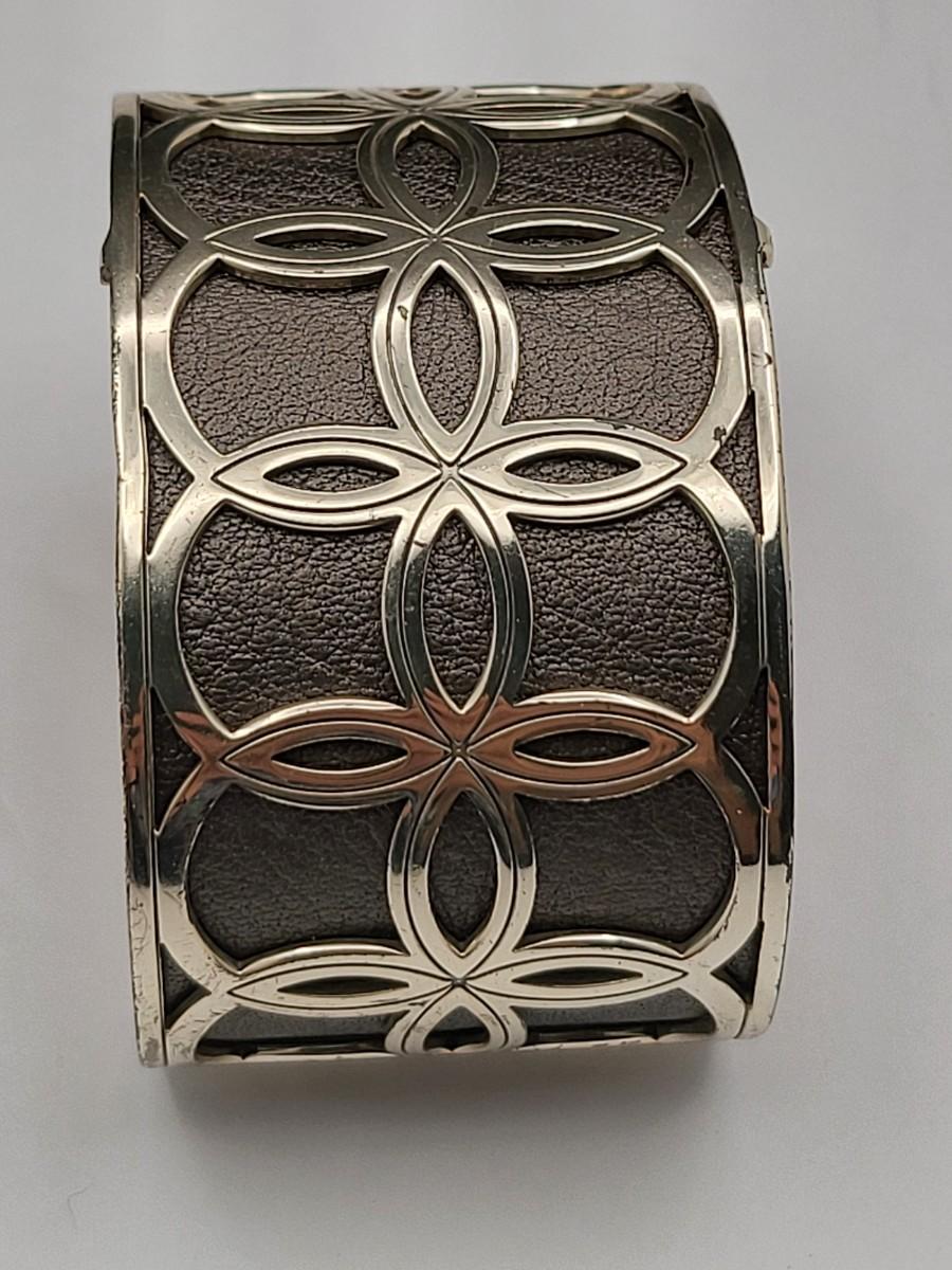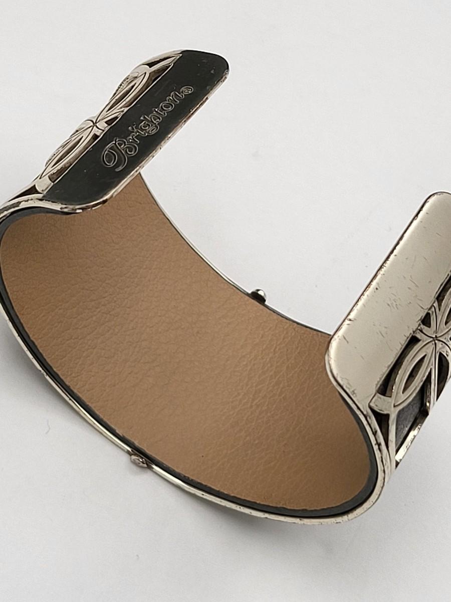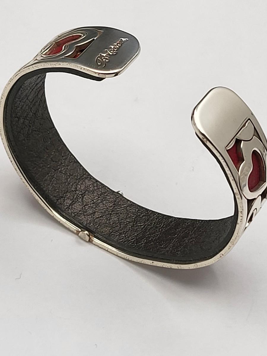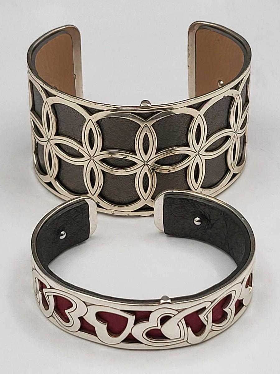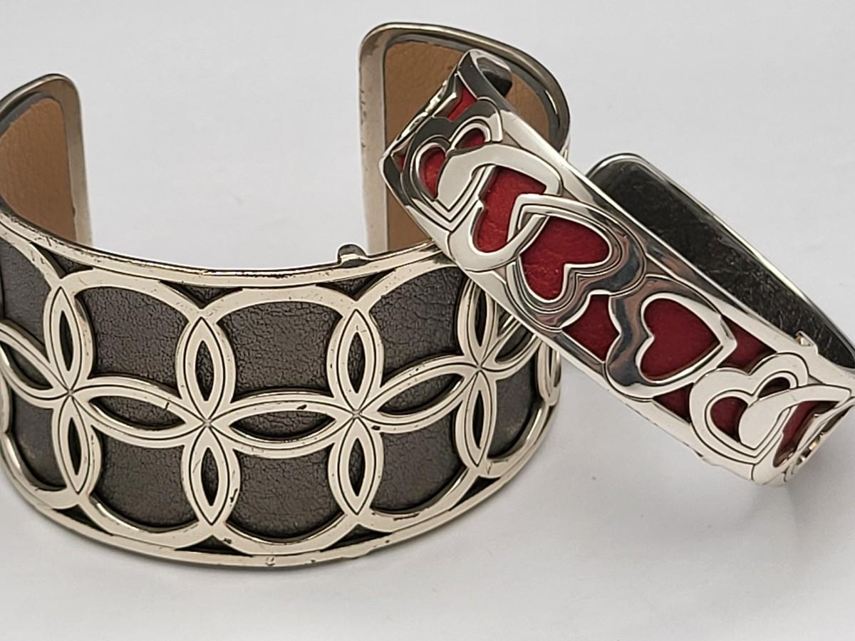 Brighton cuff, 1.5" wide with intertwined circles & brown leather. Hearts with red leather, is a little over .5" wide.