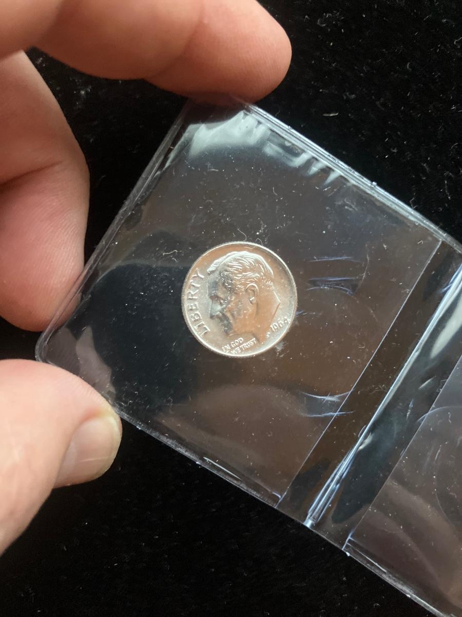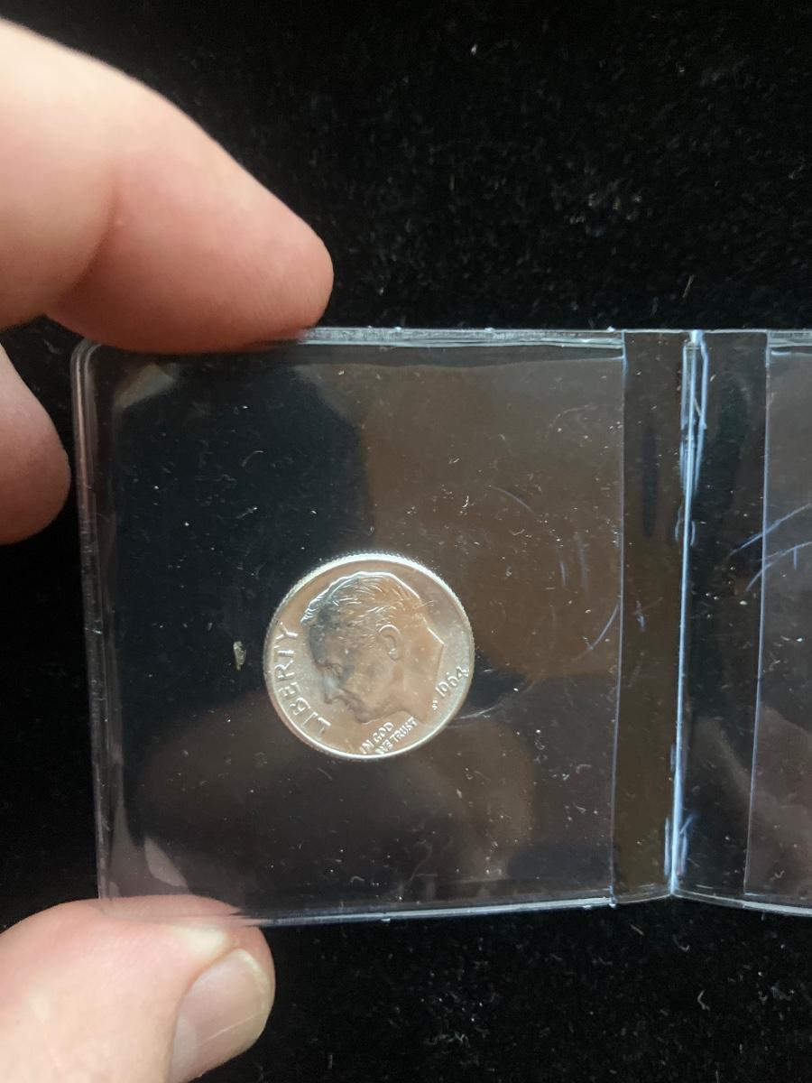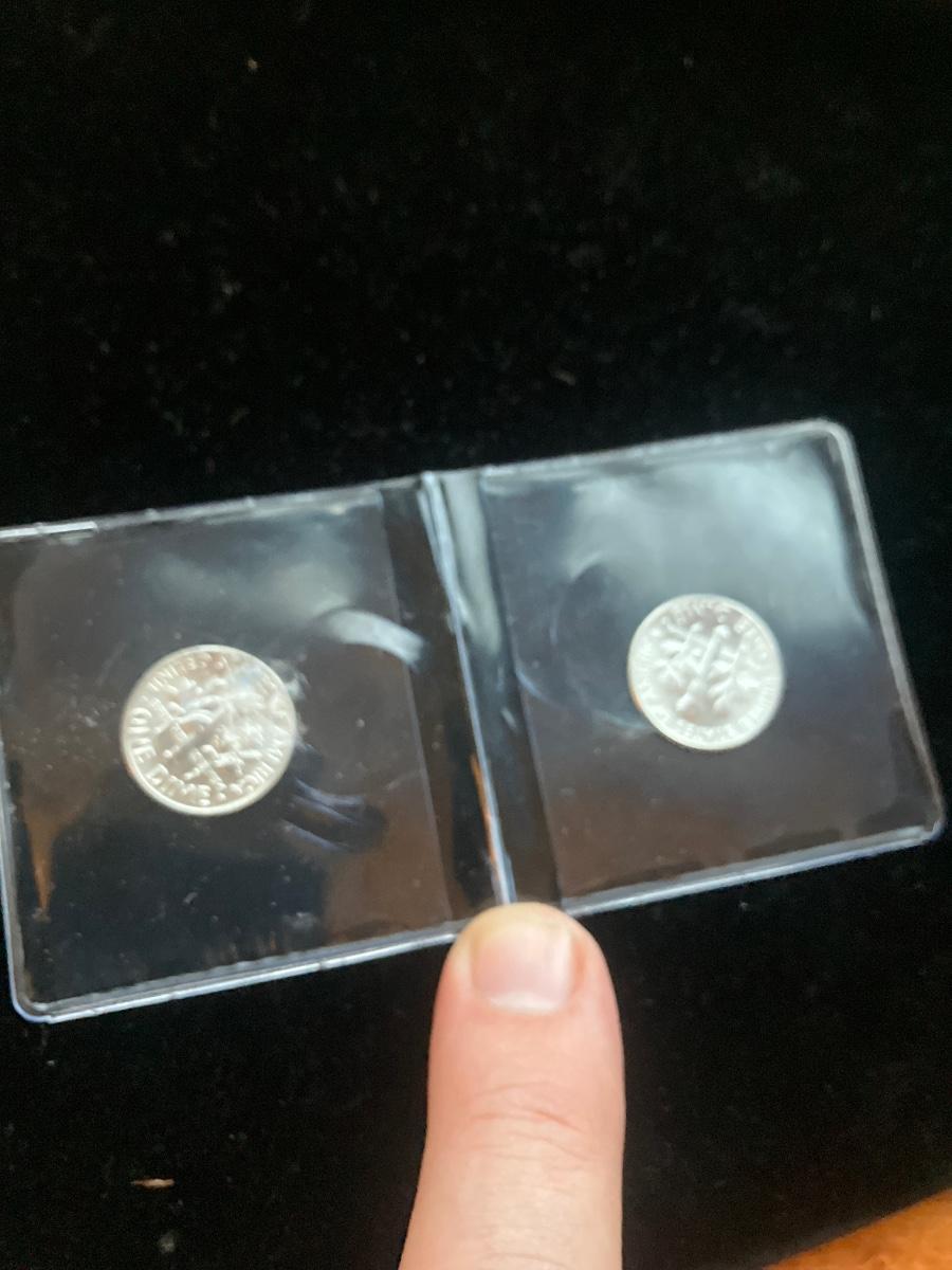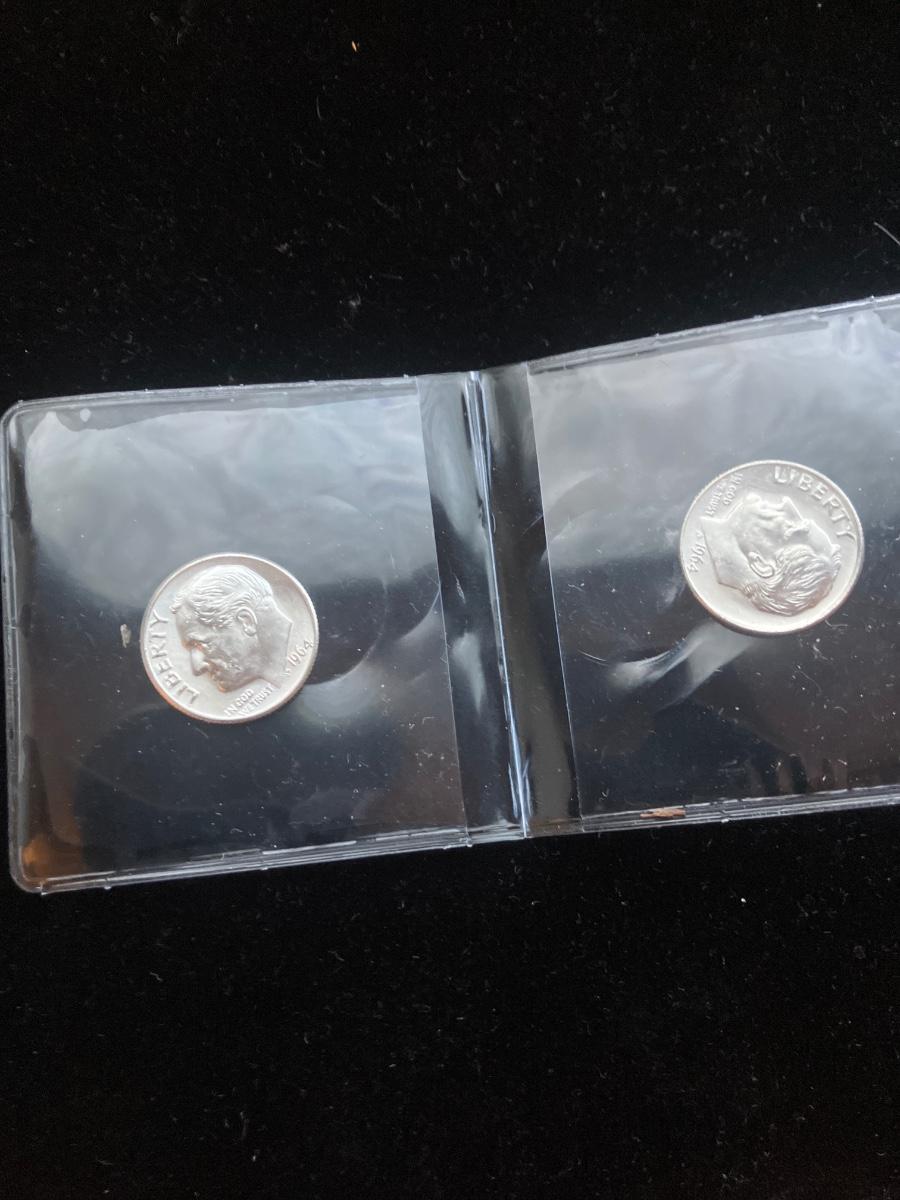 These are two 1964 Roosevelt dimes in sharp, original Brilliant Uncirculated condition with full mint luster and no toning or spotting. 1964 was the last year of 90% silver dimes, and these are clearly fresh, high-end examples pulled from a bank-wrapped roll years ago and carefully stored.