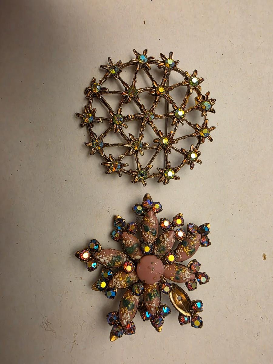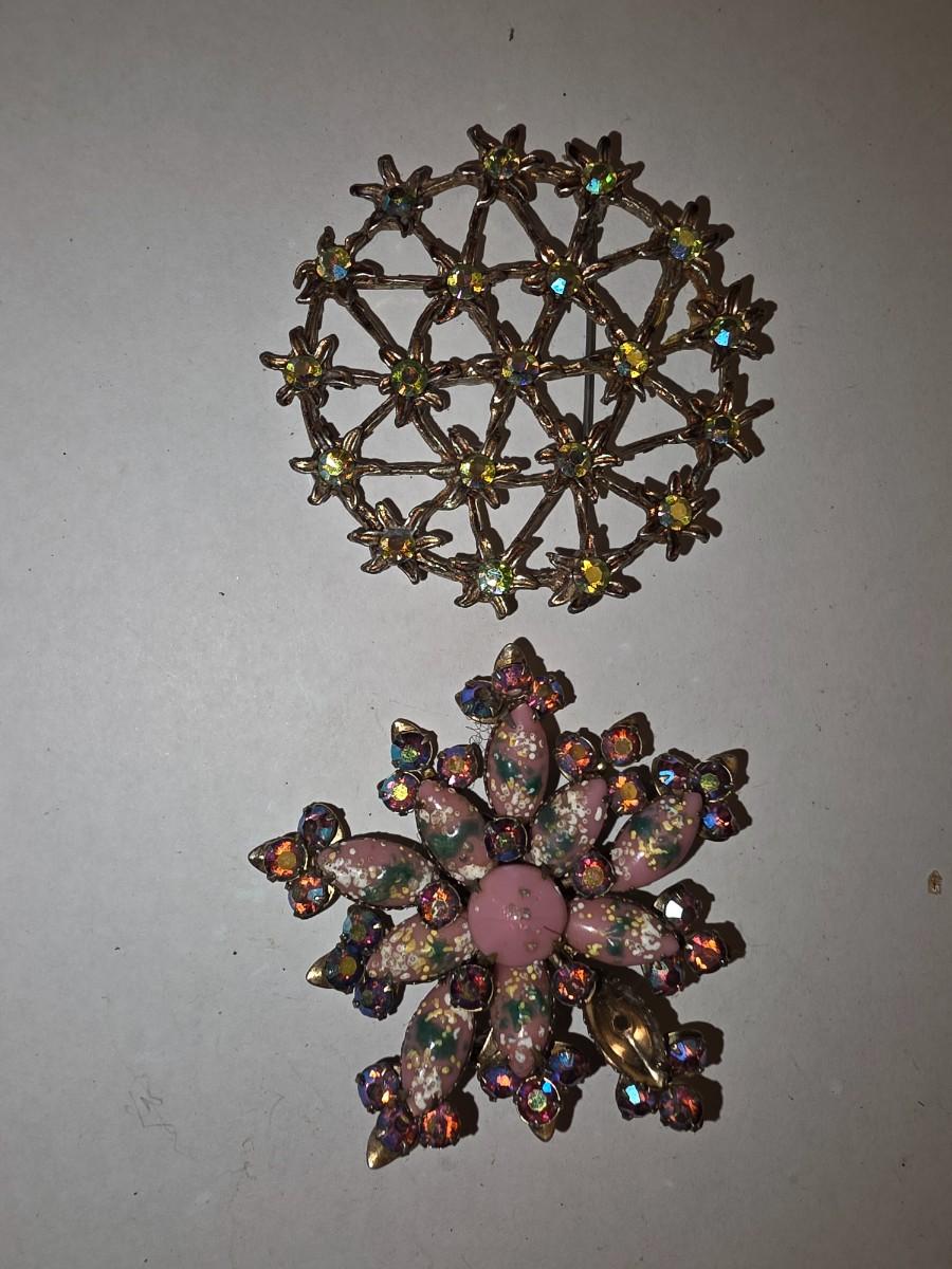 Little over 2 inches each in diameter. The pink one has a stonie missing. Gold back tones. Snowflake style