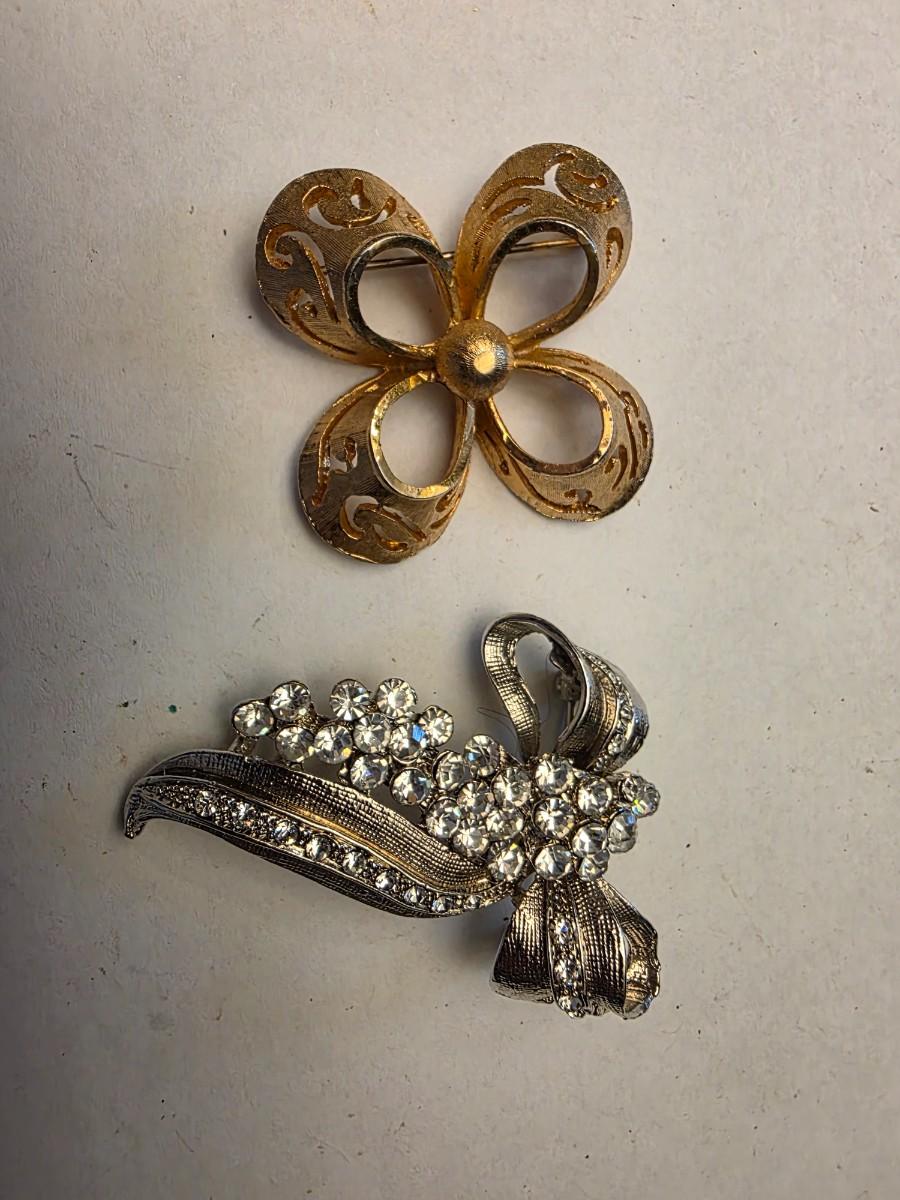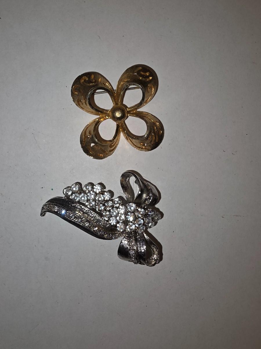 One gold tone and one is silver toned. Silver one has cubic zirconia and is a ribbon shape. 2inches tall each