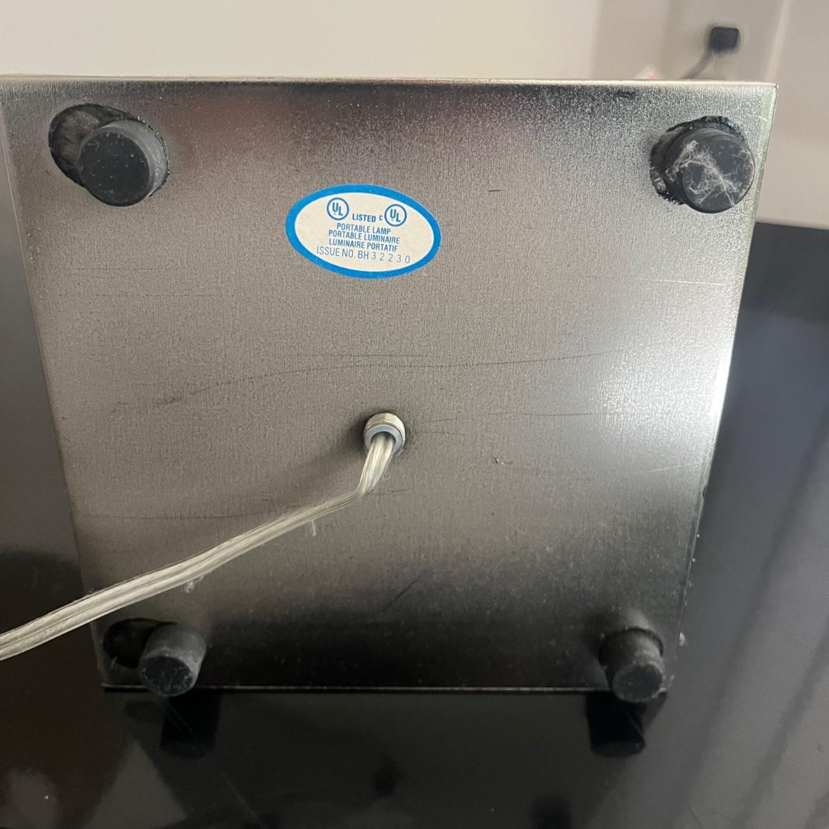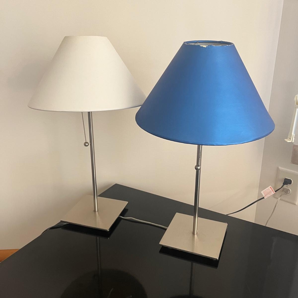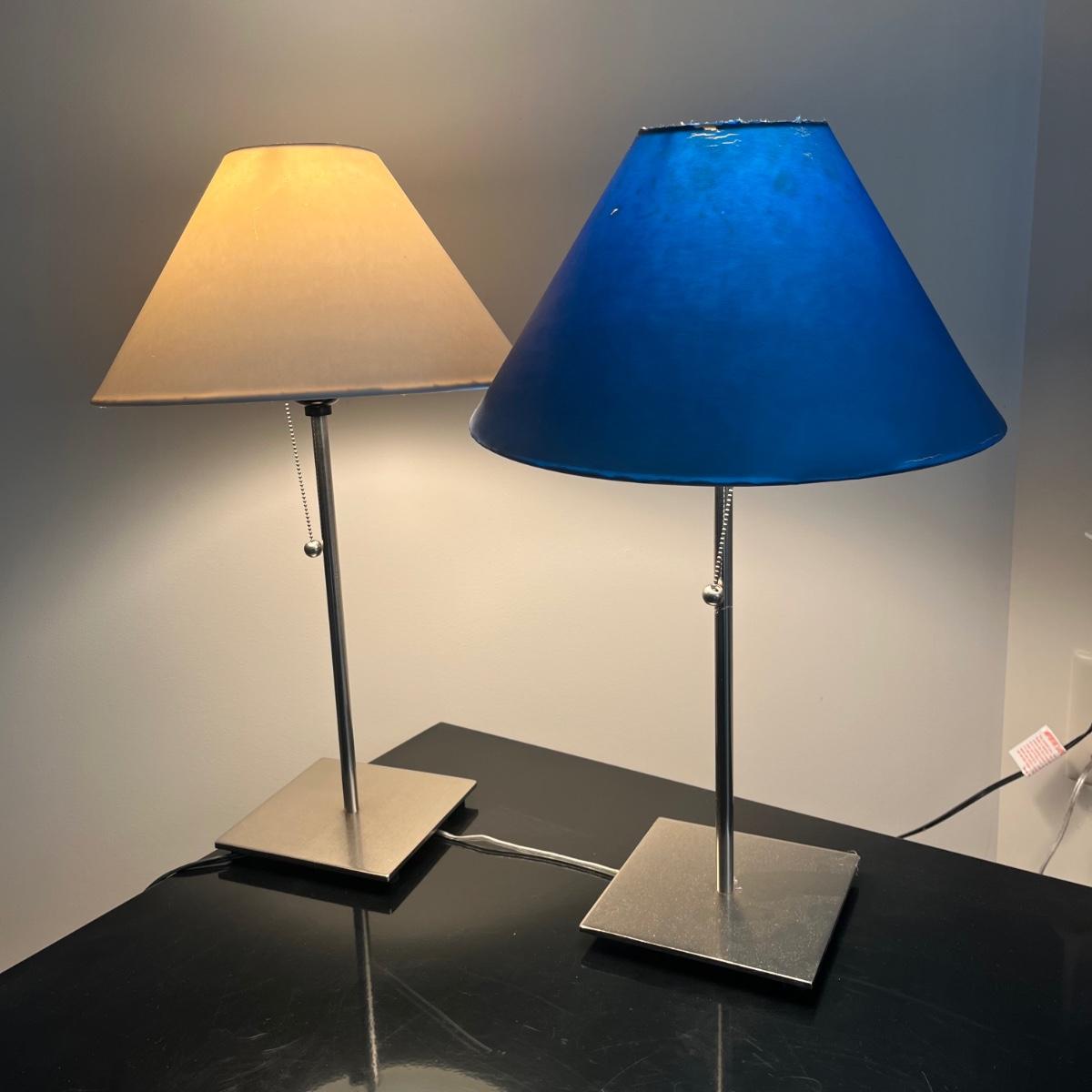 Lot includes two brushed stainless steel table lamps. Both lamps turned on when plugged in. Lamps measure 12”D x 20.5”H. There is some wear on the blue lamp shade.