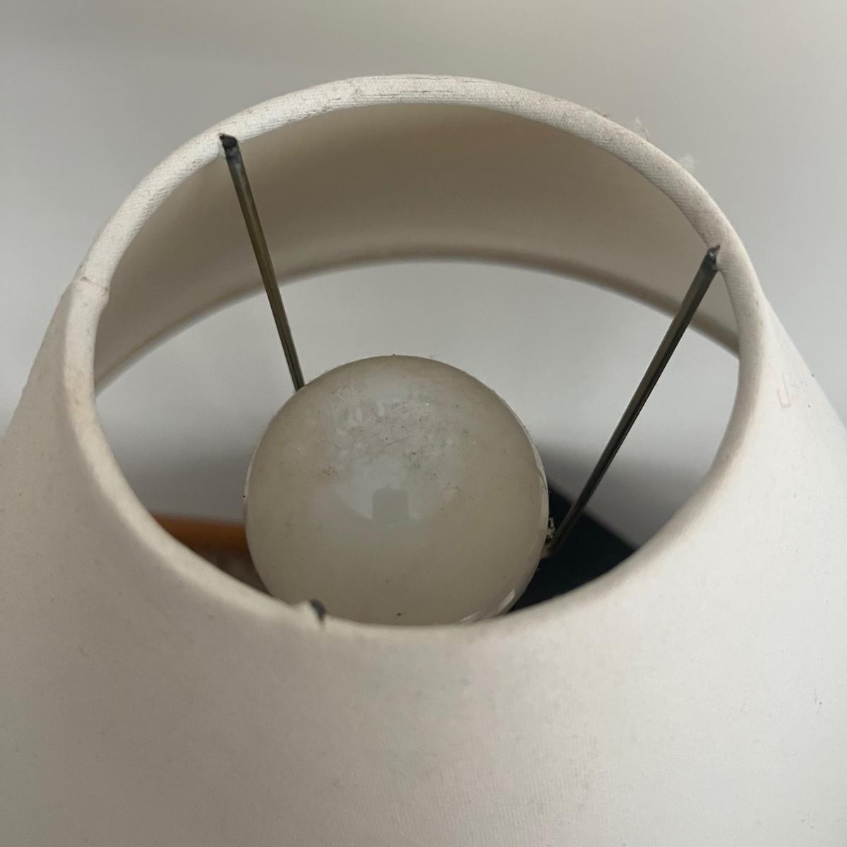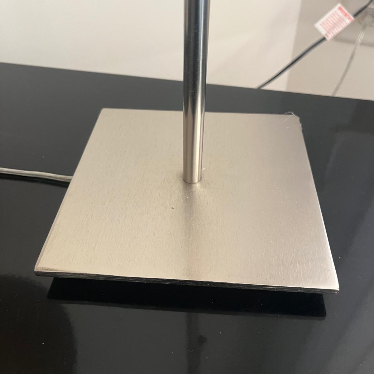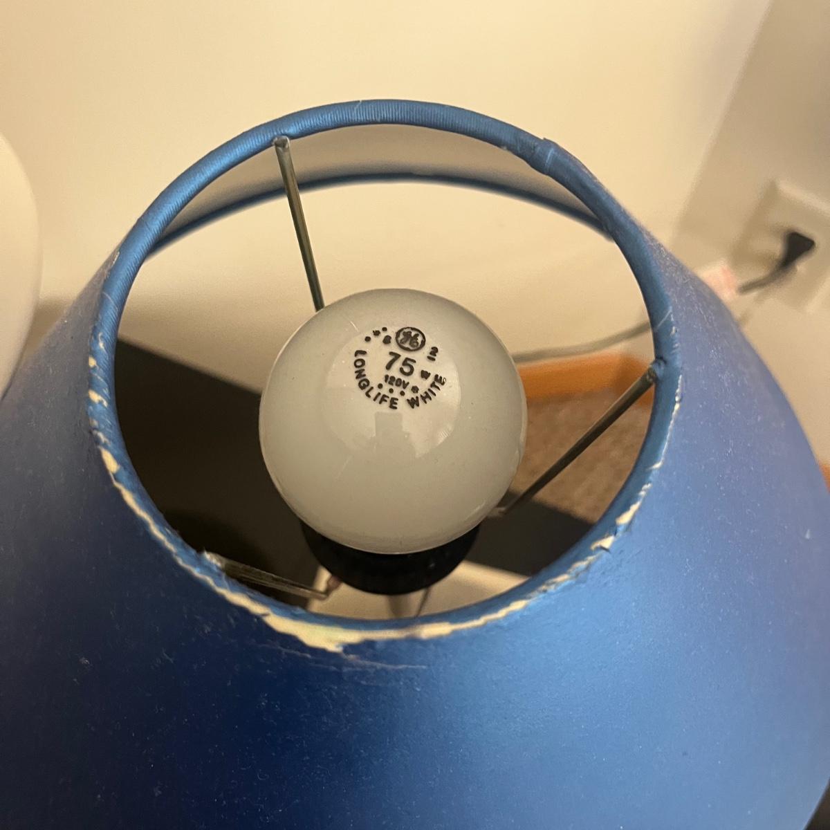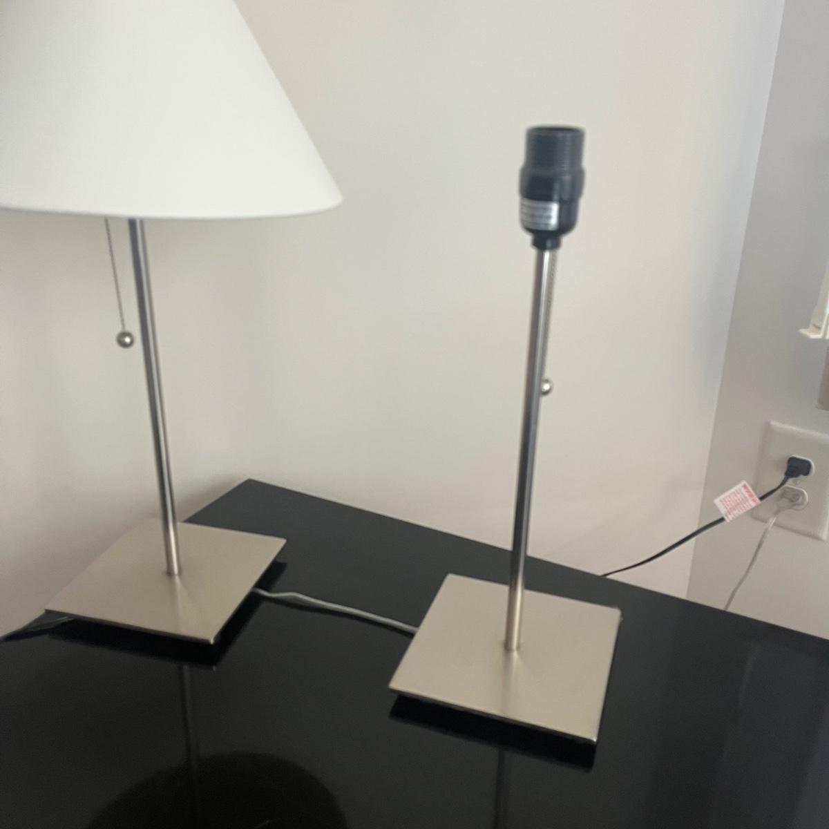 Lot includes two brushed stainless steel table lamps. Both lamps turned on when plugged in. Lamps measure 12”D x 20.5”H. There is some wear on the blue lamp shade.