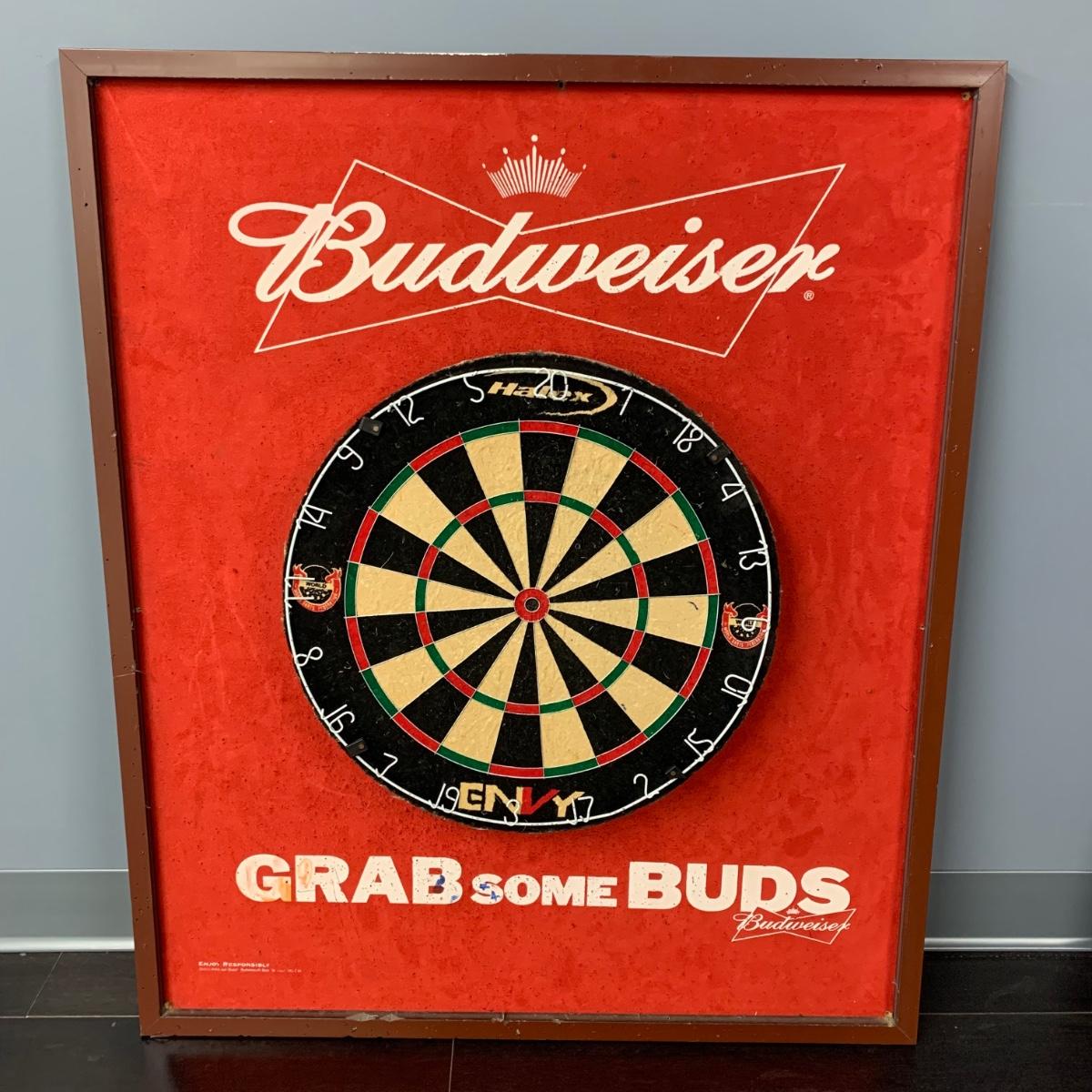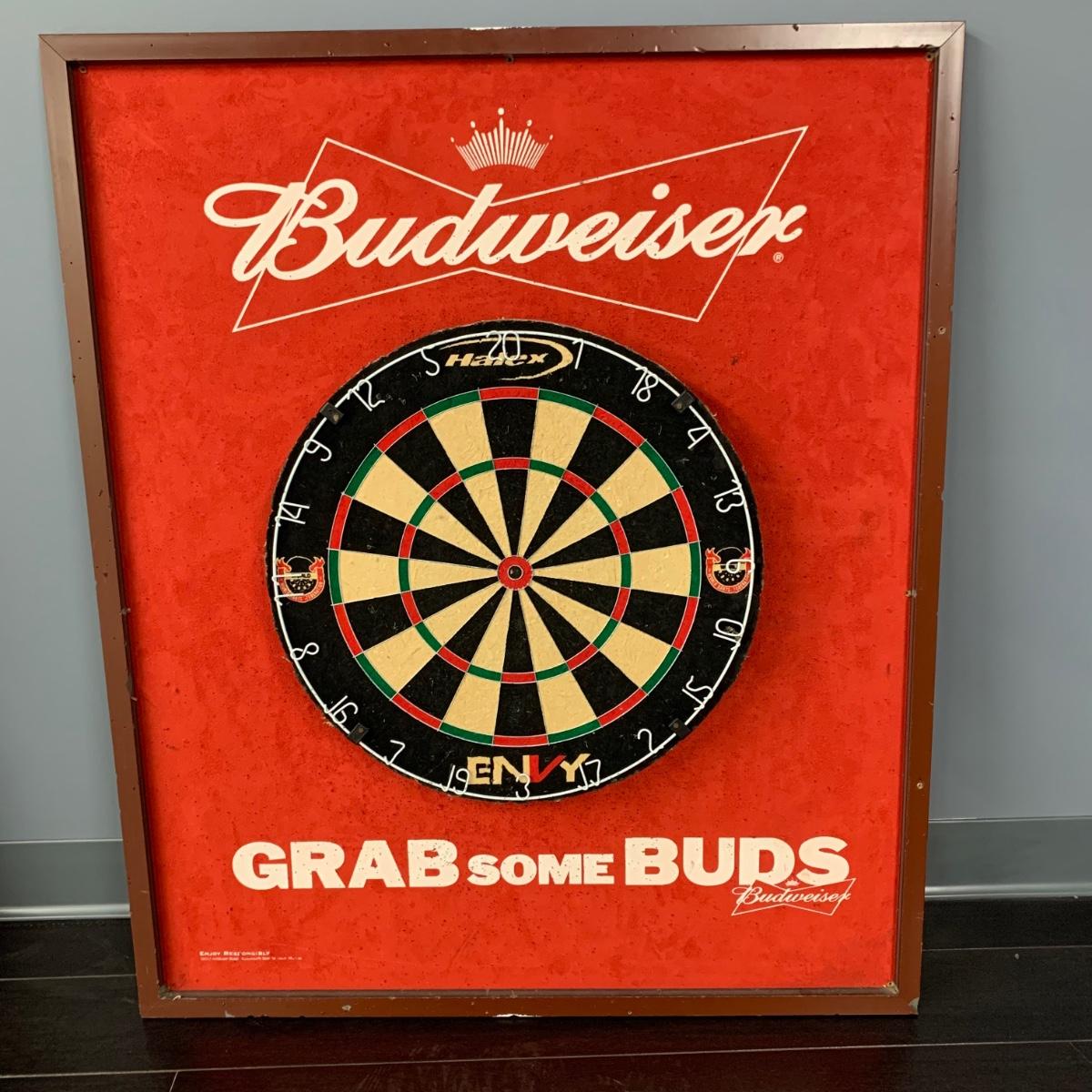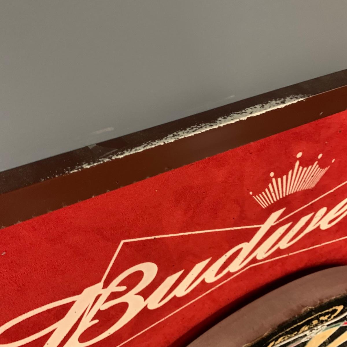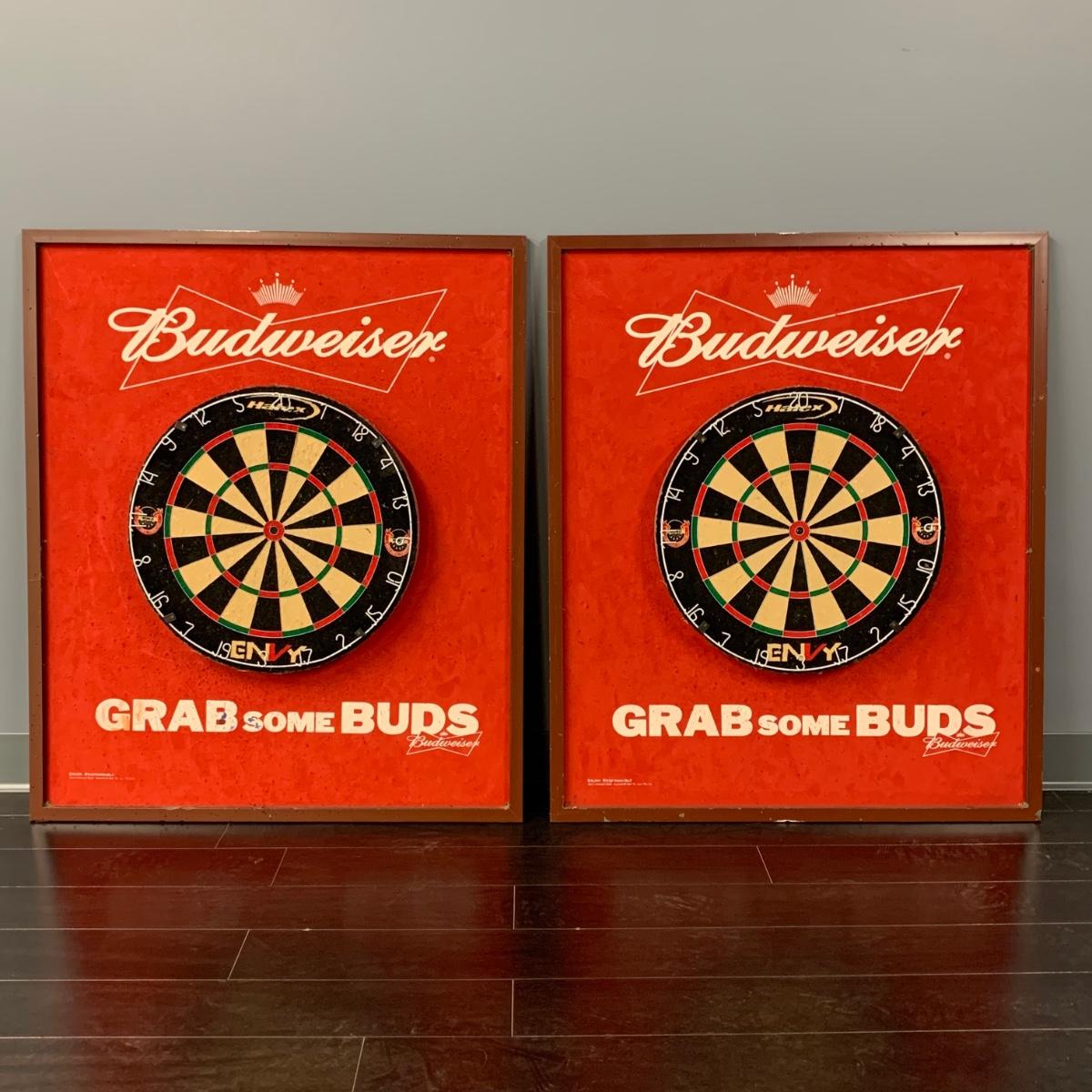 Two matching Budweiser dartboards with frames that each measure 31.25” x 37”. Holes are seen on the boards as evidence of the many games of darts that have been played on them. They each have some chips and paint on their frames. One dart boars does have some marker ink on the text, see attached pictures. The wire with numbers on one of the boards is slightly bent. Both have hardware on the back for hanging on the wall. The red backgrounds have a soft suede feel. Local pickup only.