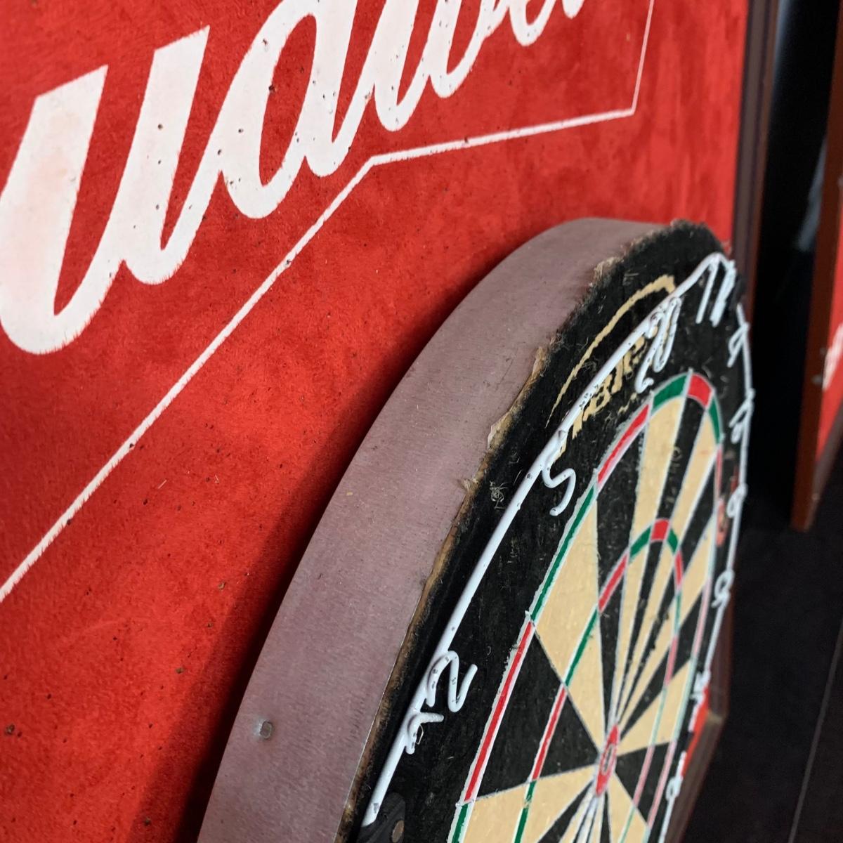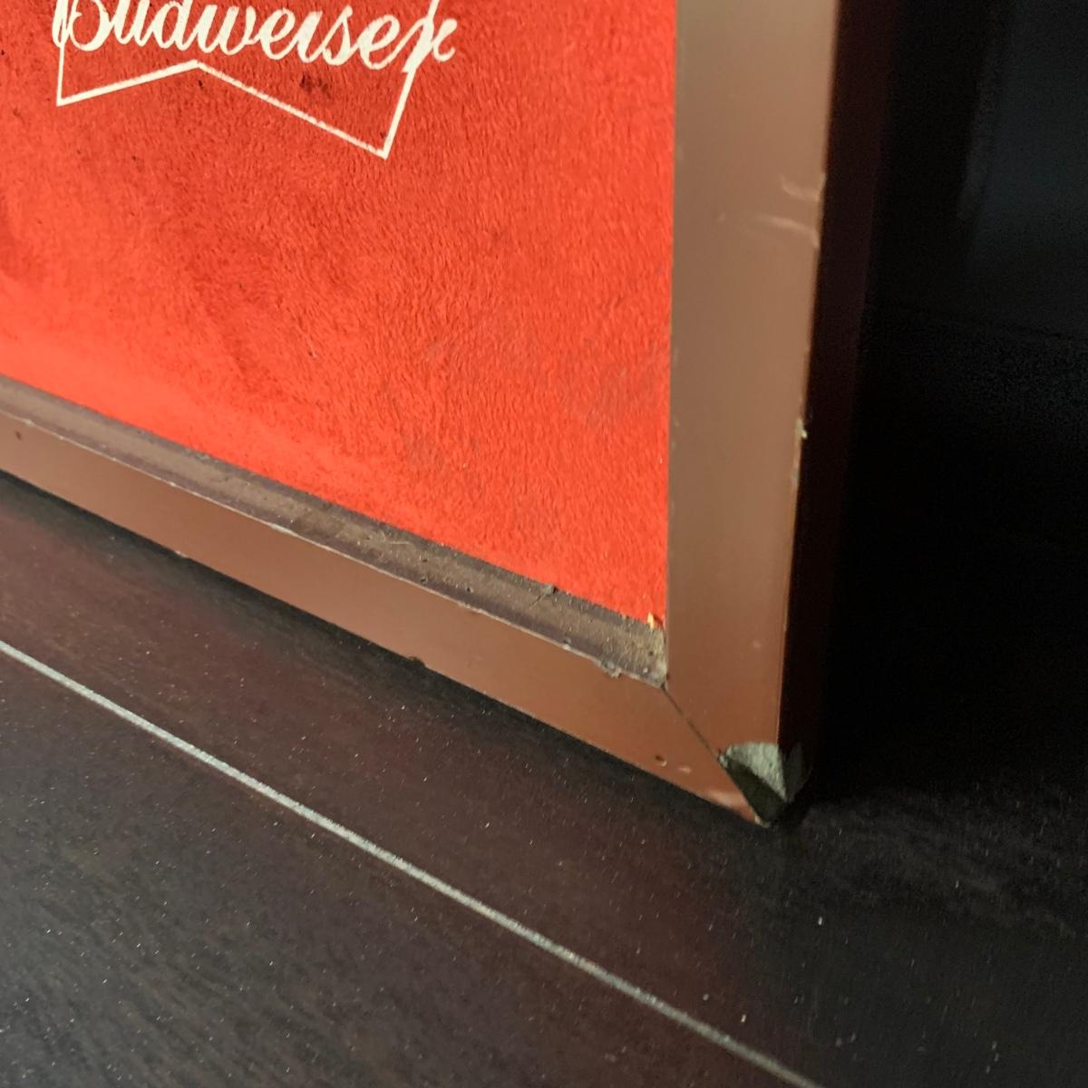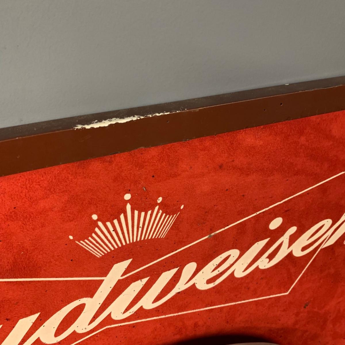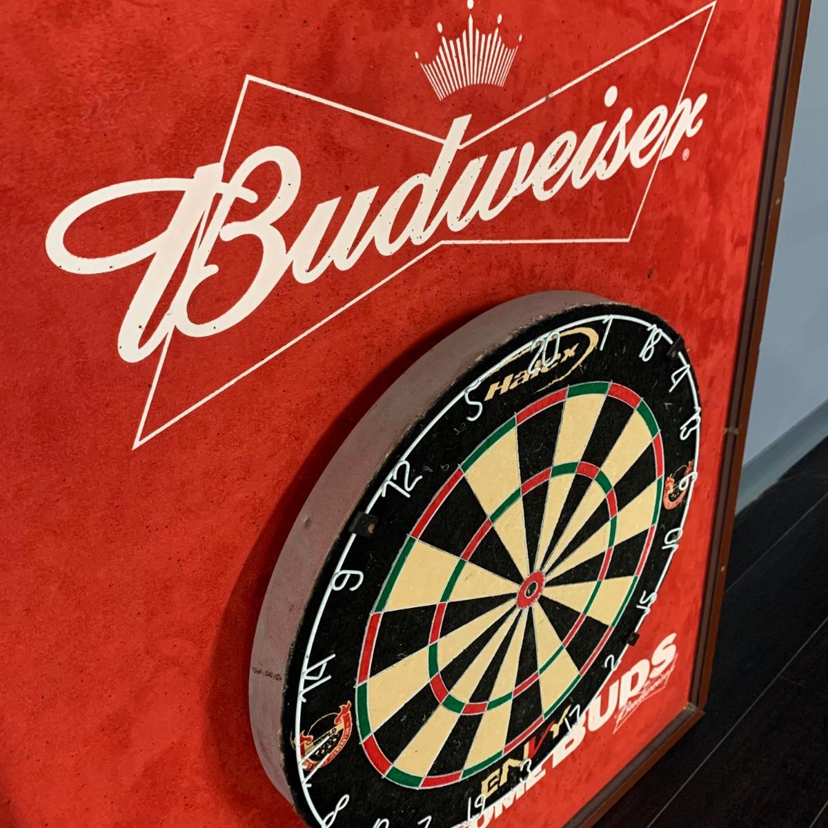 Two matching Budweiser dartboards with frames that each measure 31.25” x 37”. Holes are seen on the boards as evidence of the many games of darts that have been played on them. They each have some chips and paint on their frames. One dart boars does have some marker ink on the text, see attached pictures. The wire with numbers on one of the boards is slightly bent. Both have hardware on the back for hanging on the wall. The red backgrounds have a soft suede feel. Local pickup only.