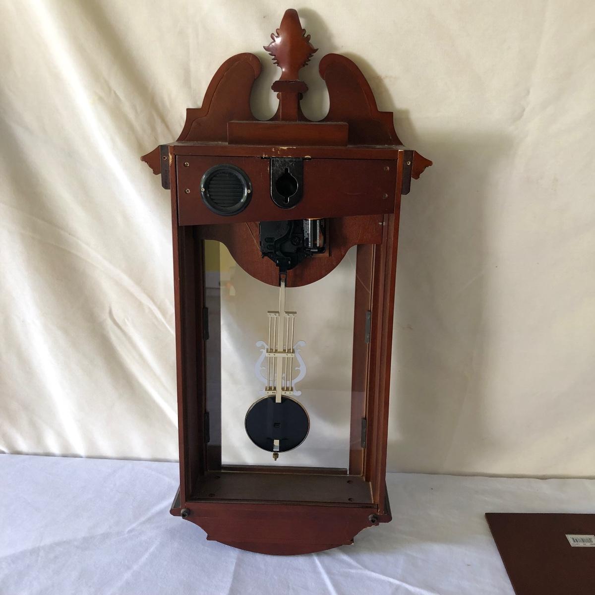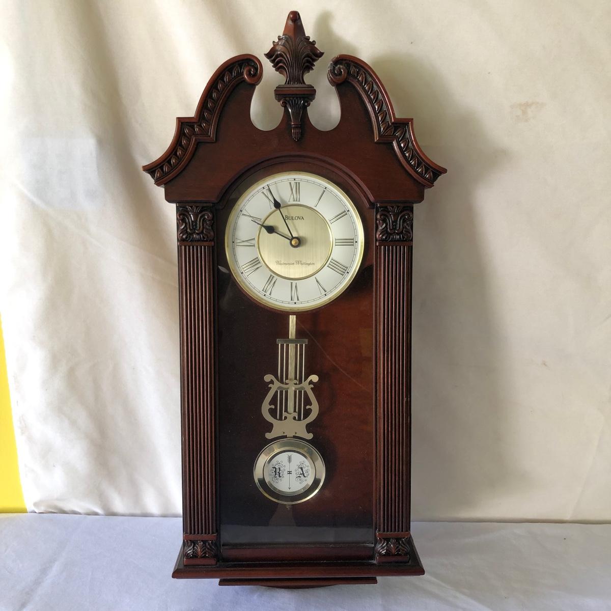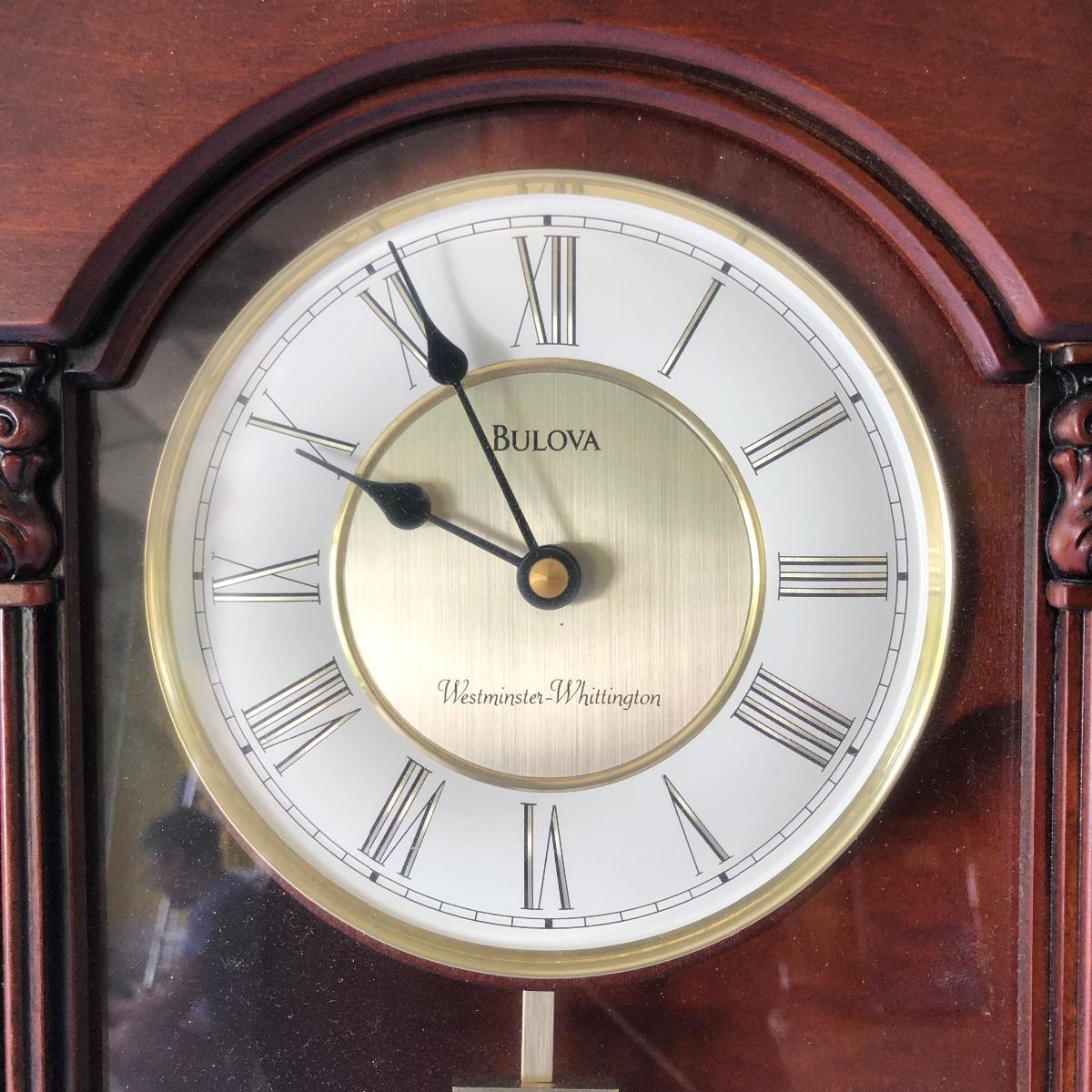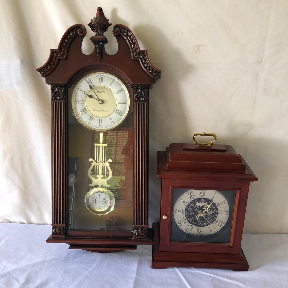 Lot includes two Bulova Clocks. One clock is a wall mounted clock with pendulum and the second one is a mantle or desk clock. Both clocks are MDF with plexiglass fronts and both were not tested as batteries were dead. Wall clock measures 4” x 13” x 27.5”.