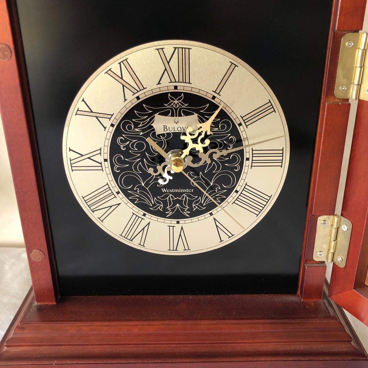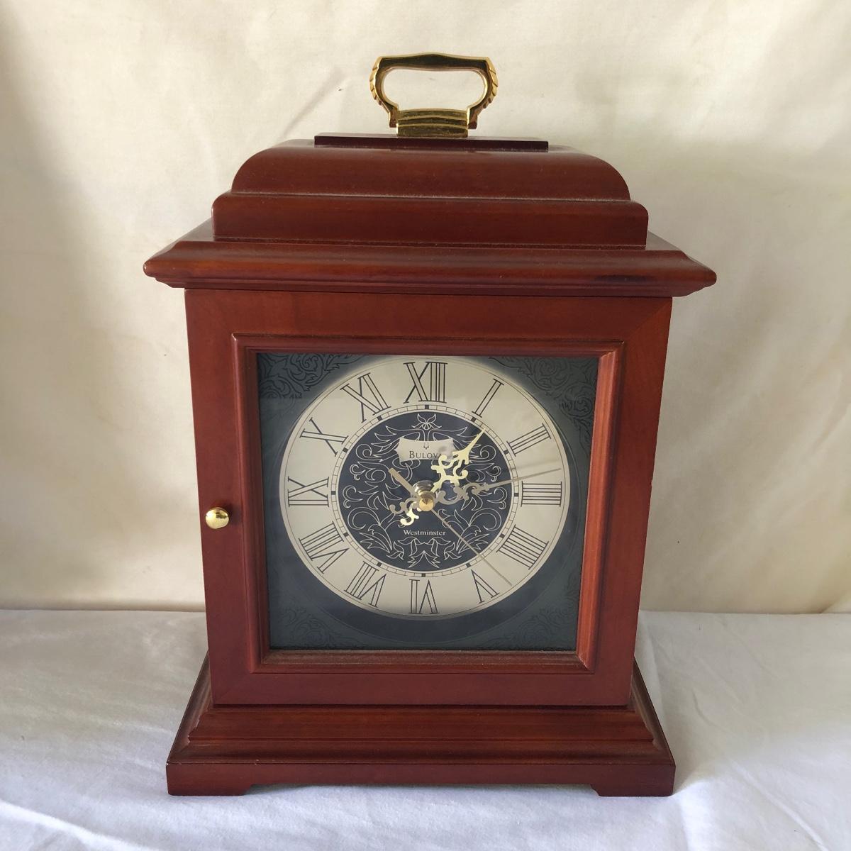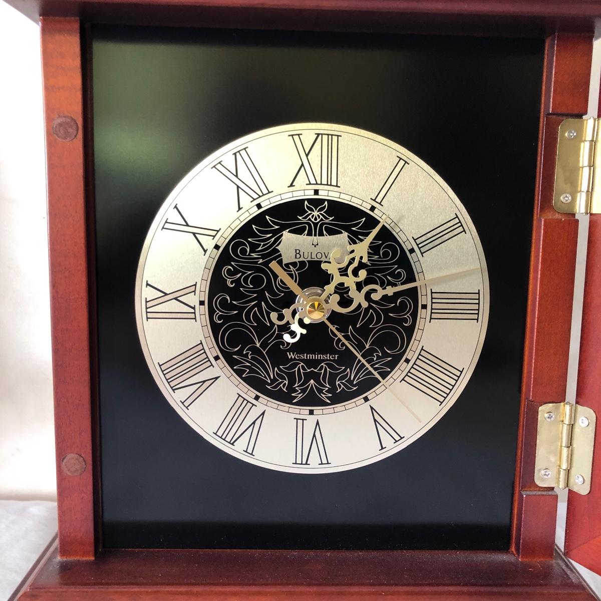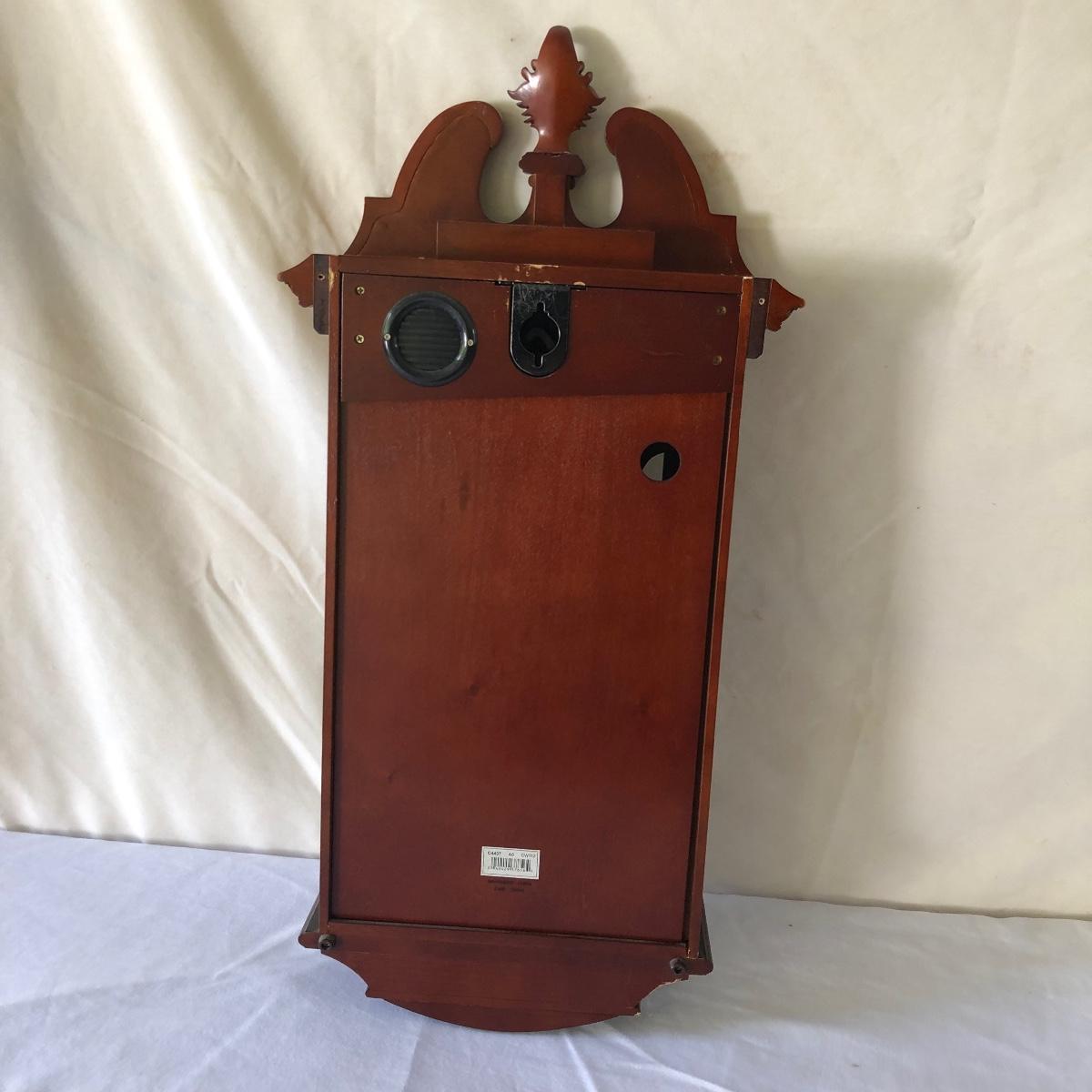 Lot includes two Bulova Clocks. One clock is a wall mounted clock with pendulum and the second one is a mantle or desk clock. Both clocks are MDF with plexiglass fronts and both were not tested as batteries were dead. Wall clock measures 4” x 13” x 27.5”.