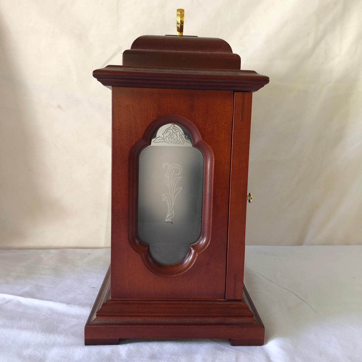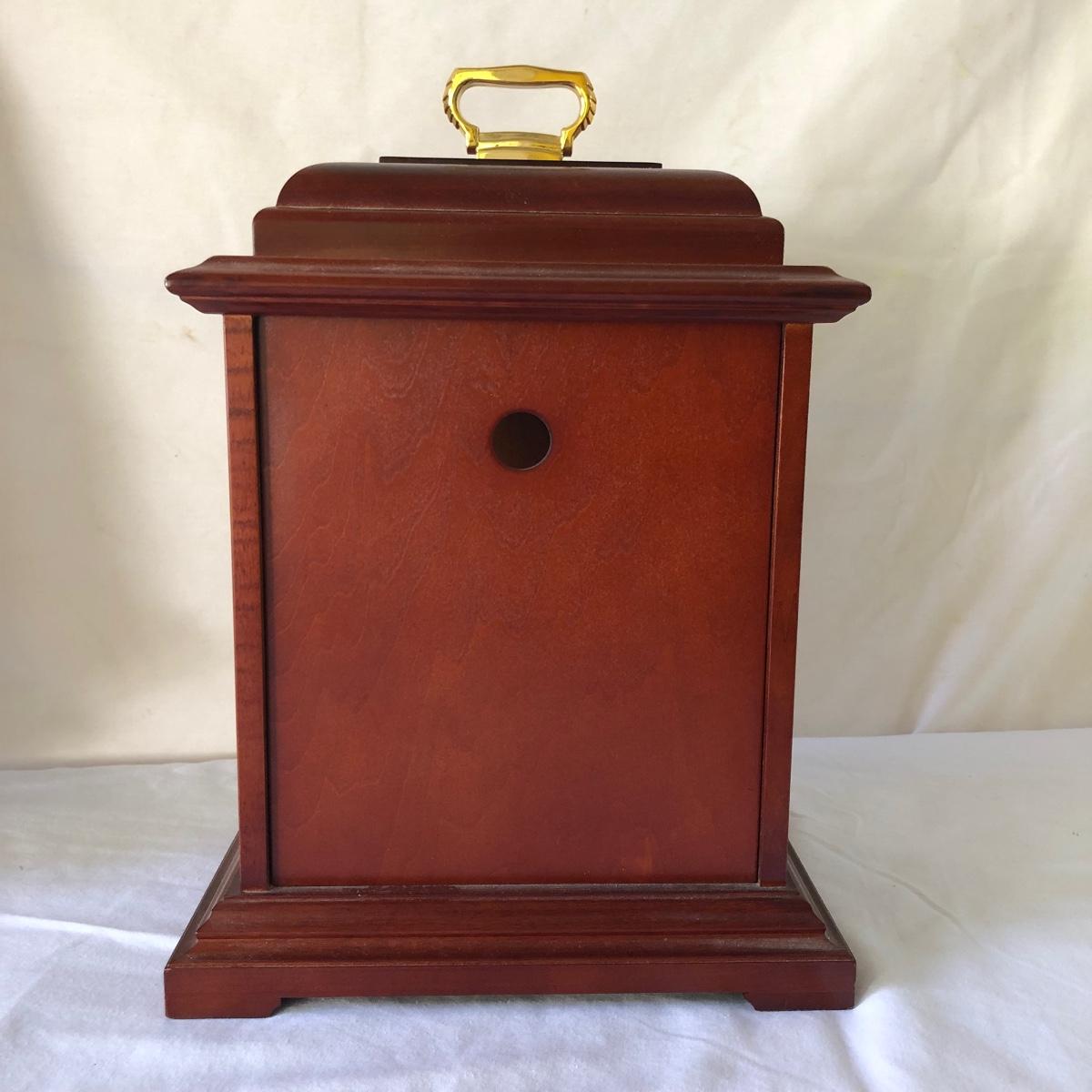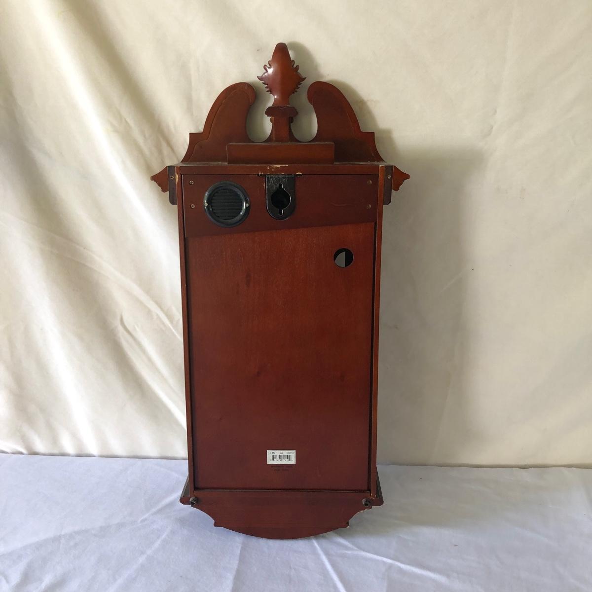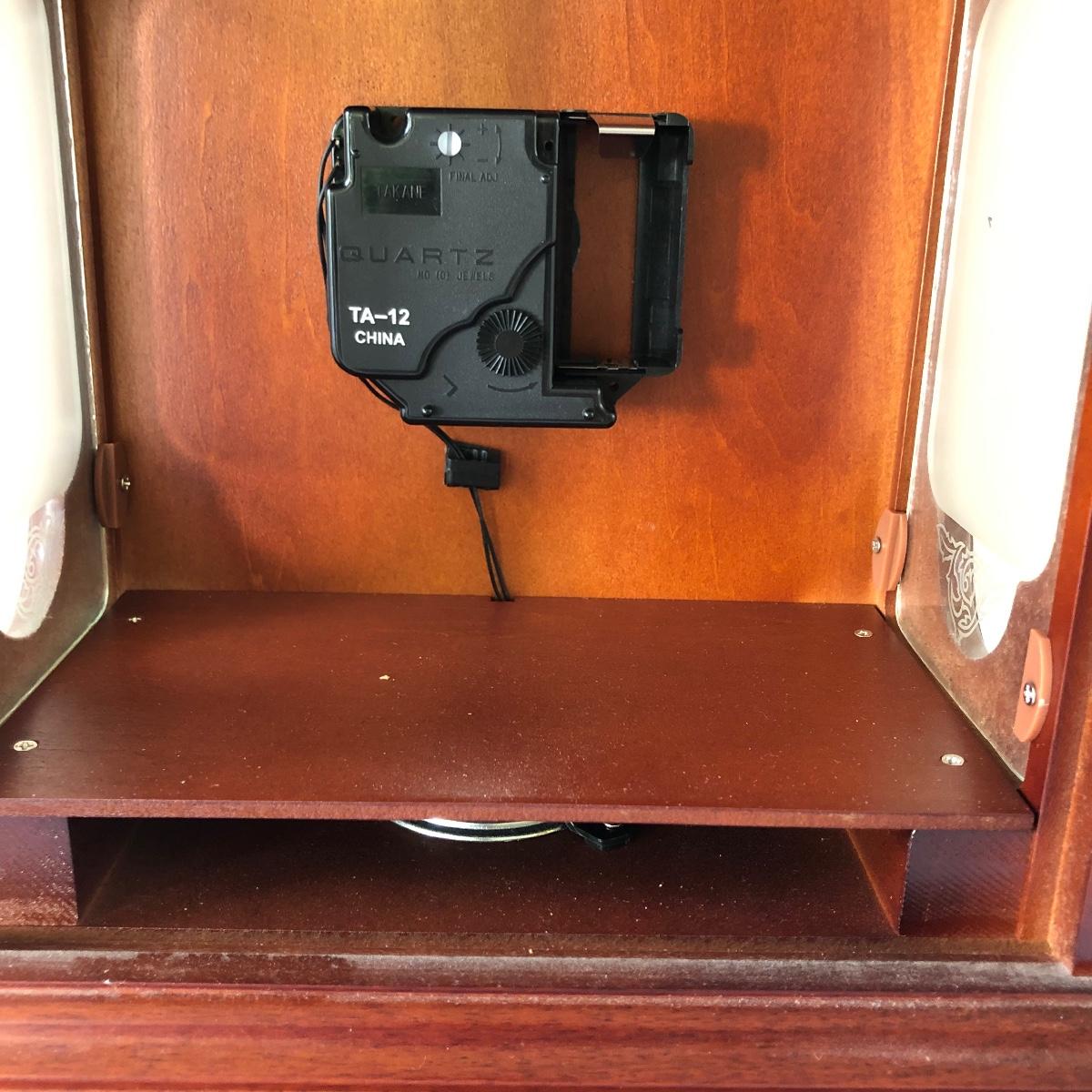 Lot includes two Bulova Clocks. One clock is a wall mounted clock with pendulum and the second one is a mantle or desk clock. Both clocks are MDF with plexiglass fronts and both were not tested as batteries were dead. Wall clock measures 4” x 13” x 27.5”.