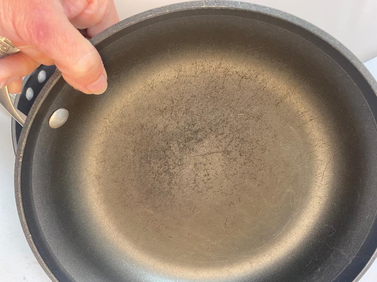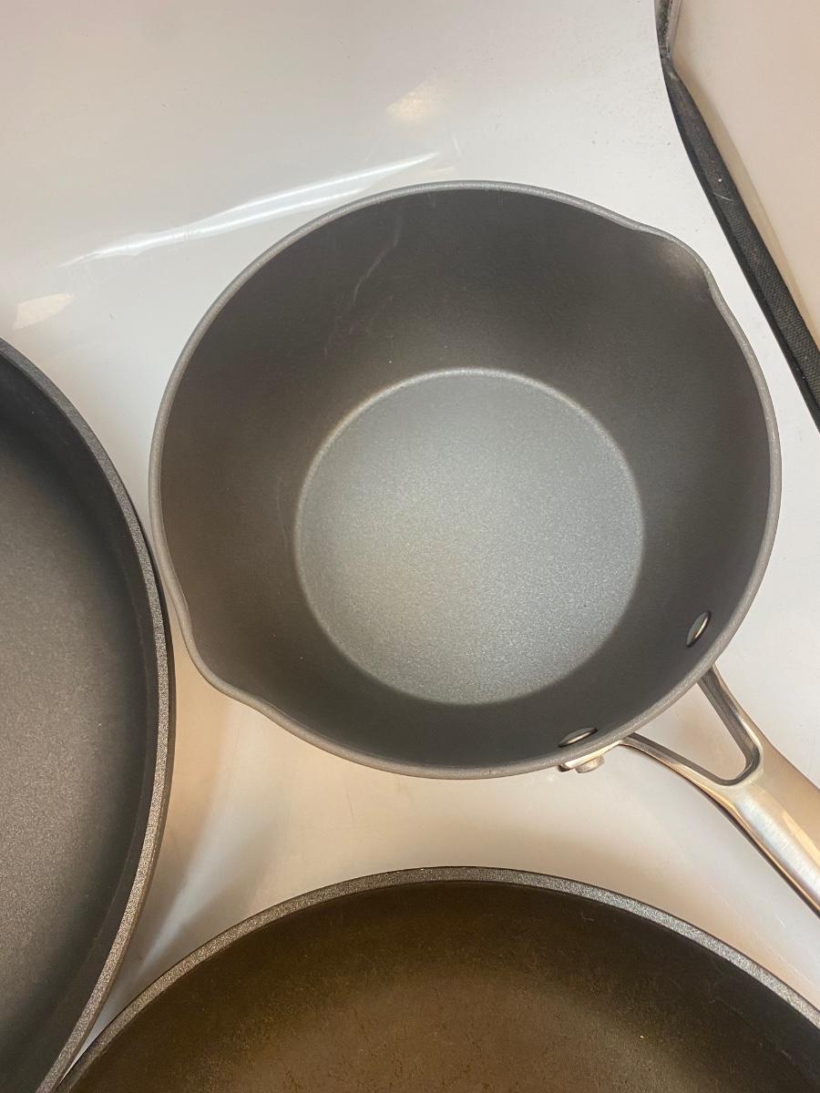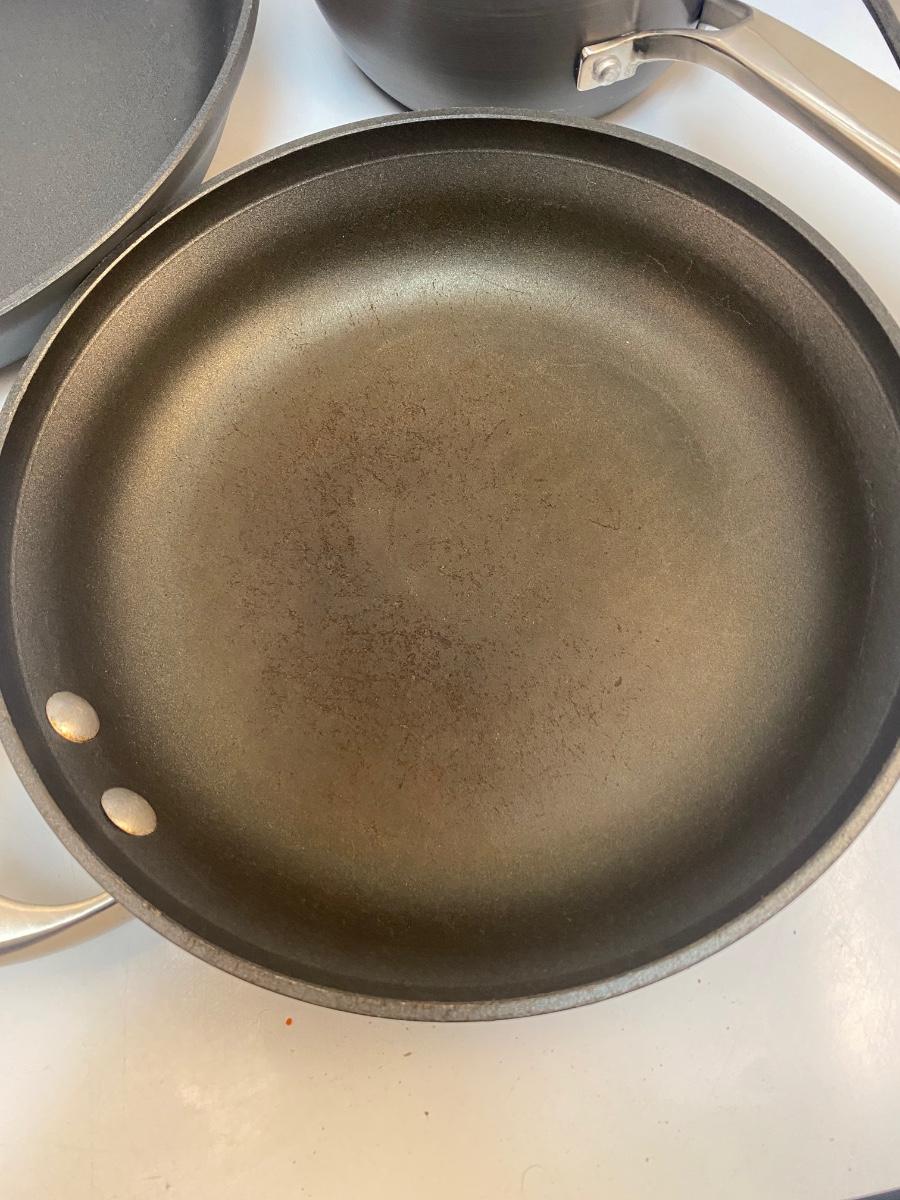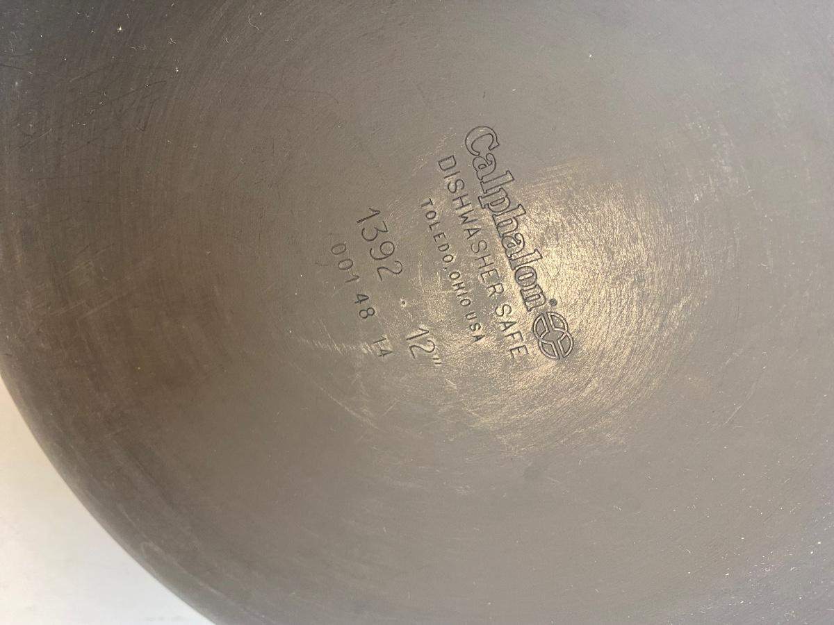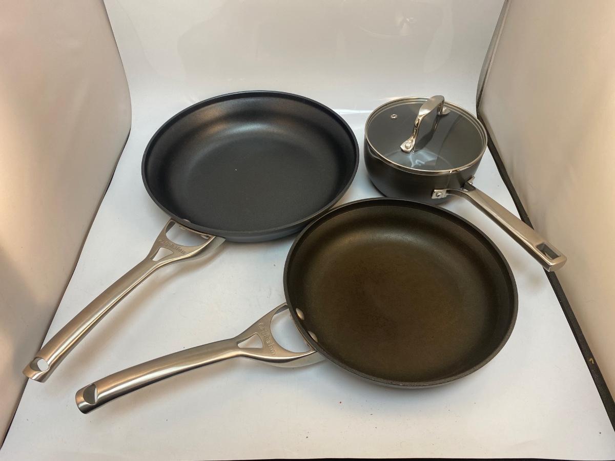 Pair of Calphalon Frying Pans & Salt Saucepan with Glass Lid. 10" & 12" pans, 1.5qt saucepan. Previously used, the 10" shows signs of use. Salt pan is in the better condition of the three.
