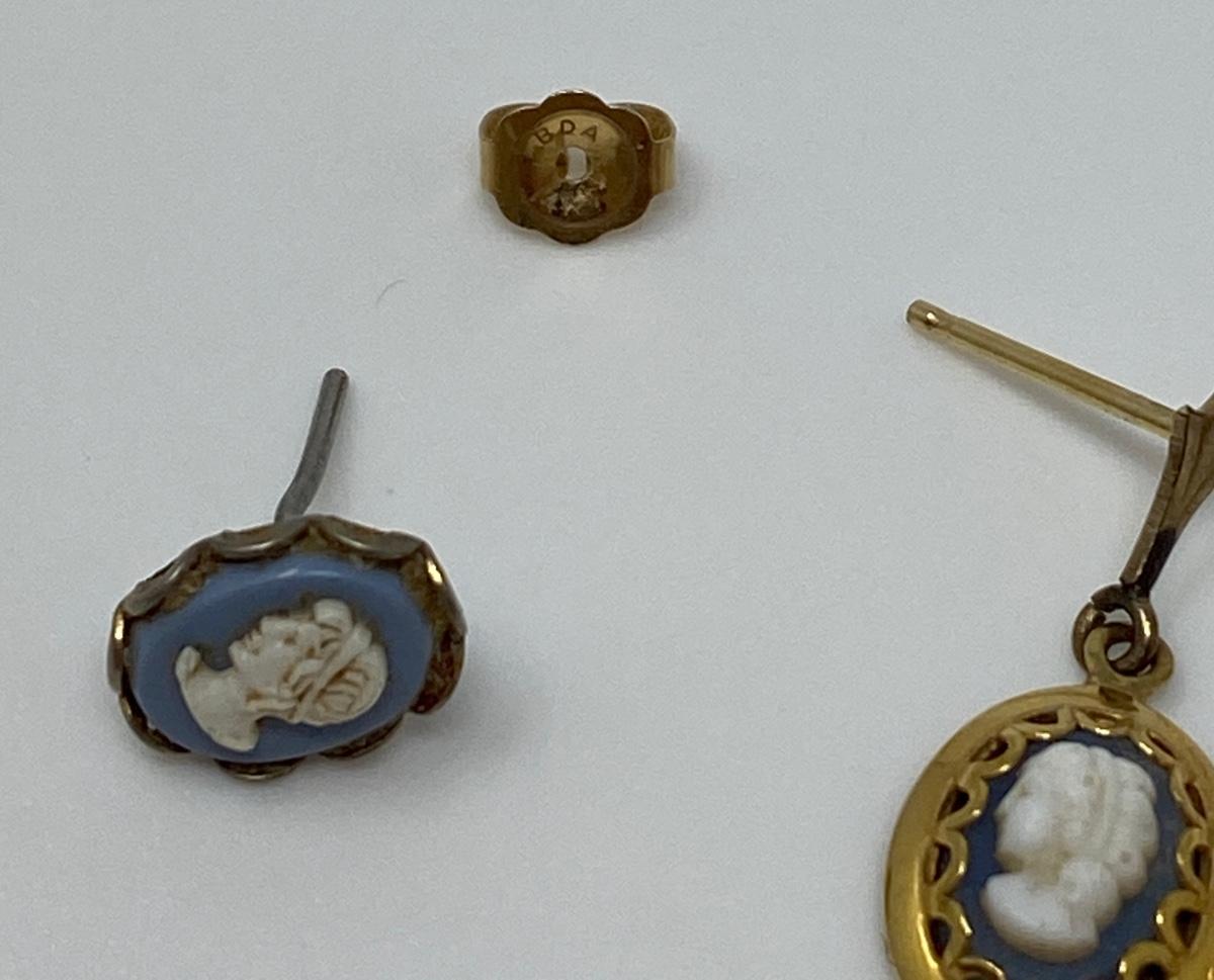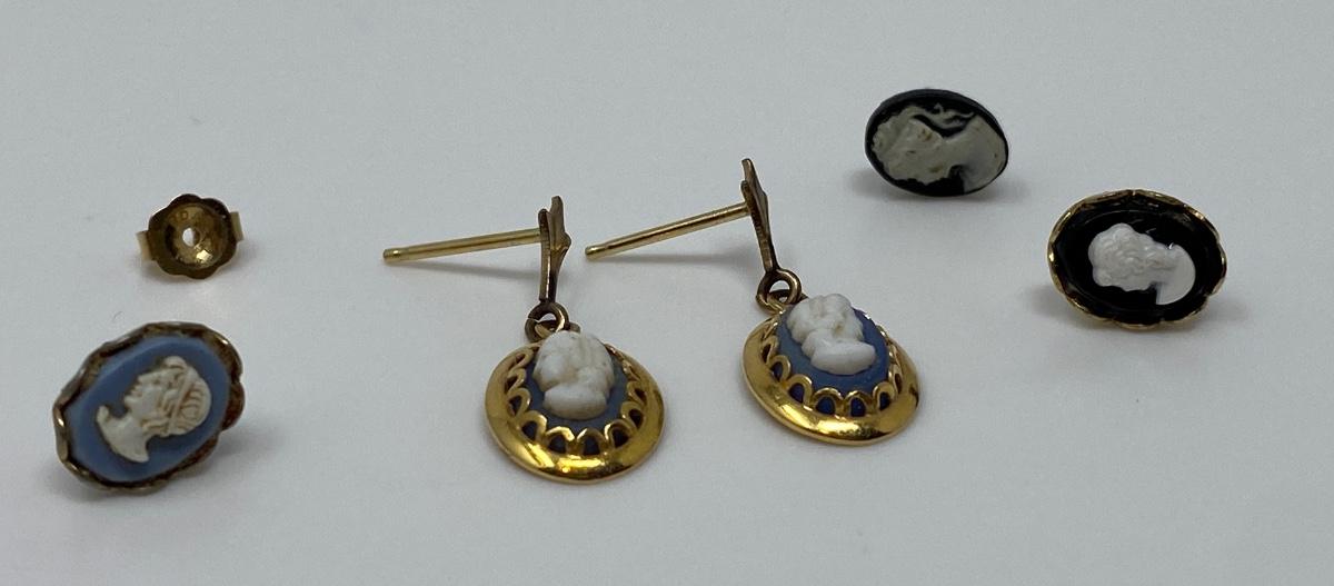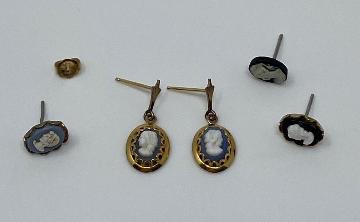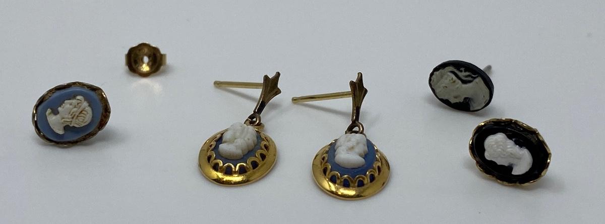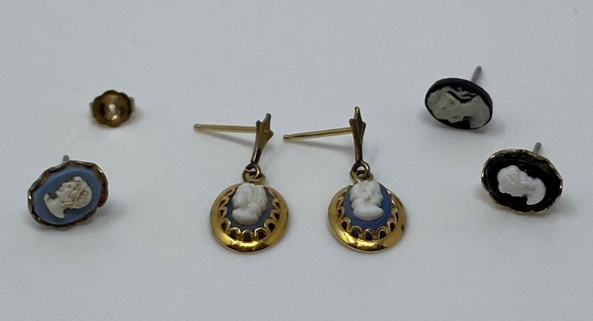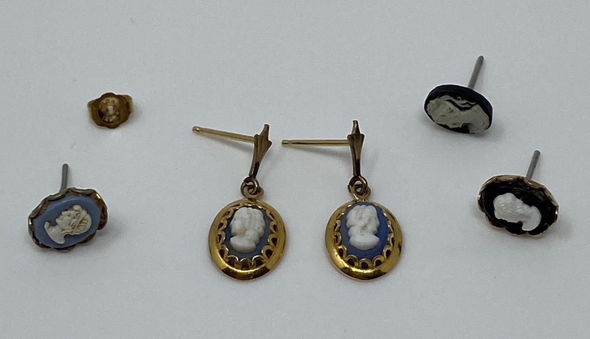 Pair of Cameo Dangle Earrings, Single Cameo Earrings, and One 14KT Gold Backing