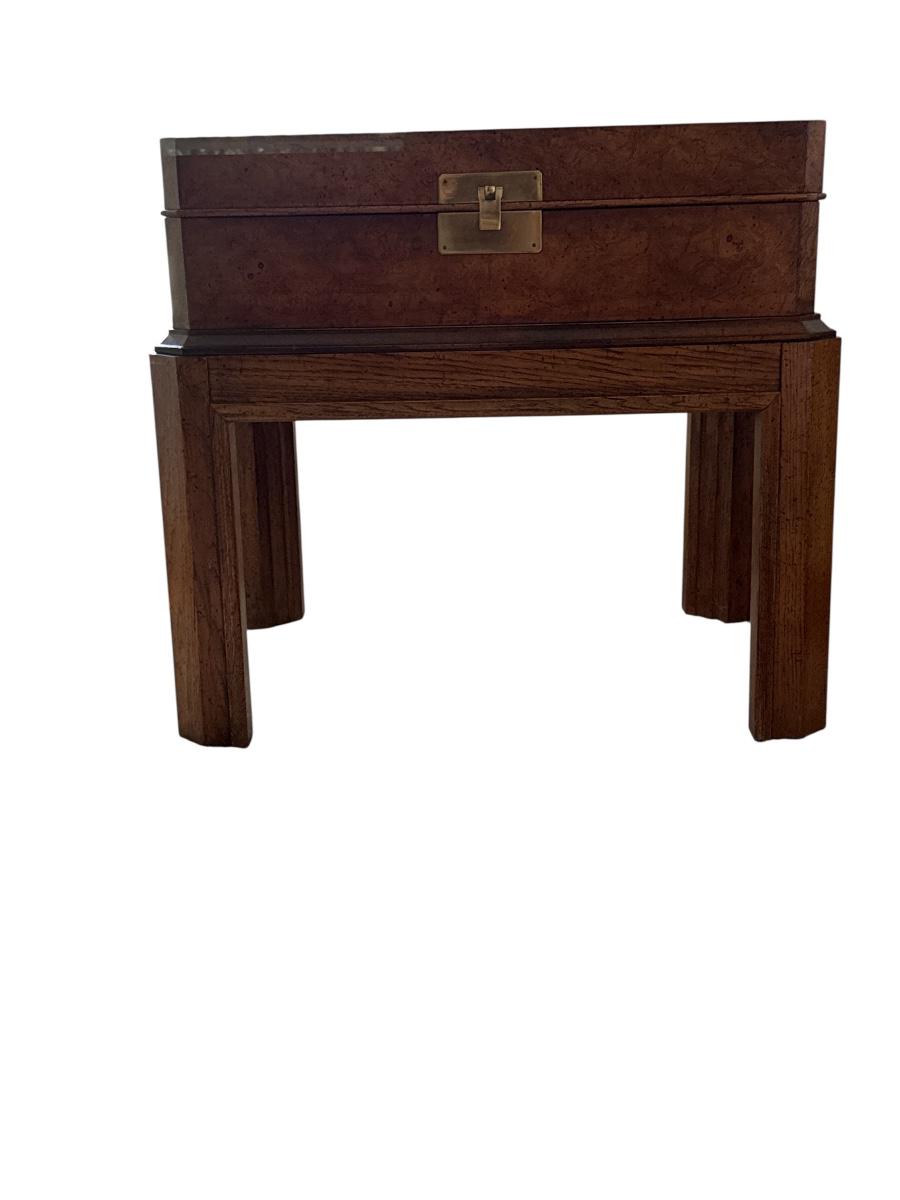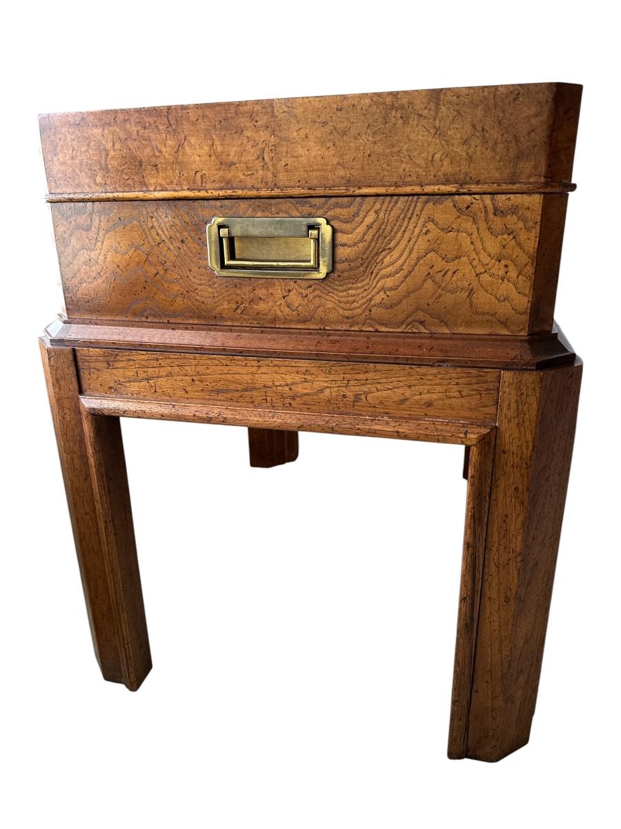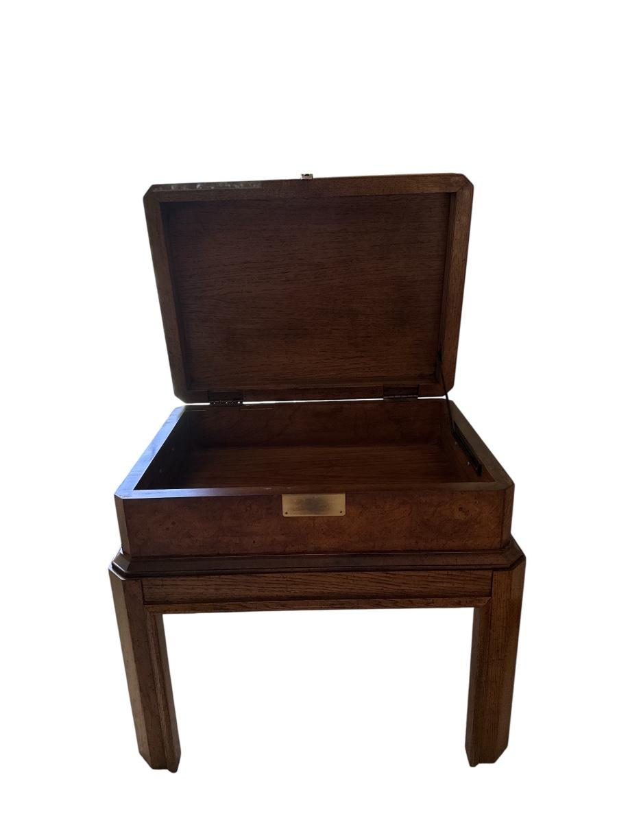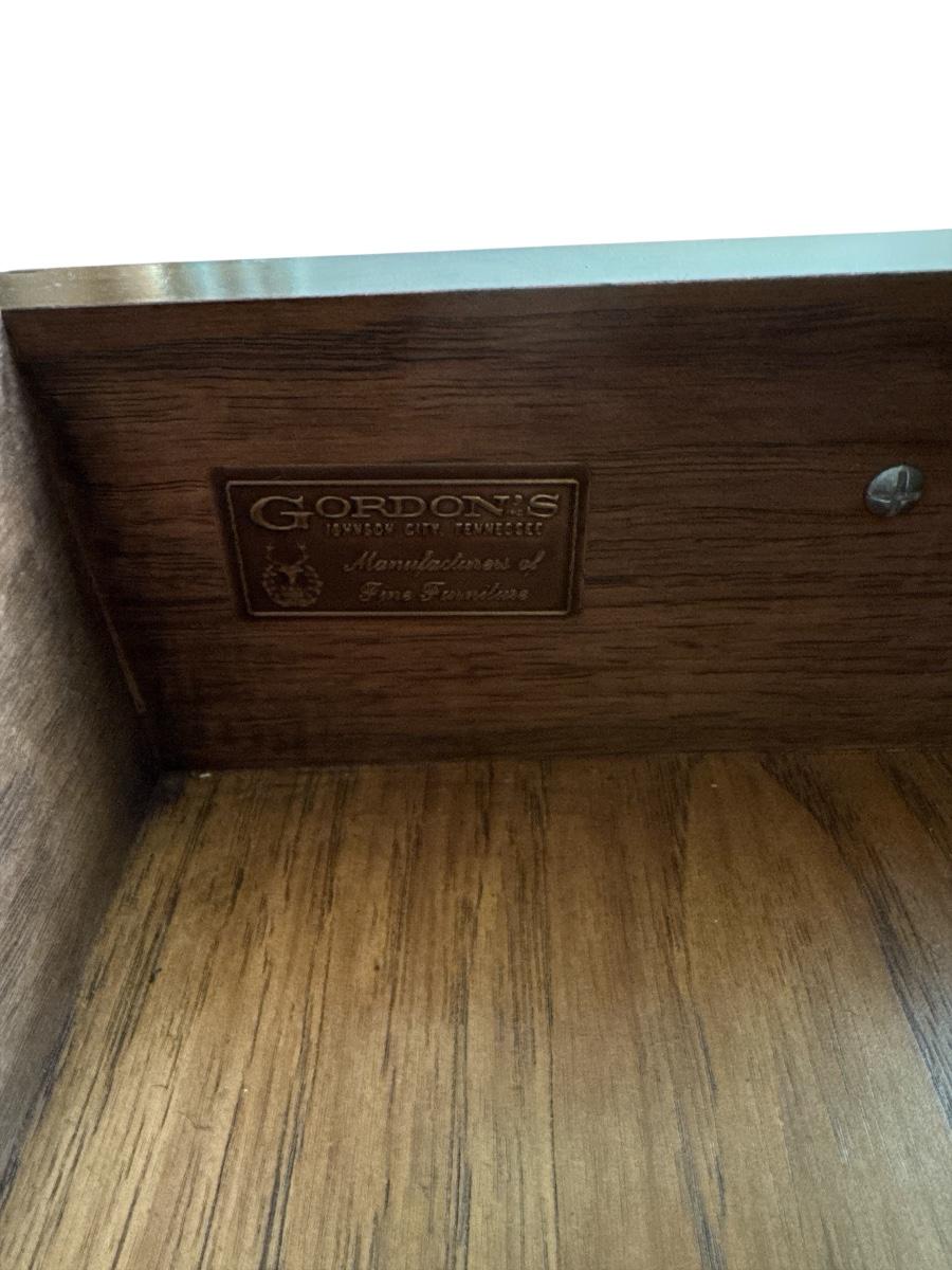 Handsome pair of vintage side tables by Gordon’s Furniture of Johnson City, Tennessee. These tables feature a campaign-style design with brass hardware, rich burlwood veneer, and angular legs. Each has a lift-top lid for hidden storage, making them both stylish and functional. The interior is stamped with the Gordon’s maker’s mark, known for quality craftsmanship.