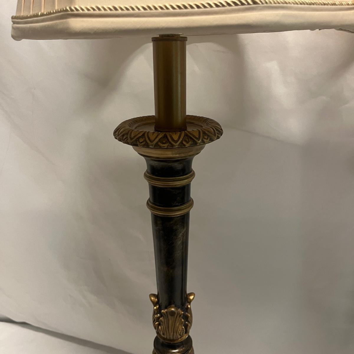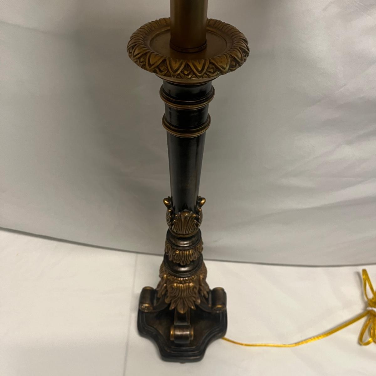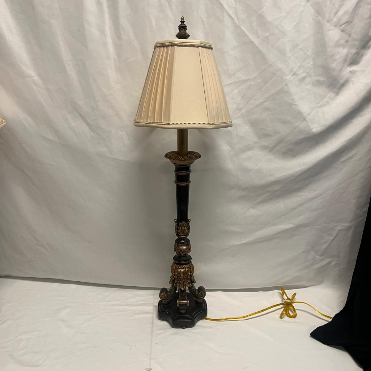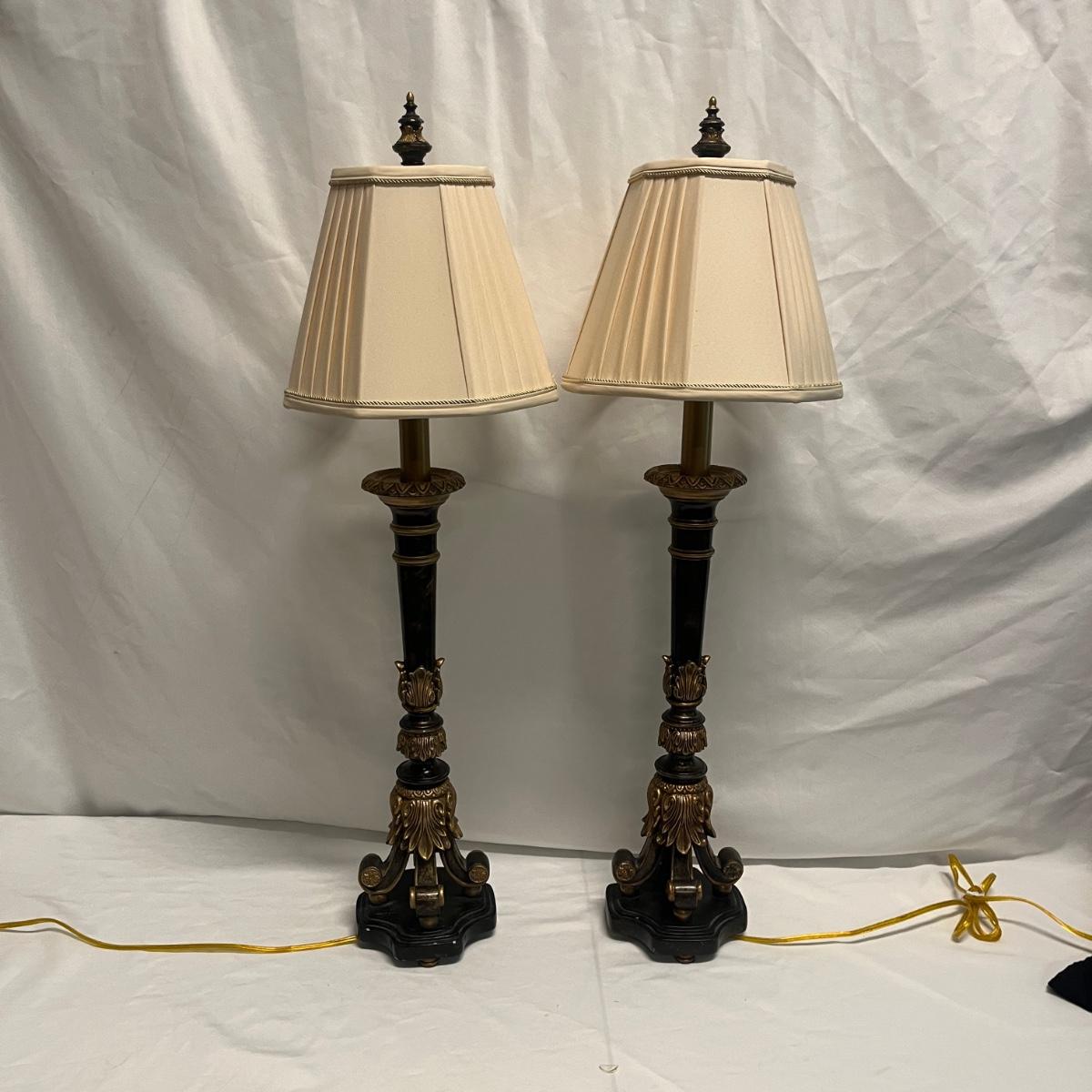 This pair of candlestick style lamps are made from composite resin and both powered on when plugged in. They have single on/off switch and dark ivory shades. Lamps measure 11”D x 33”H (37”H with shades).