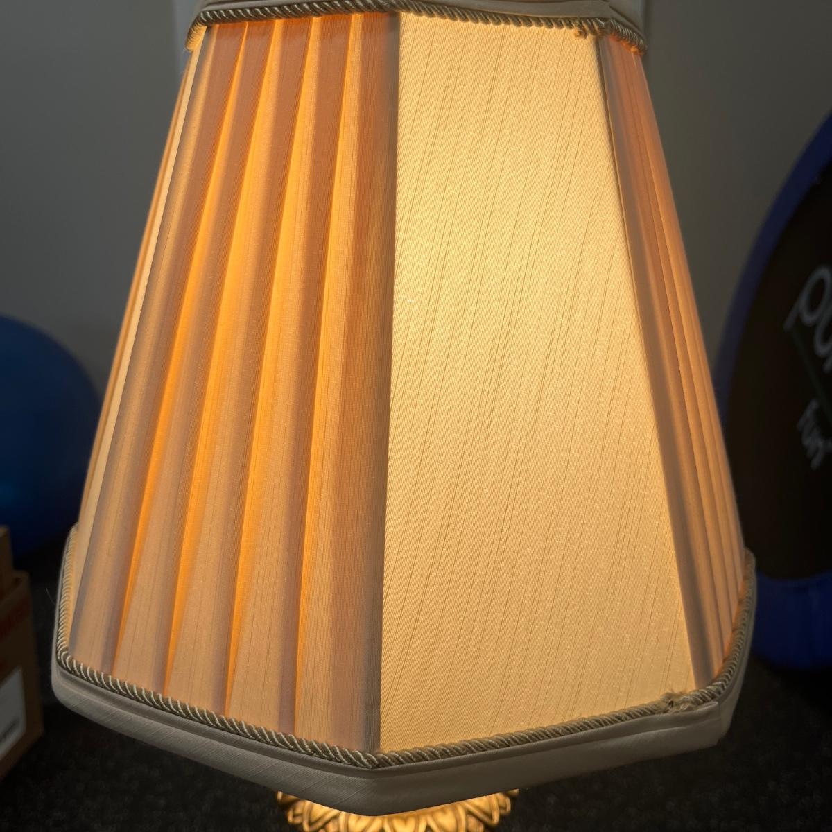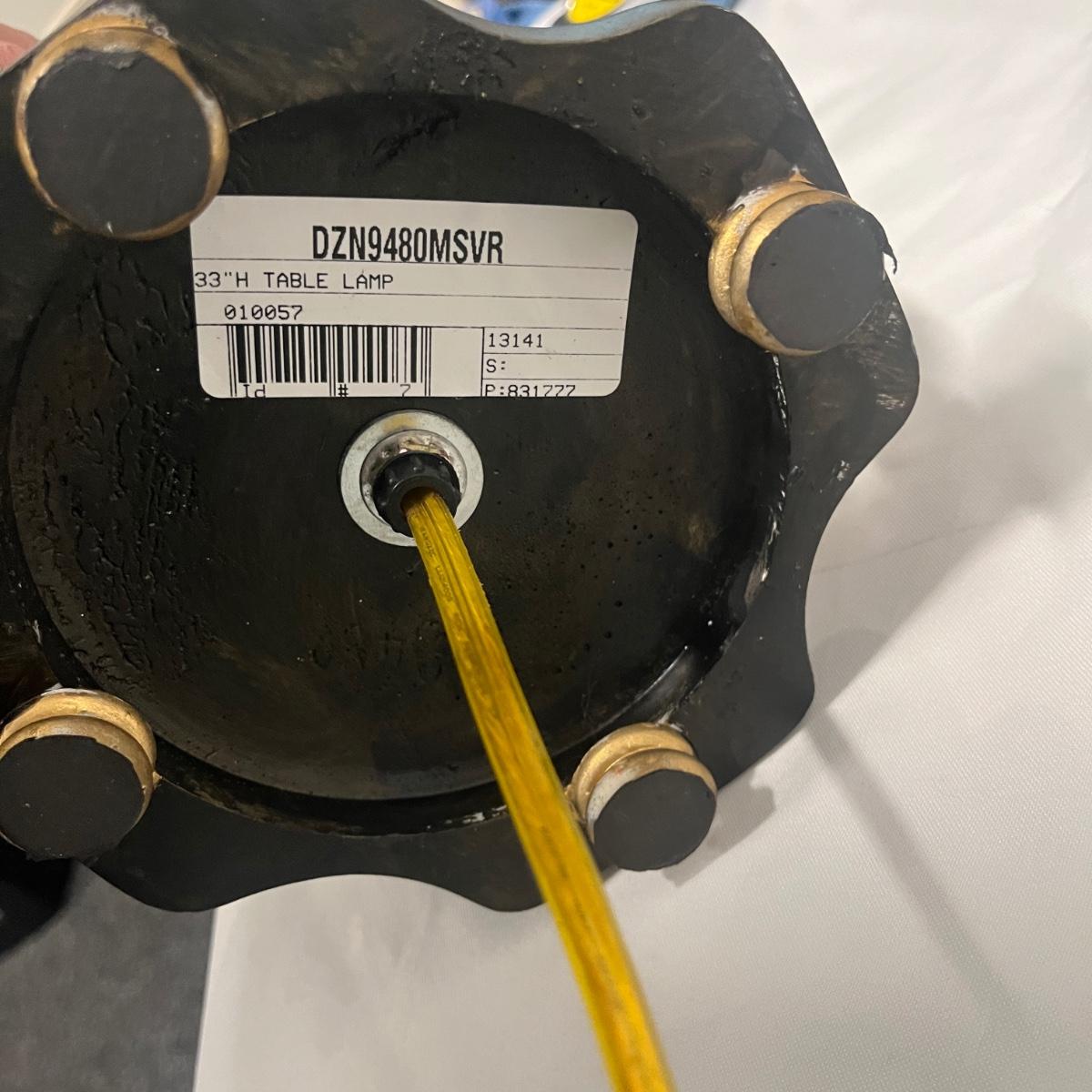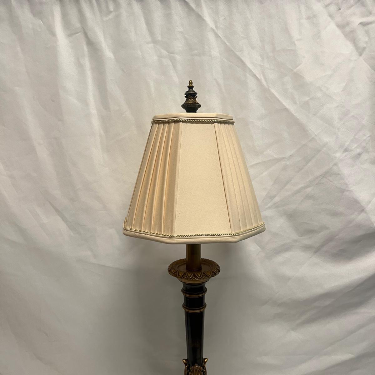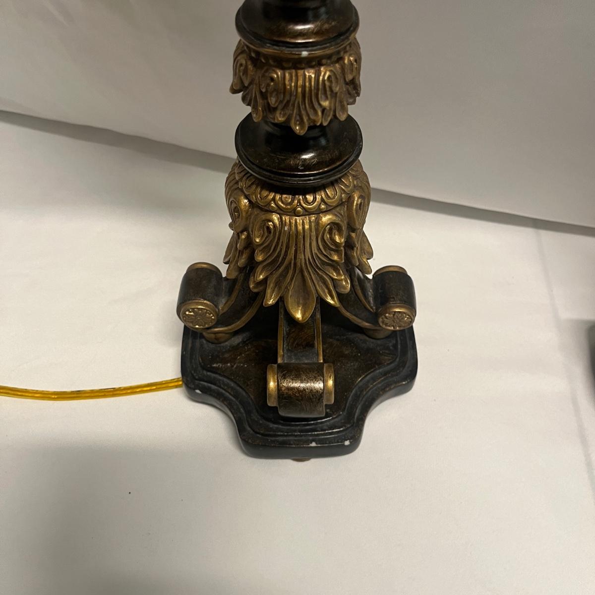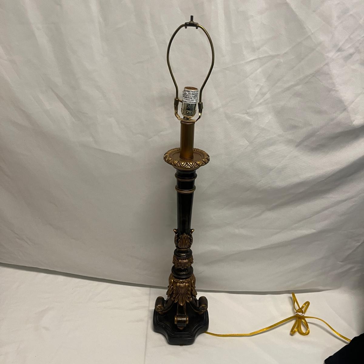 This pair of candlestick style lamps are made from composite resin and both powered on when plugged in. They have single on/off switch and dark ivory shades. Lamps measure 11”D x 33”H (37”H with shades).