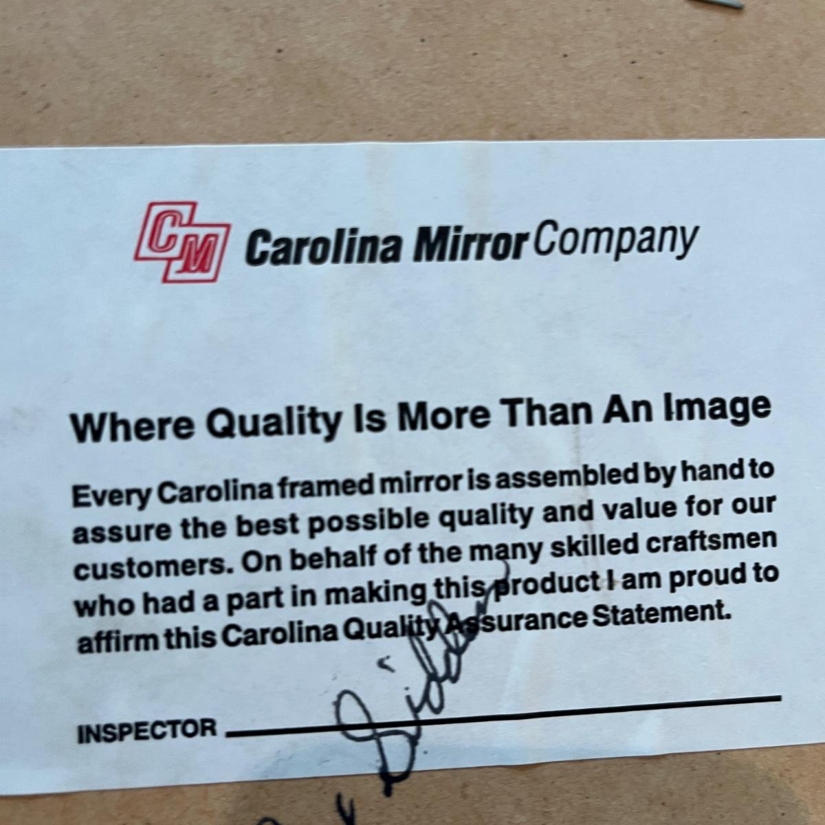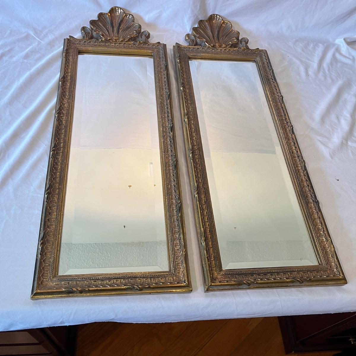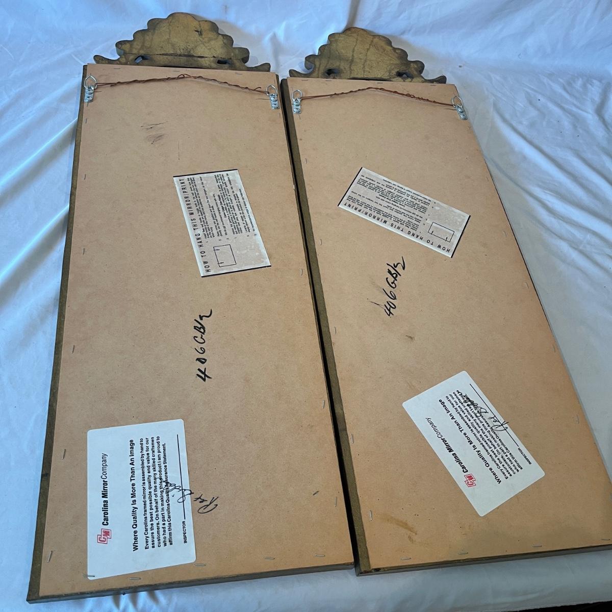 Lot includes a pair of Carolina Mirror Company wooden framed beveled mirrors that measure 10.5” x 31.5”H.