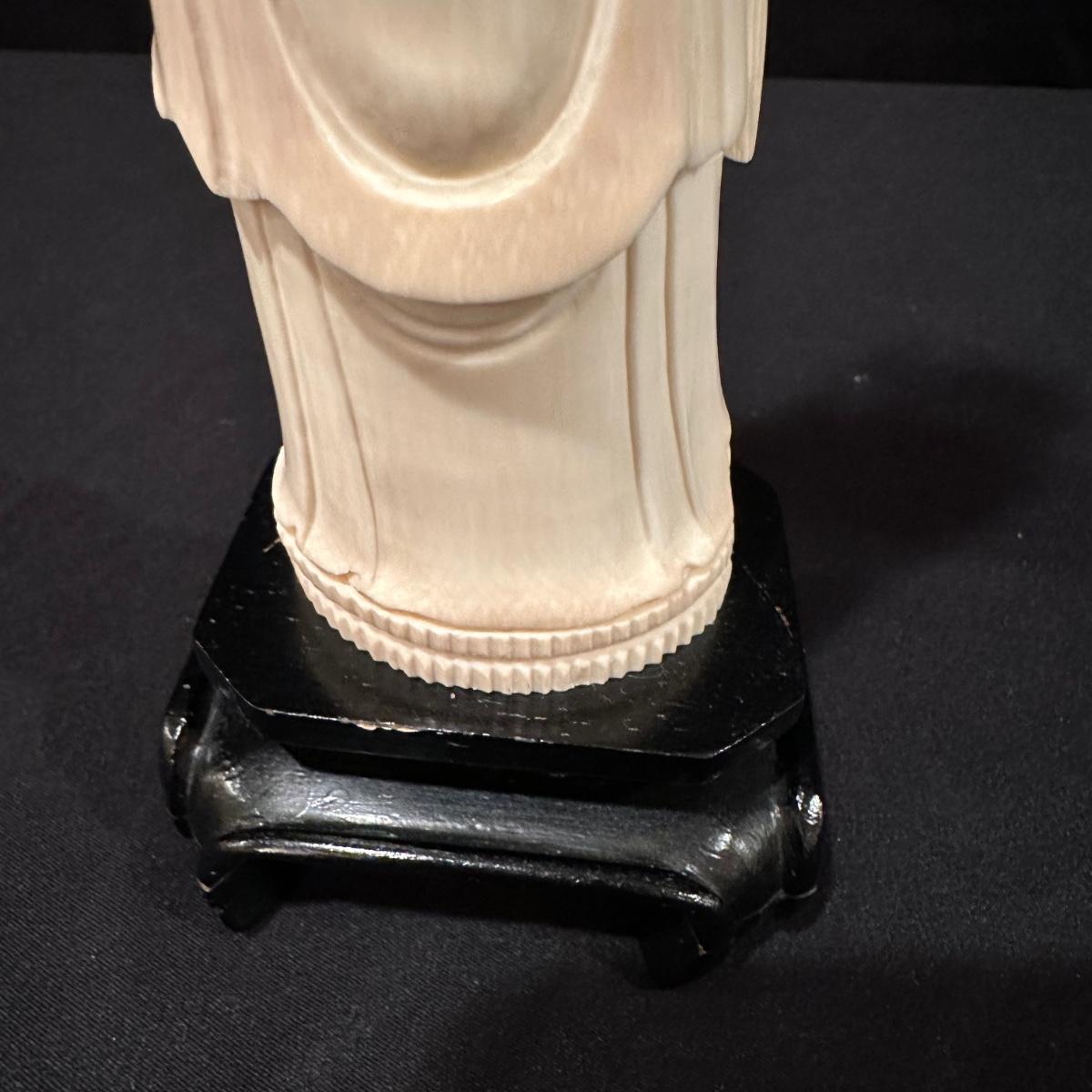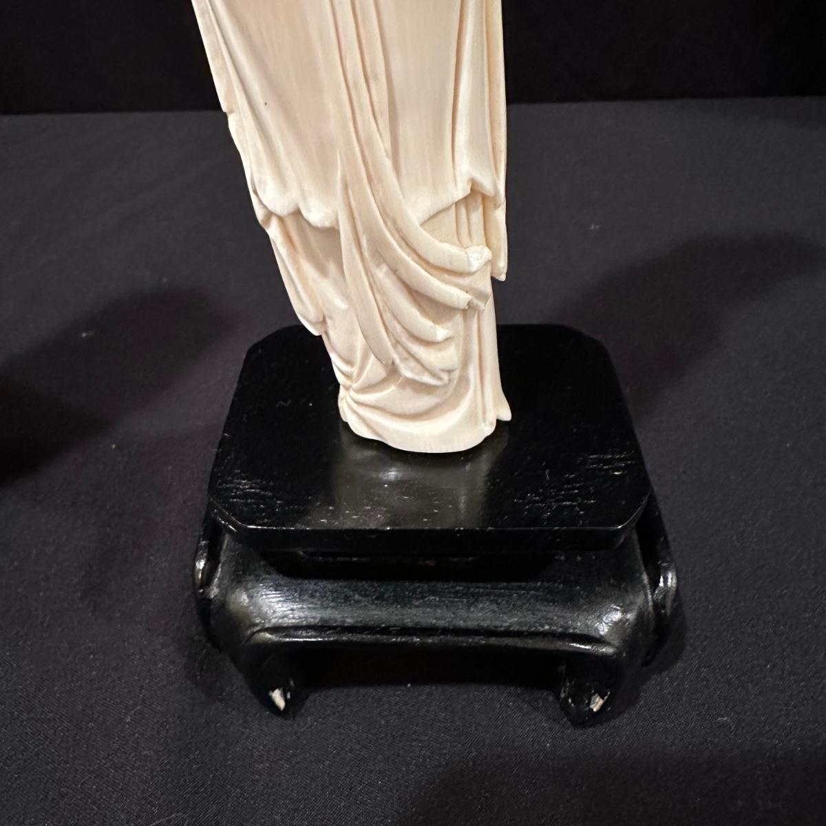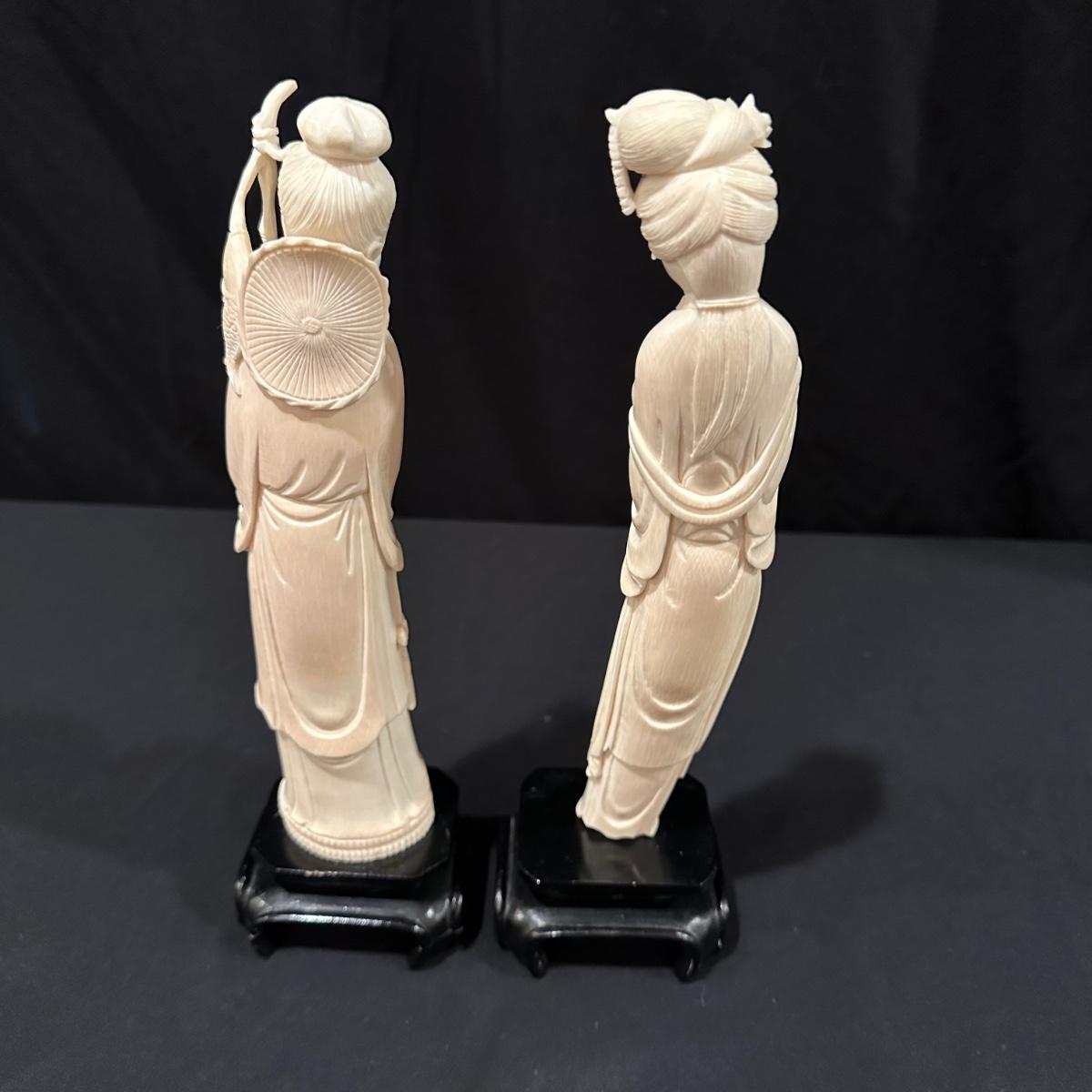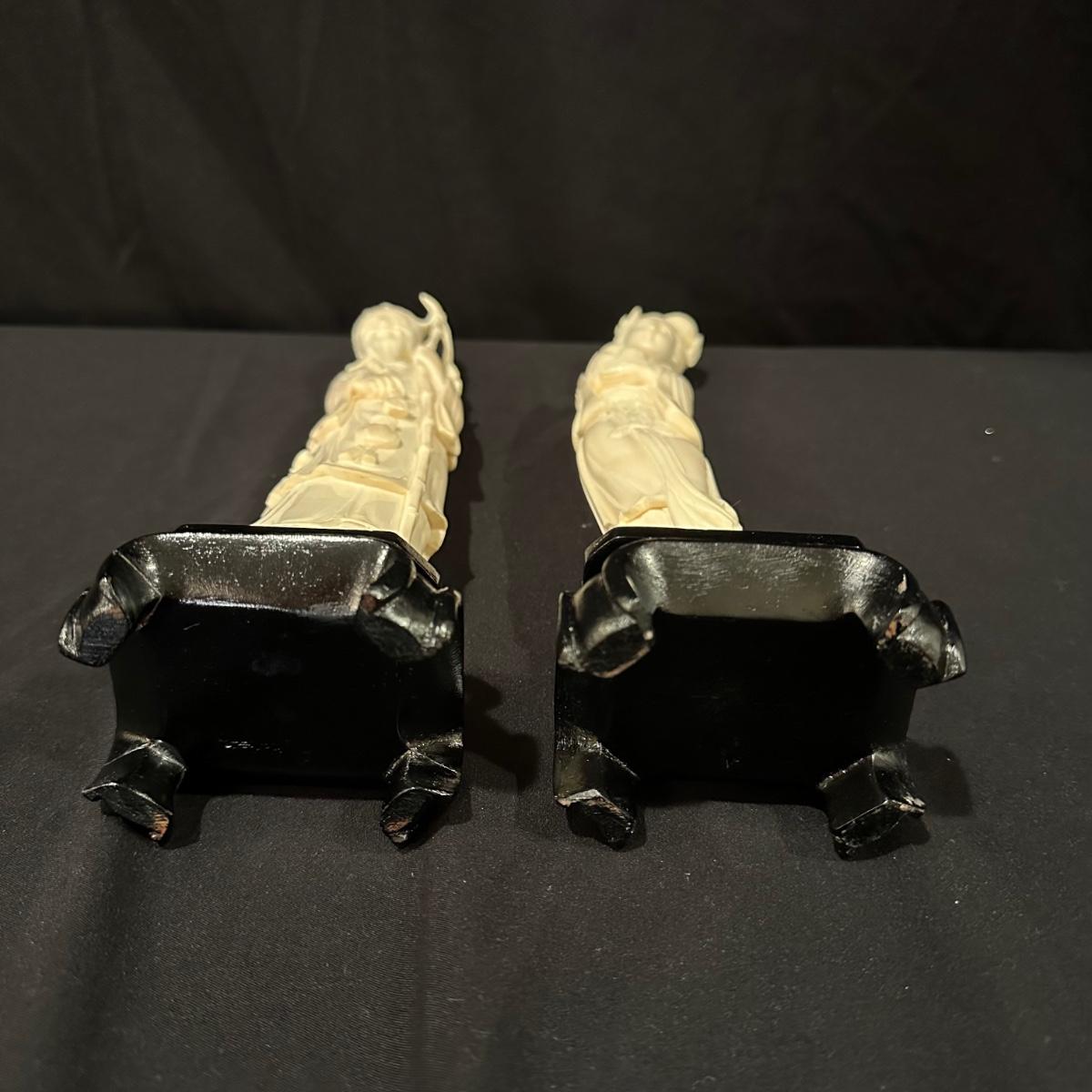 Pair of what to appear to be carved of a bone like material figurines attached to wooden stands. Male figurine is slightly loose.