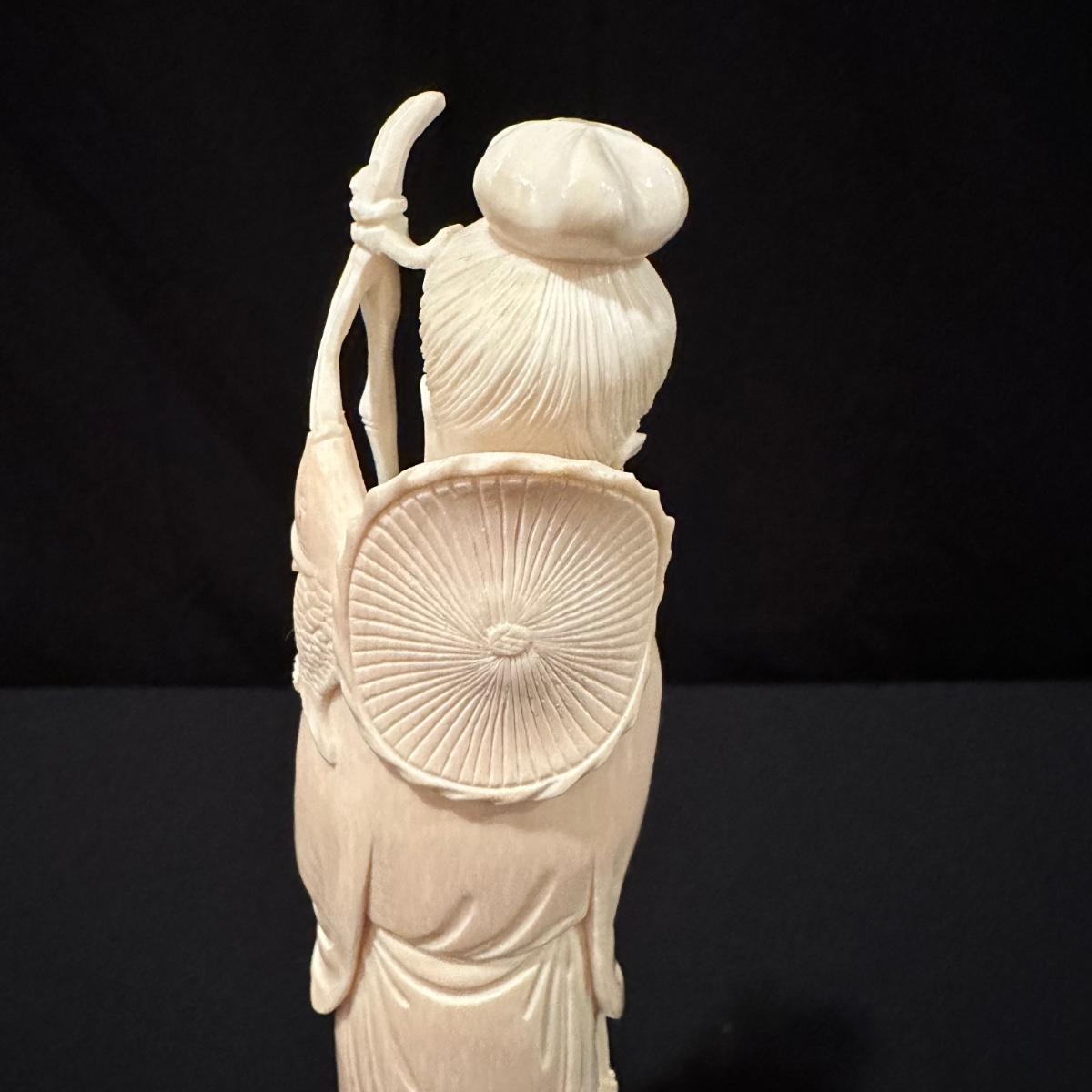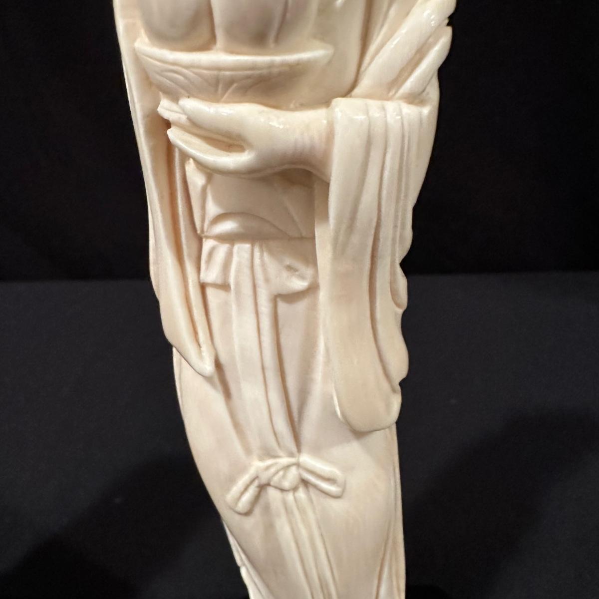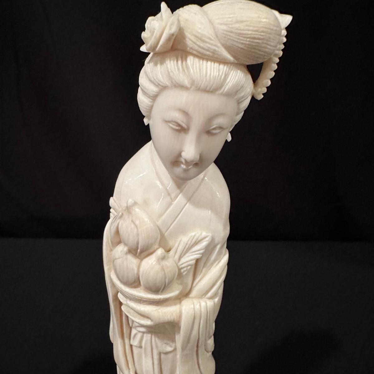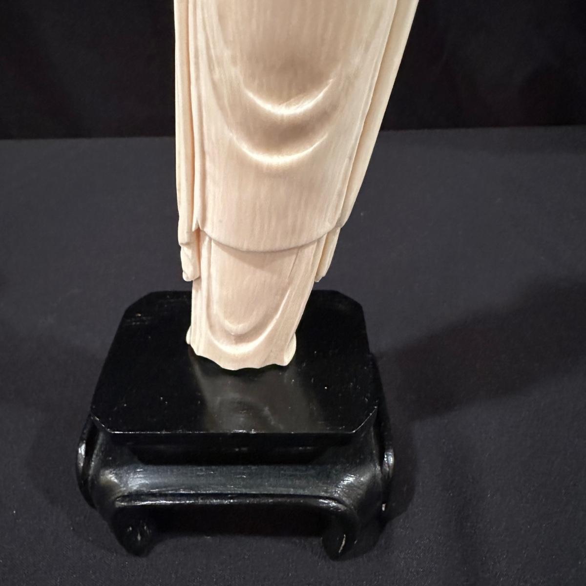 Pair of what to appear to be carved of a bone like material figurines attached to wooden stands. Male figurine is slightly loose.