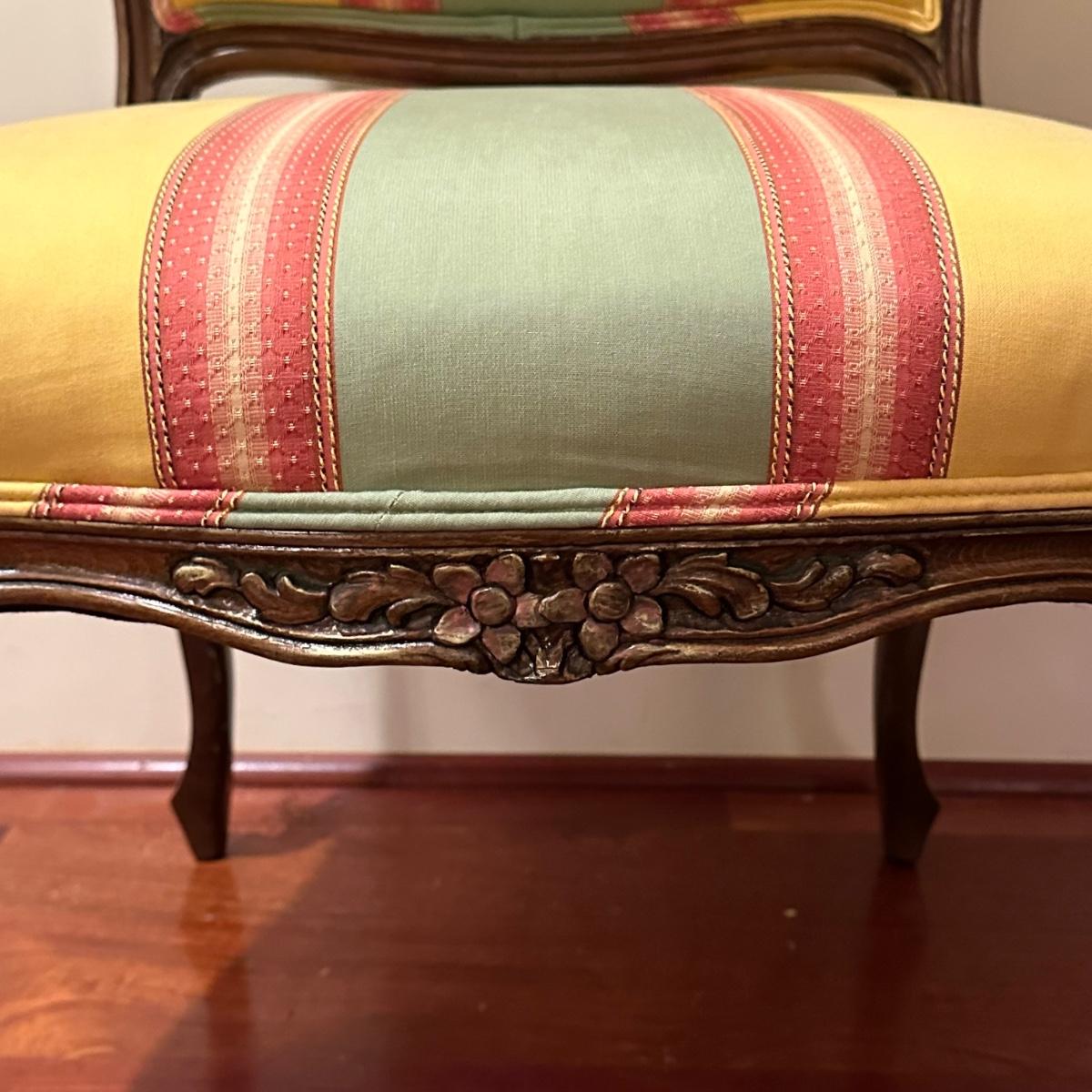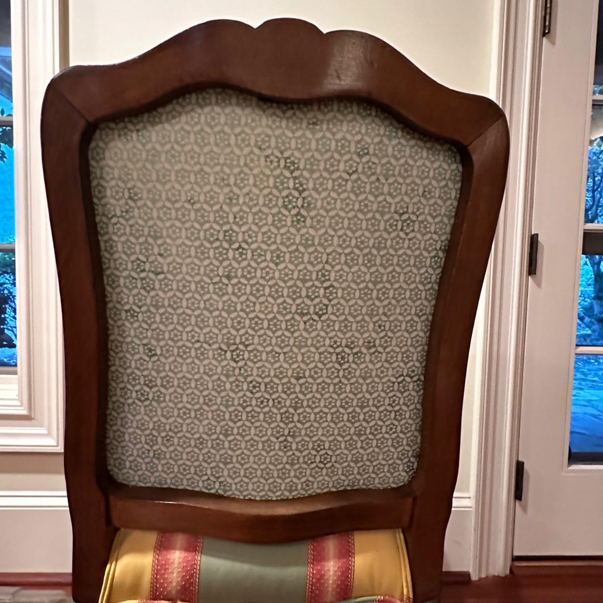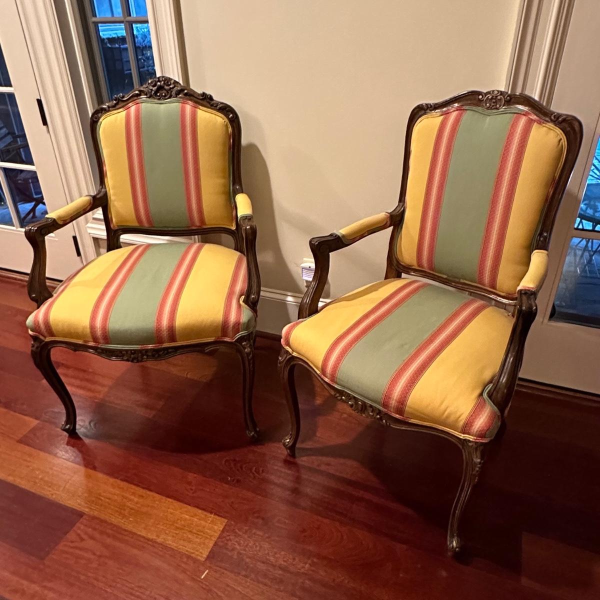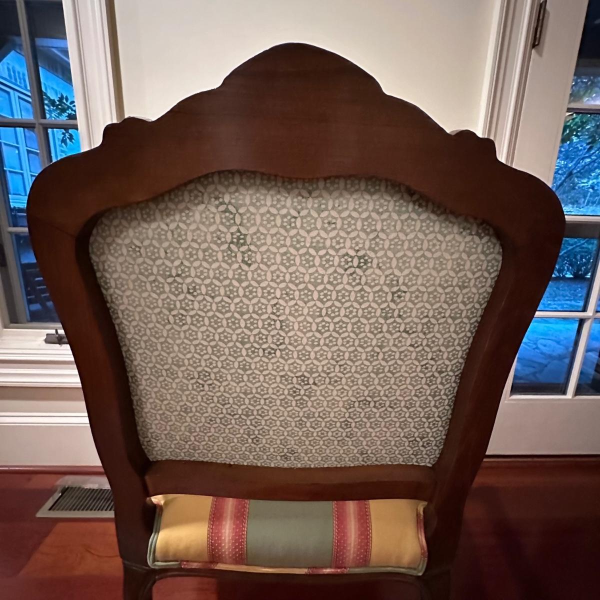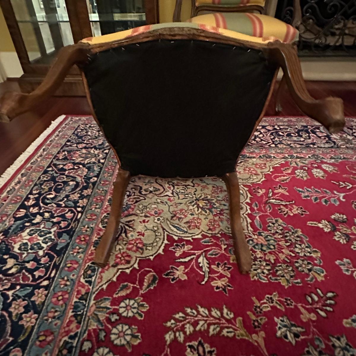 Pair of carved, upholstered side chairs. The carving on each chair is slightly different. They both measure 22.5” x 20.5” x 40”H. Seat height is 19.5”. Local pickup only.